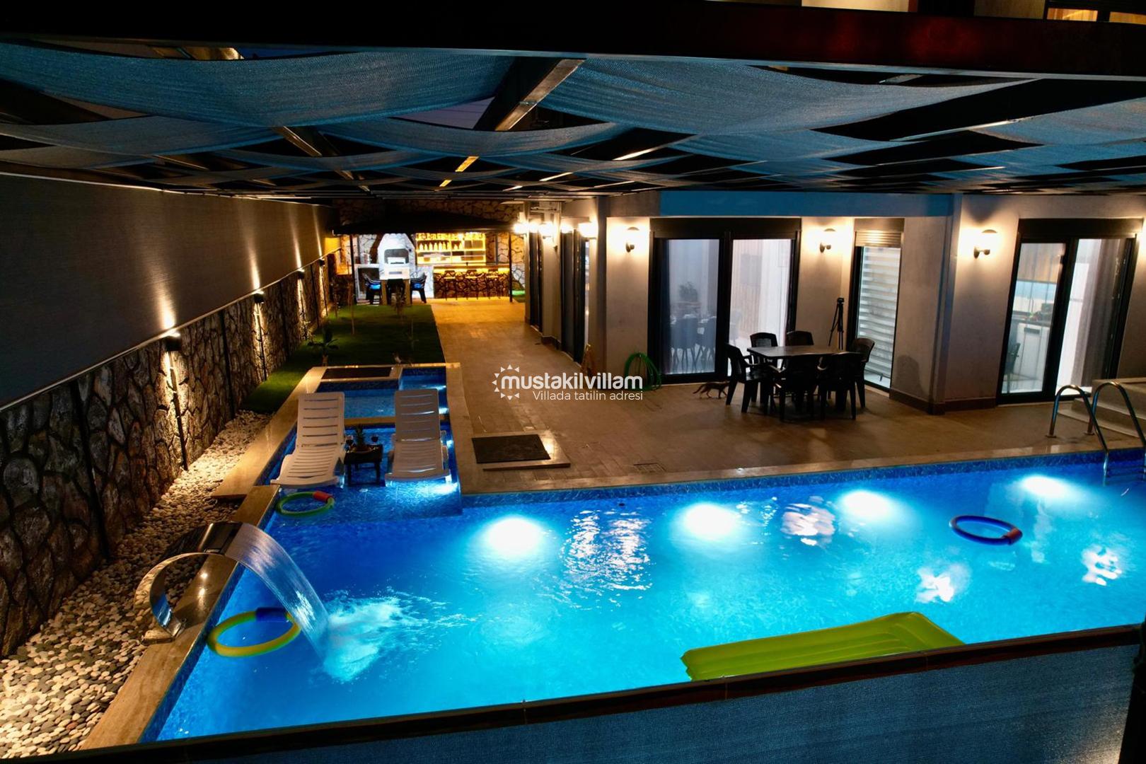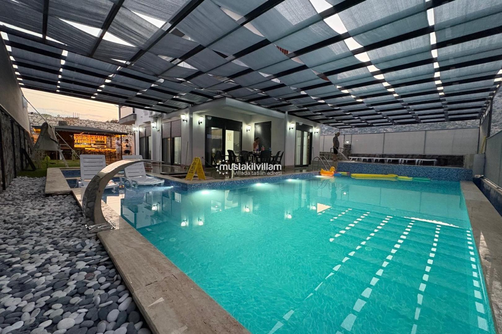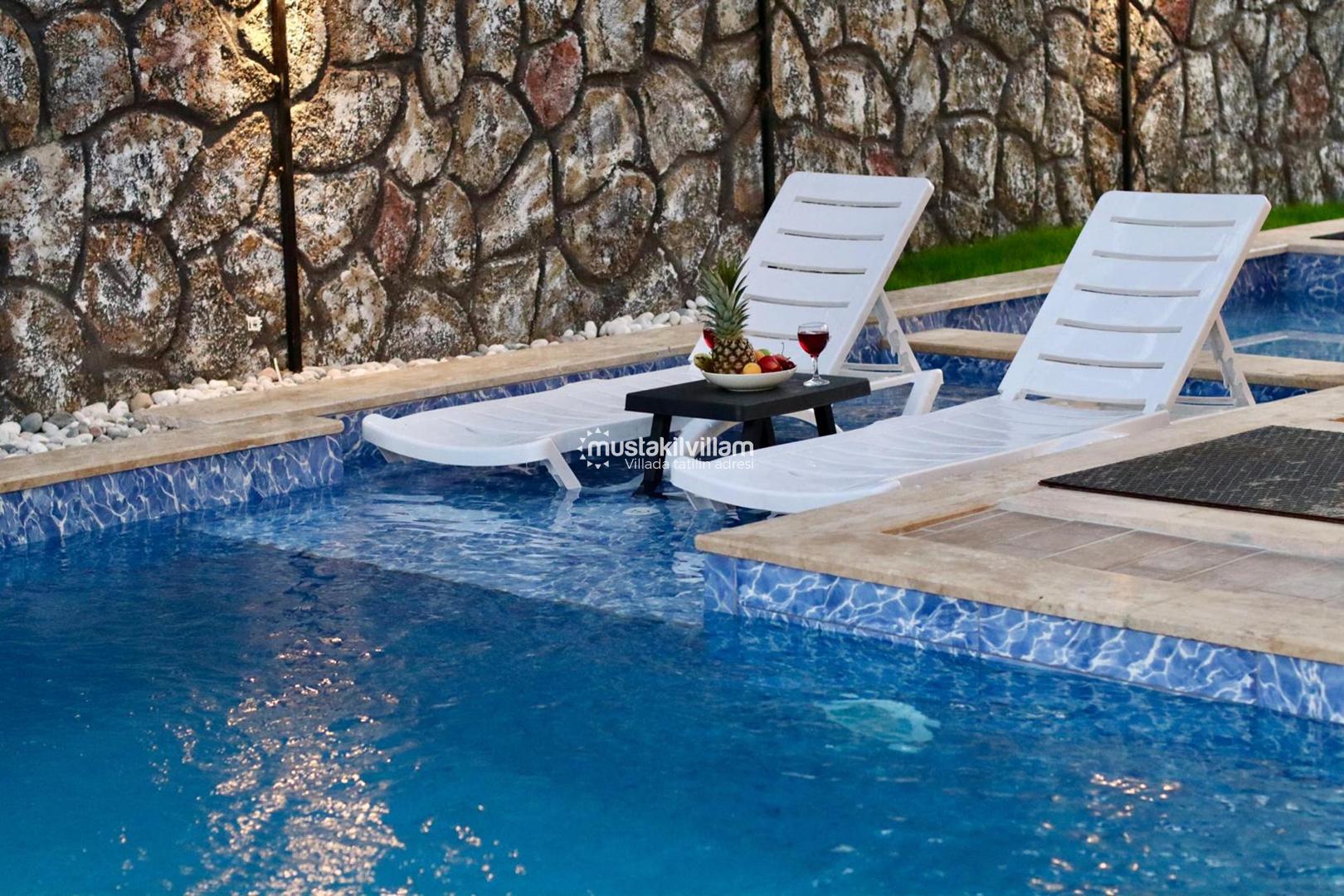 Villa İstefani’nin en öne çıkan özelliklerinden biri de özel ısıtmalı yüzme havuzudur. 5.5 metre genişliğinde, 10.5 metre uzunluğunda ve 1.50 metre derinliğinde olan havuz, hem yüzmek hem de serinlemek isteyen misafirler için ideal bir alan sunmaktadır. Havuzun ısıtmalı olması sayesinde sadece yaz aylarında değil, bahar ve sonbahar dönemlerinde de rahatlıkla kullanılabilmesi büyük bir avantaj sağlamaktadır. Bu özellik, sezon dışı villa tatili planlayan misafirler için önemli bir tercih sebebidir.(Isıtma bedeli günlük 1500 TL dir)