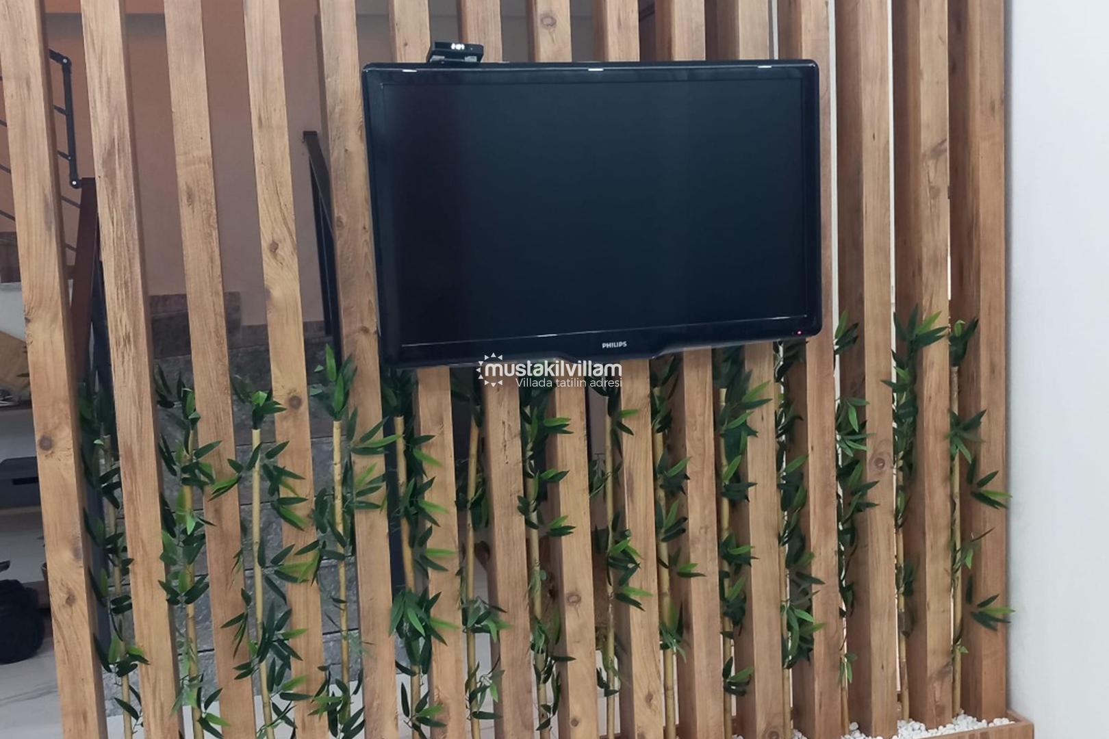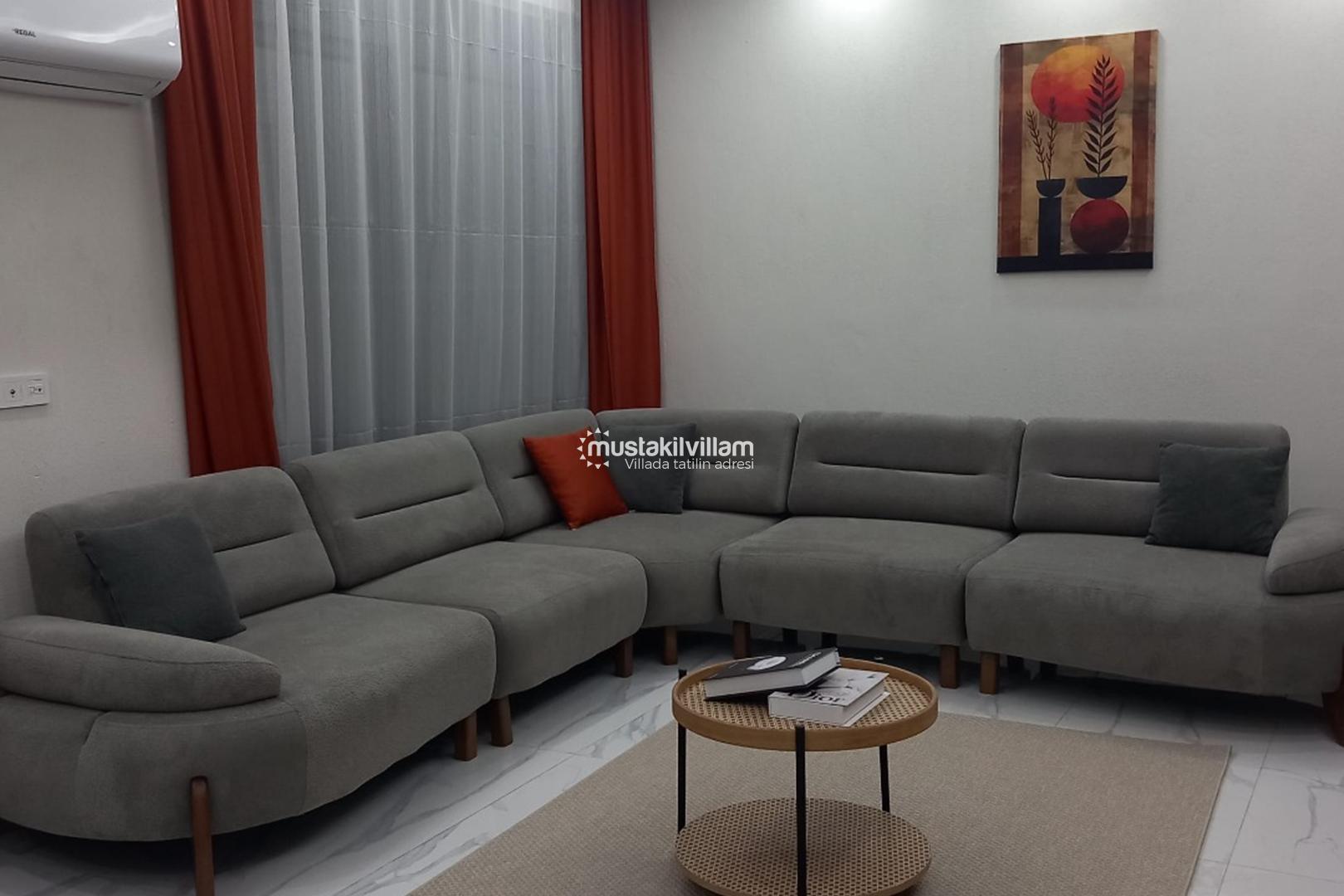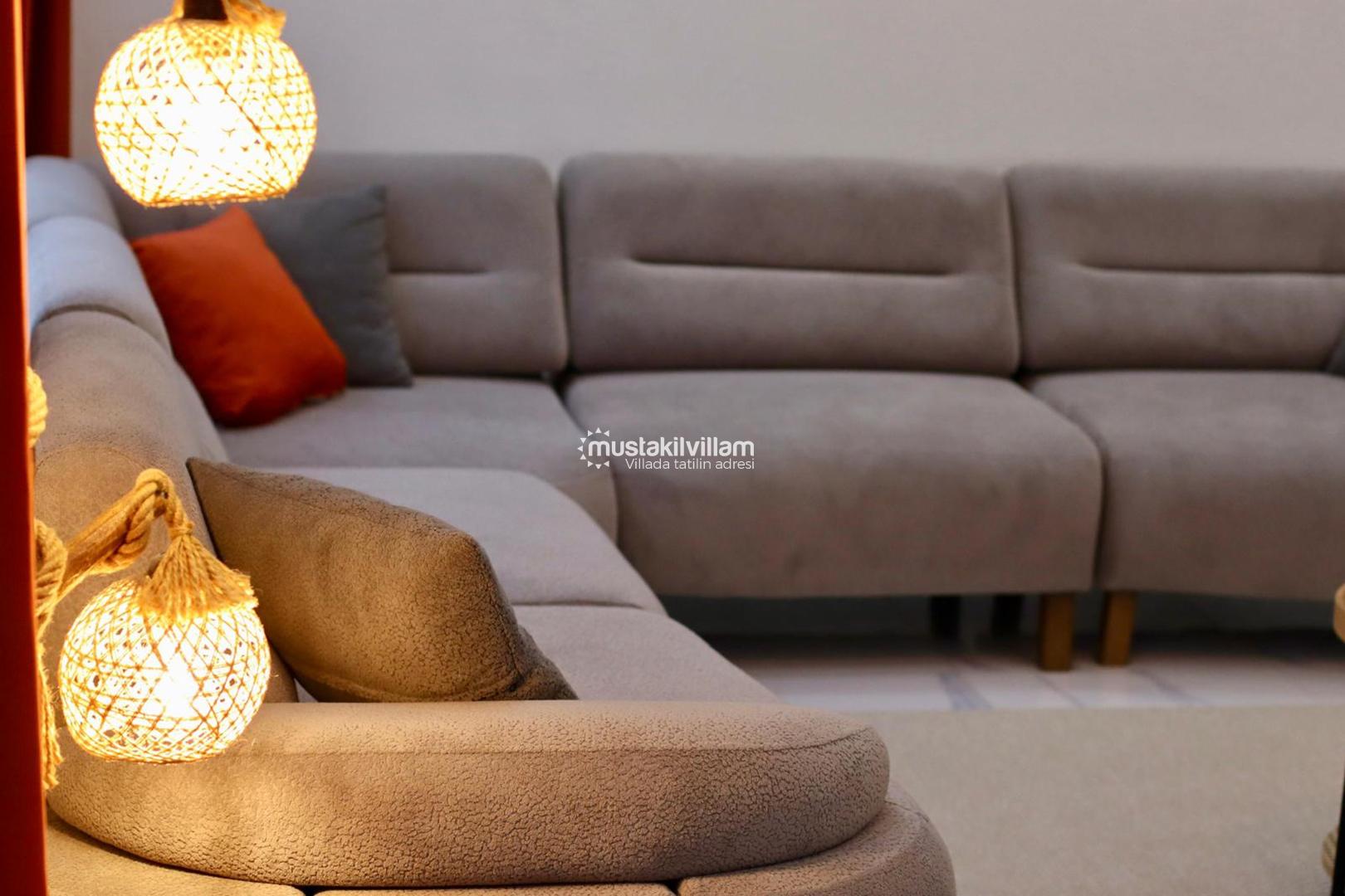 Villanın geniş ve aydınlık salonu, modern tasarım anlayışıyla döşenmiş olup, rahat oturma grupları sayesinde keyifli vakit geçirmenize olanak tanır. Ailenizle ya da arkadaşlarınızla birlikte film izleyebilir, sohbet edebilir ya da sadece dinlenmenin keyfini çıkarabilirsiniz. Açık plan mutfak ise tatil boyunca ihtiyaç duyabileceğiniz tüm ekipmanlarla donatılmıştır. Buzdolabı, fırın, ocak, bulaşık makinesi ve çeşitli mutfak gereçleri sayesinde kendi yemeklerinizi hazırlayabilir, sevdiklerinizle birlikte keyifli sofralar kurabilirsiniz.