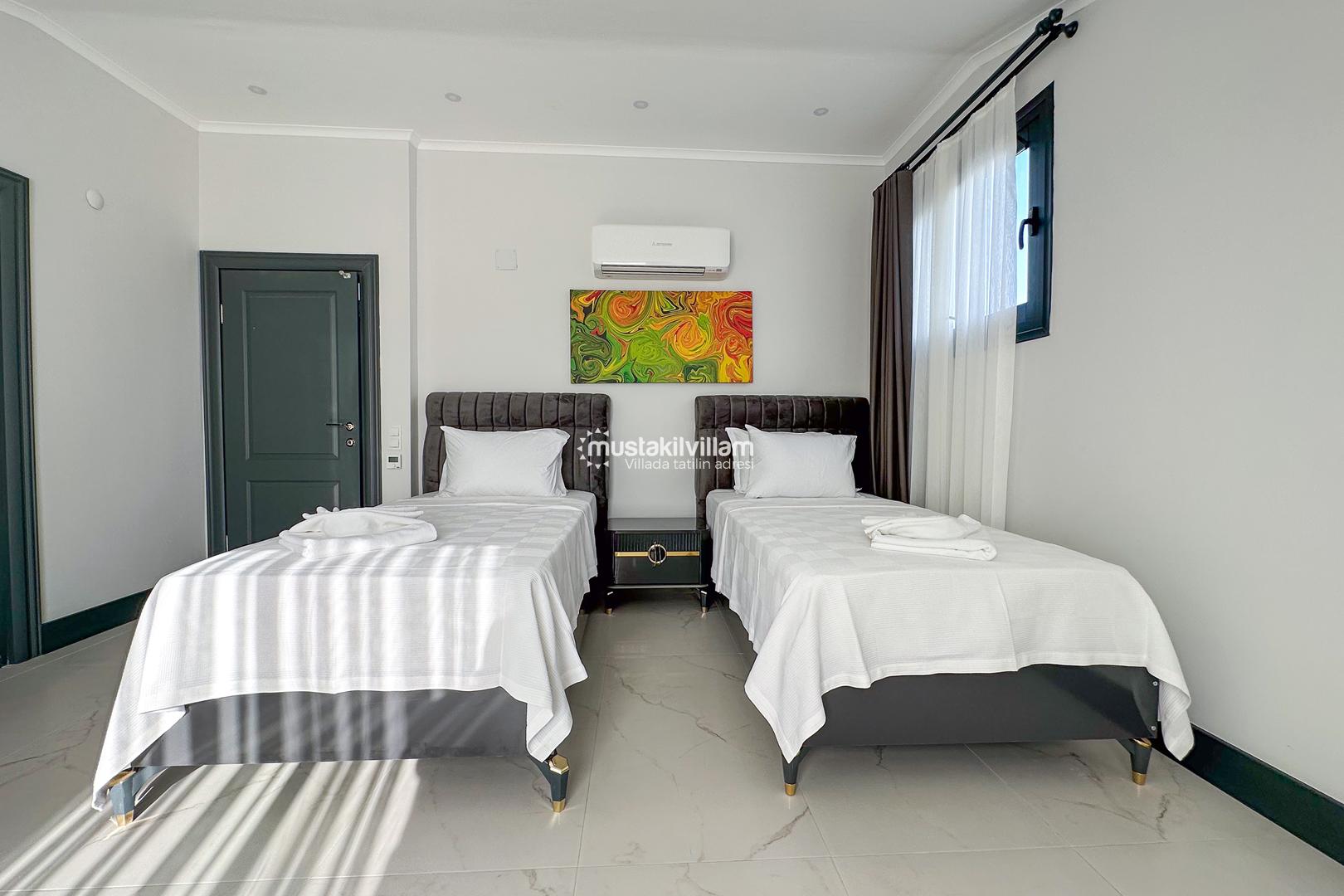 2 adet tek kişilik yatak, Komodin, Klima, Elbise dolabı