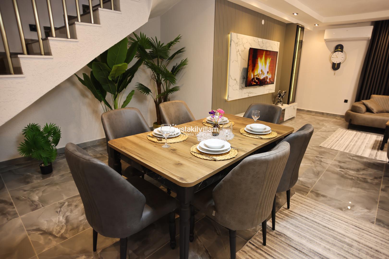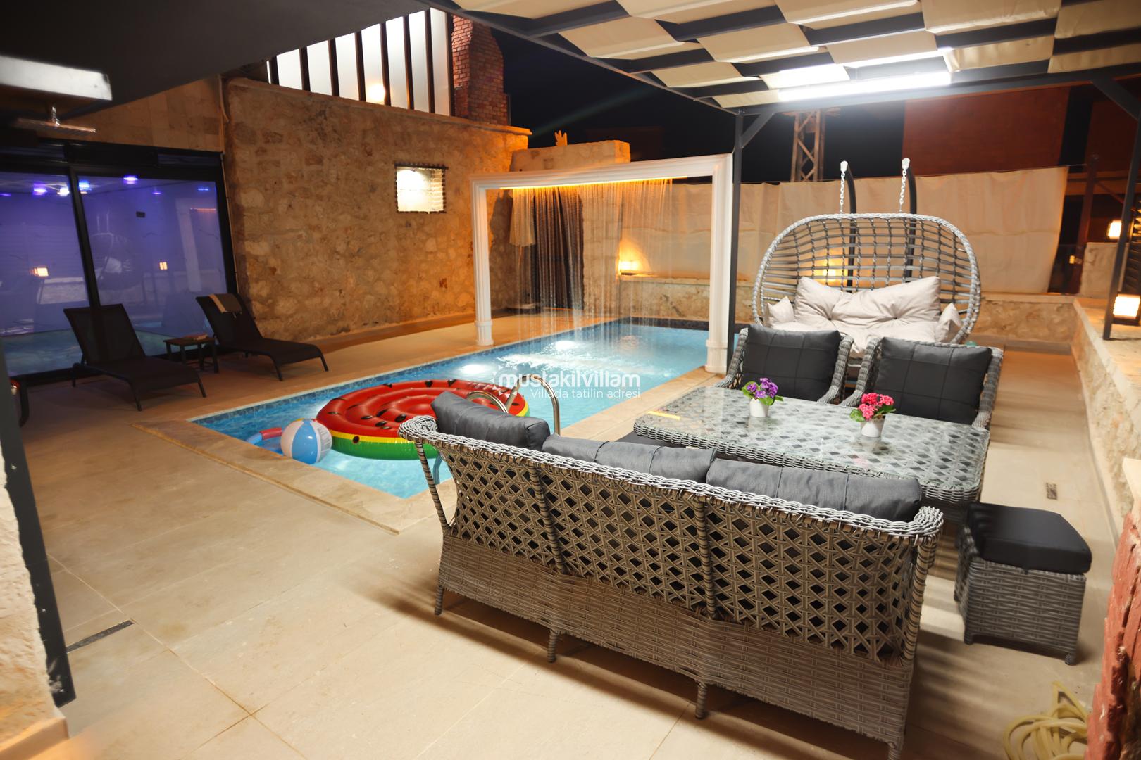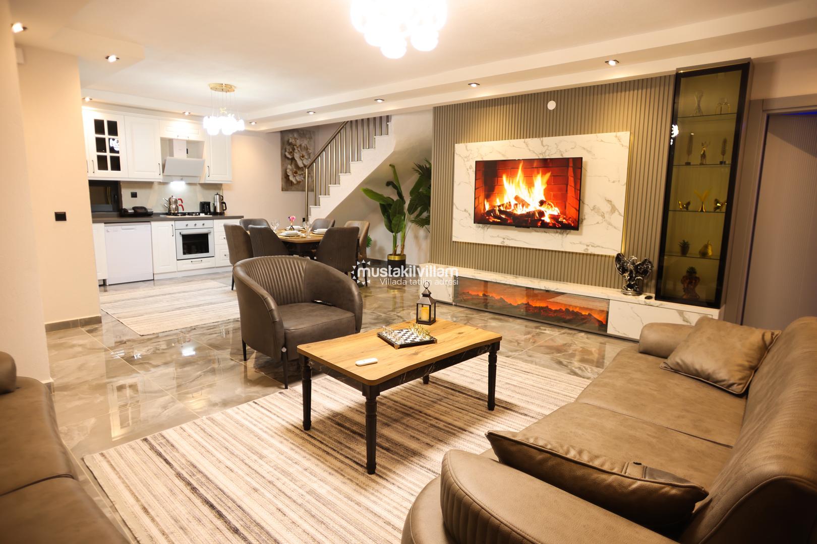 Kapalı havuz talep üzerine ısıtılabilir; ısıtma hizmeti için günlük 1.000 TL ücret uygulanır. Bu özellik, özellikle kış aylarında veya serin havalarda tatil yapmak isteyenler için büyük bir avantaj sağlar. Villanın tüm yaşam alanları, konfor ve estetik ön planda tutularak tasarlanmıştır.