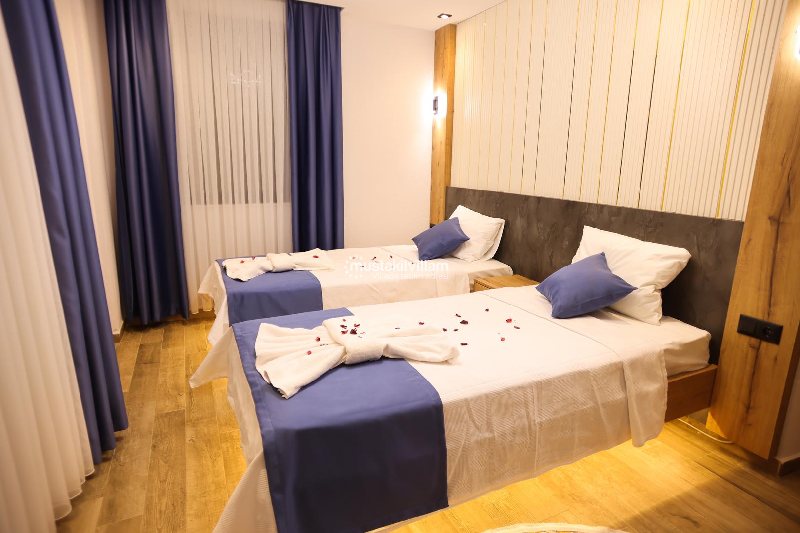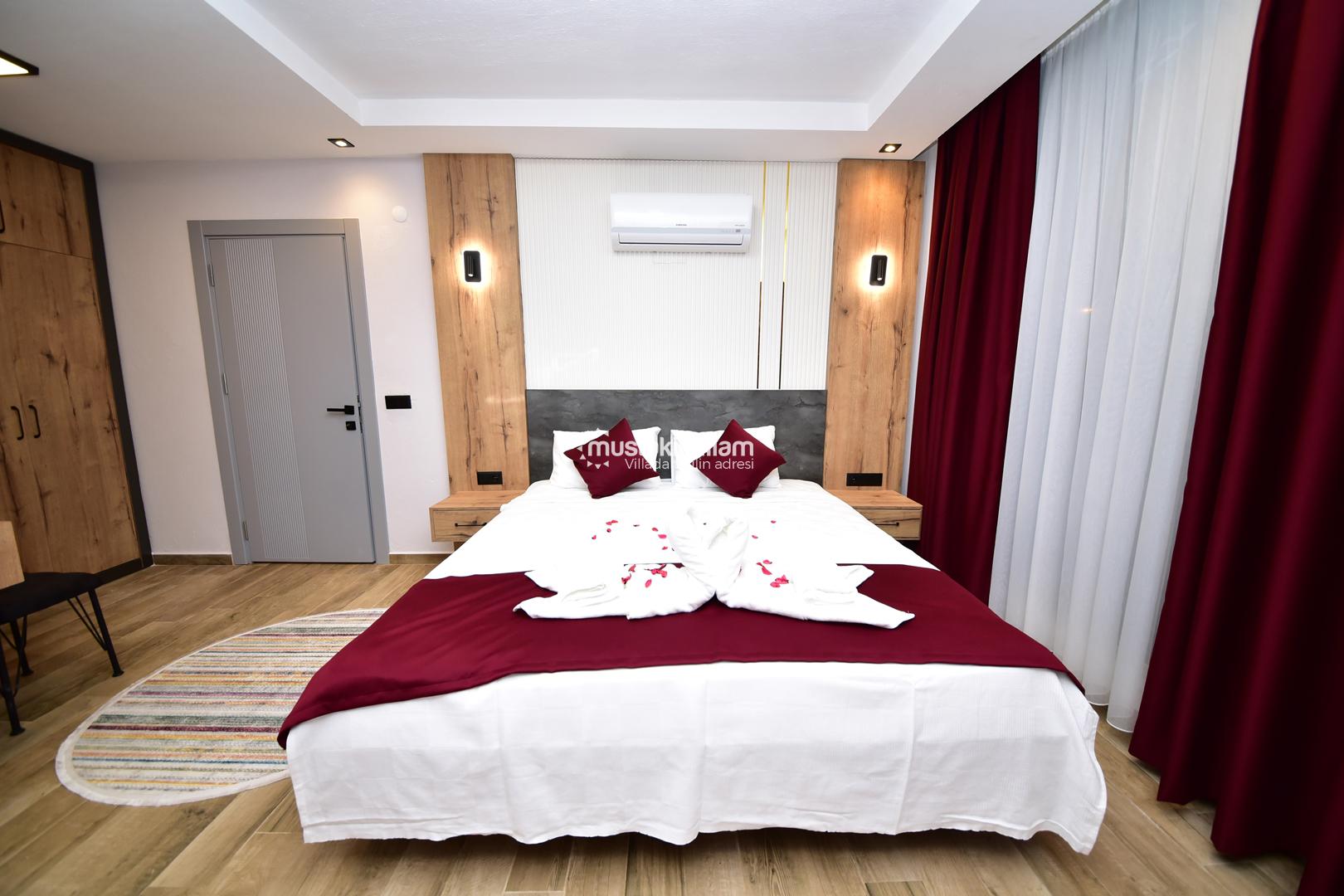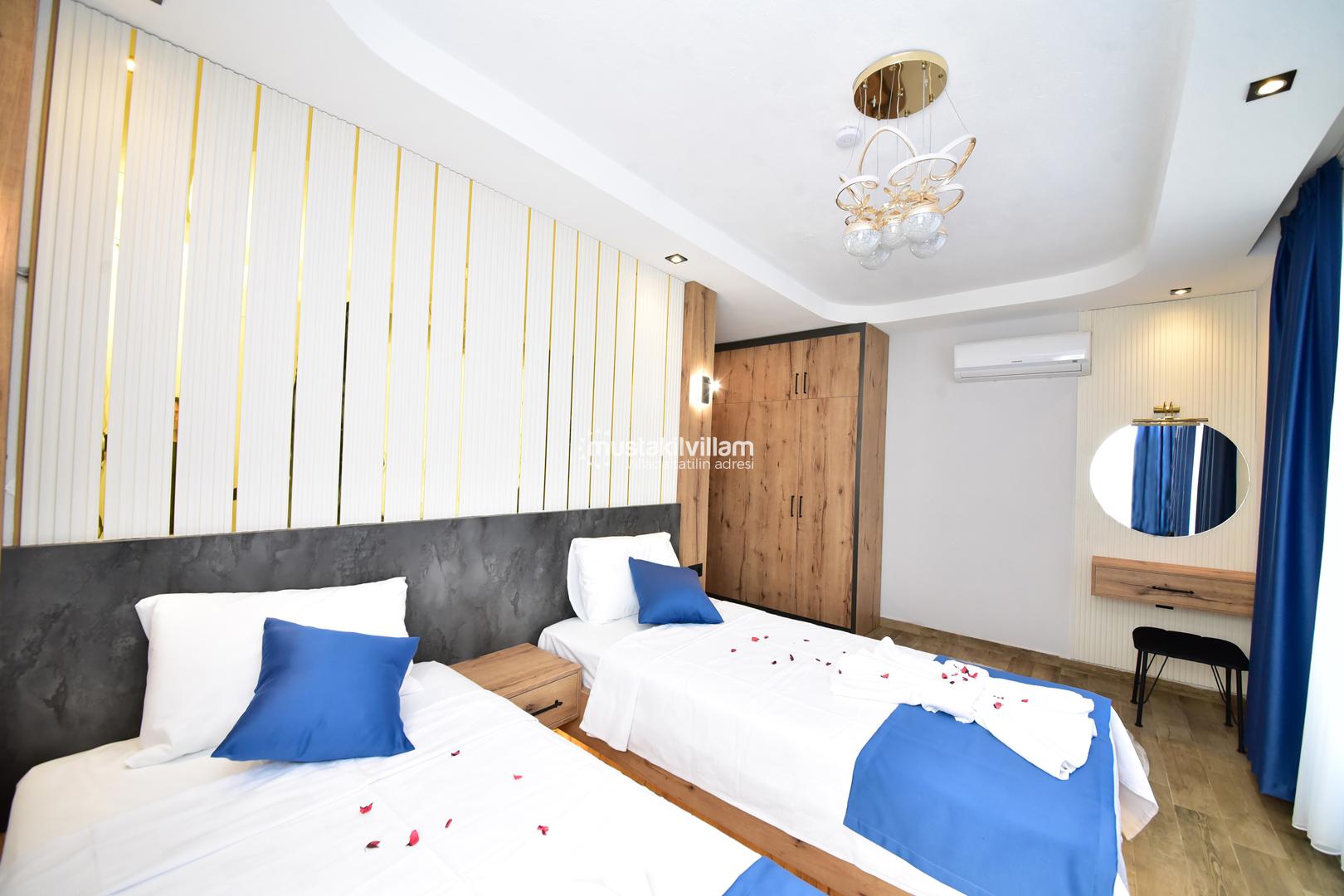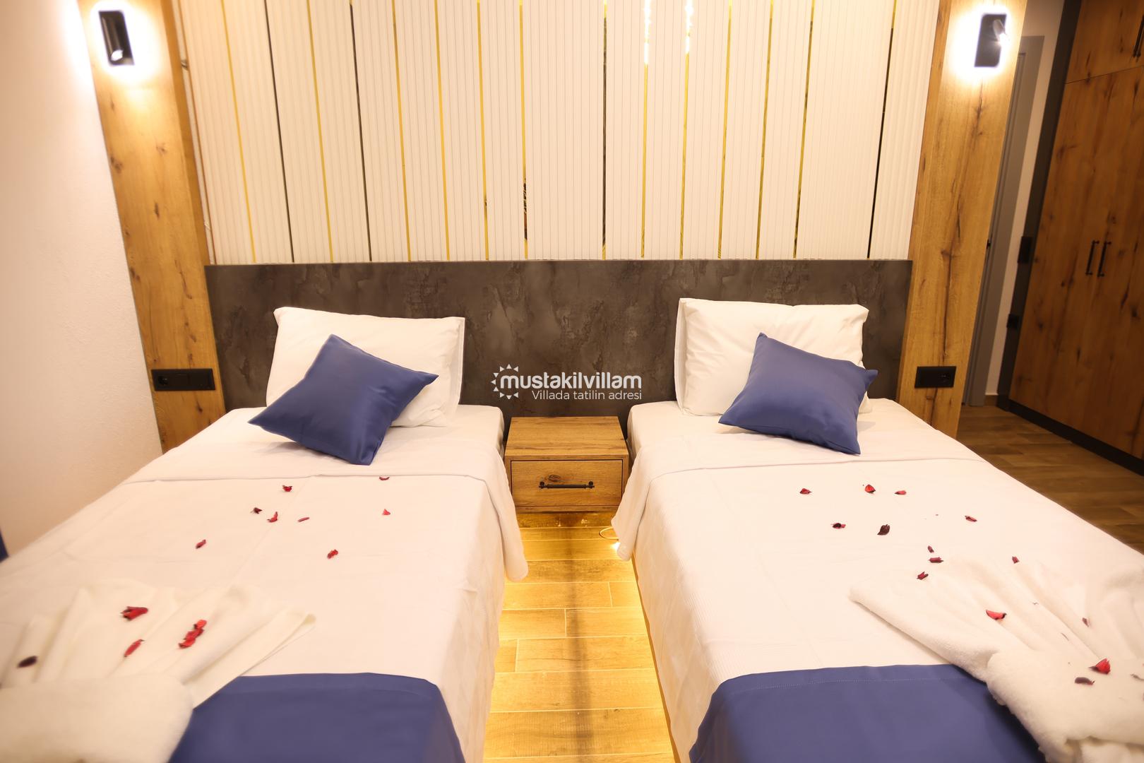 Bu yerleşim, misafirlerin mahremiyetini korur ve her bireye konforlu bir alan sunar. Villanın odaları, modern tasarımı ve estetik detaylarıyla tatil boyunca rahat ve keyifli bir ortam sağlar.