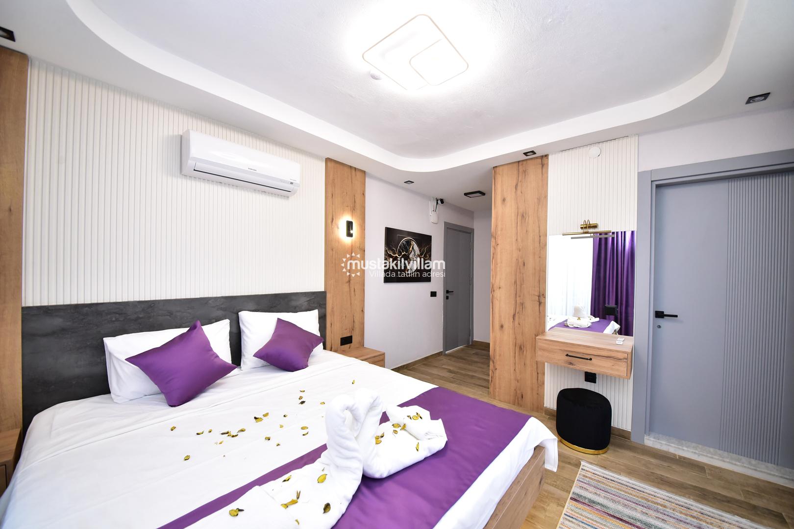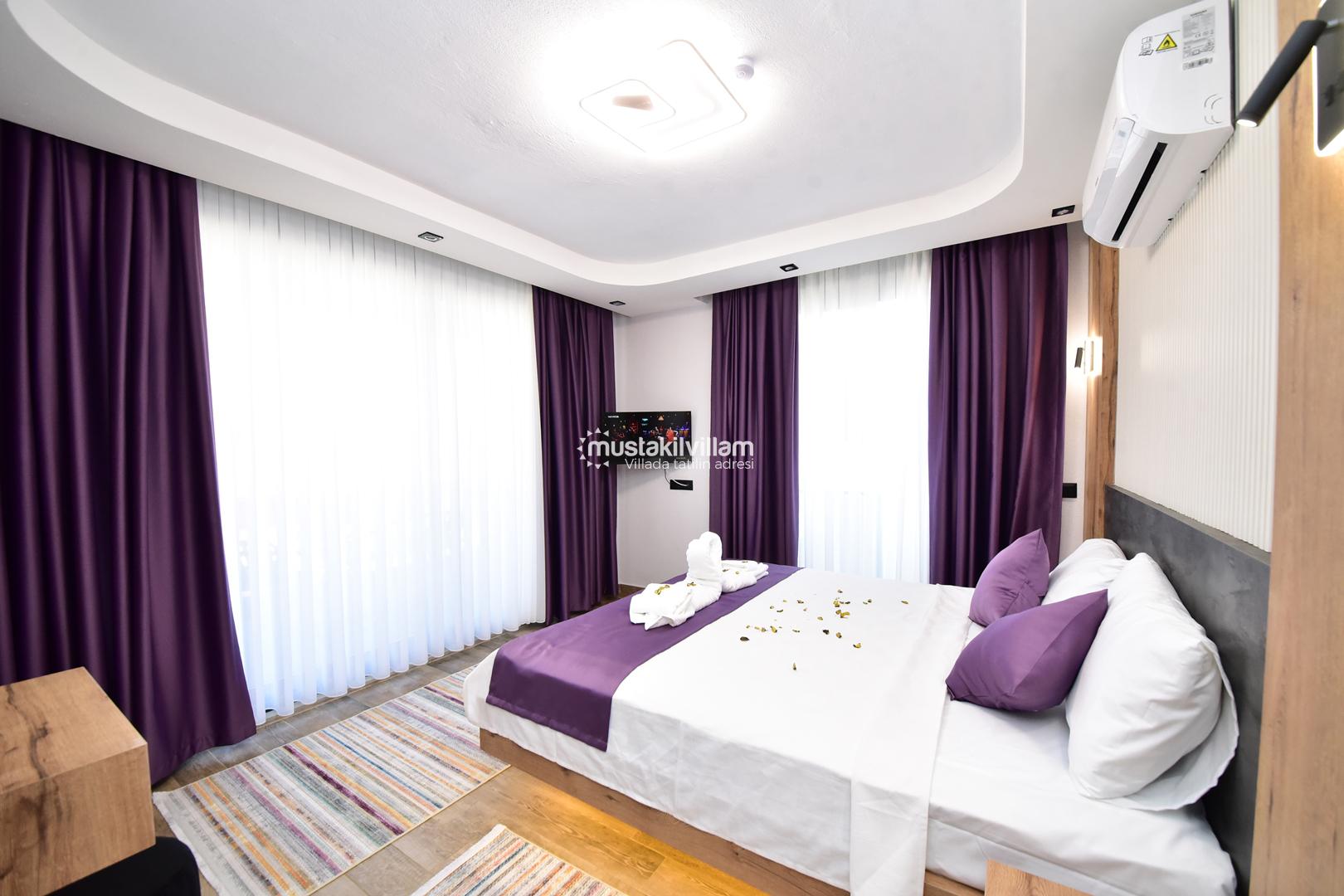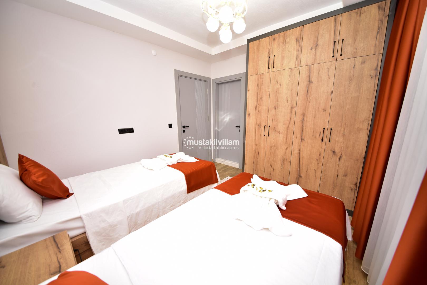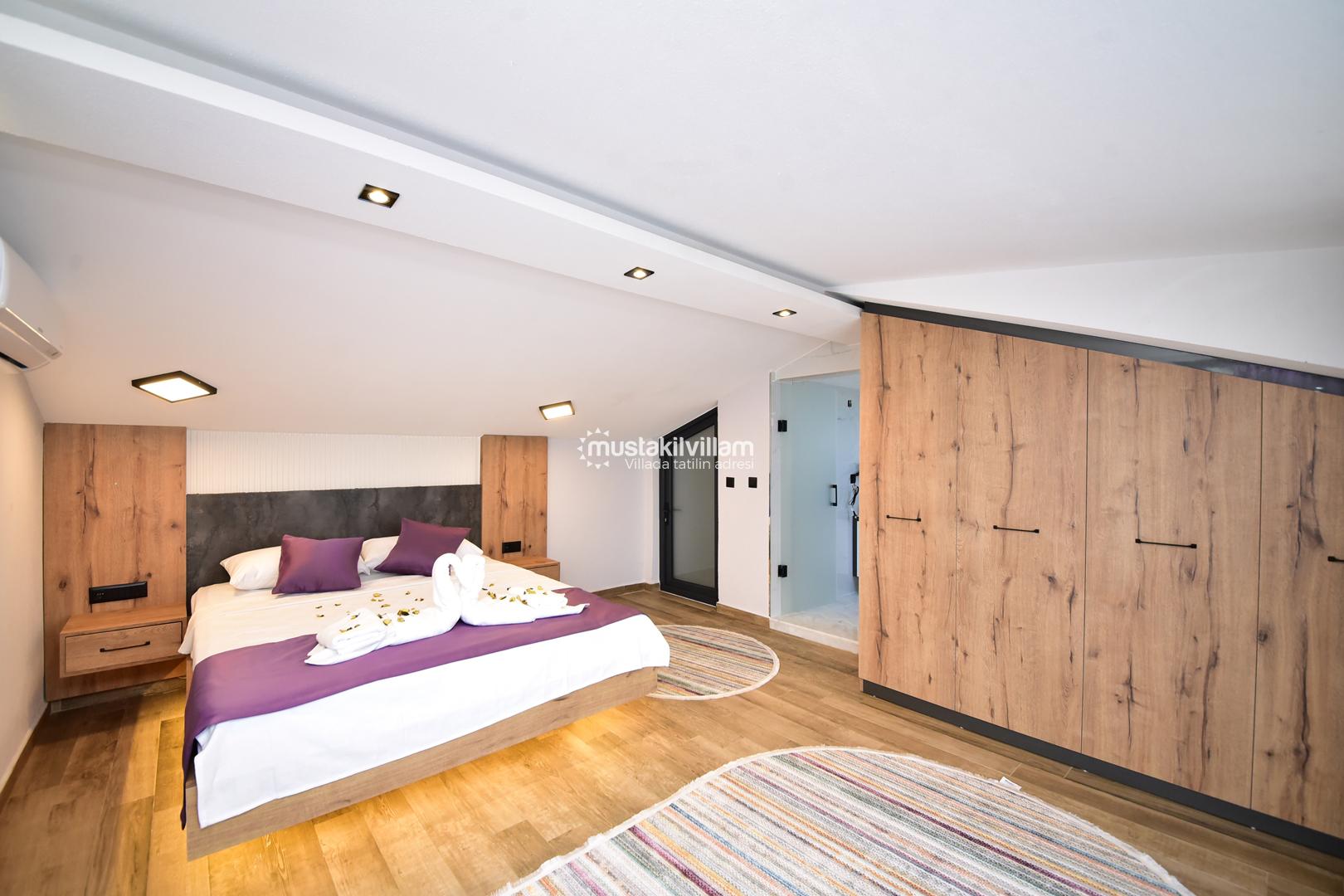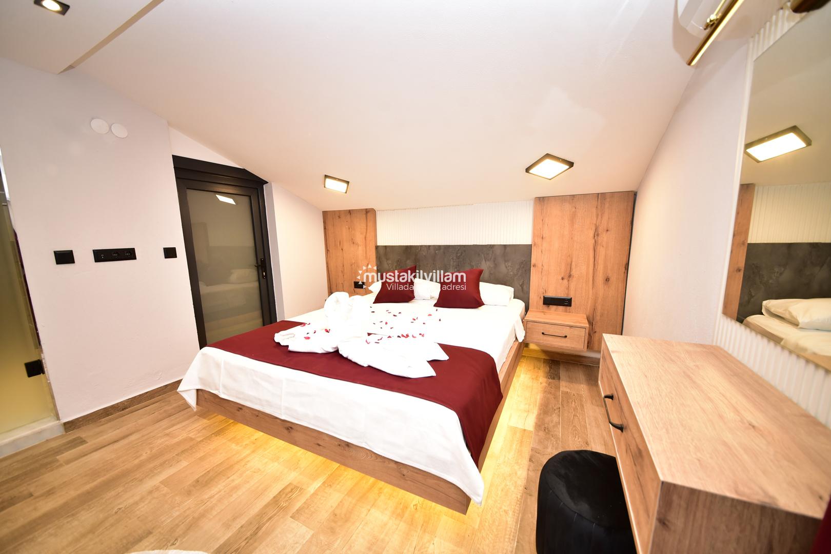 Bu yerleşim, misafirlerin mahremiyetini korur ve her bireye konforlu bir alan sunar. Villanın odaları, modern tasarımı ve estetik detaylarıyla tatil boyunca rahat ve keyifli bir ortam sağlar.