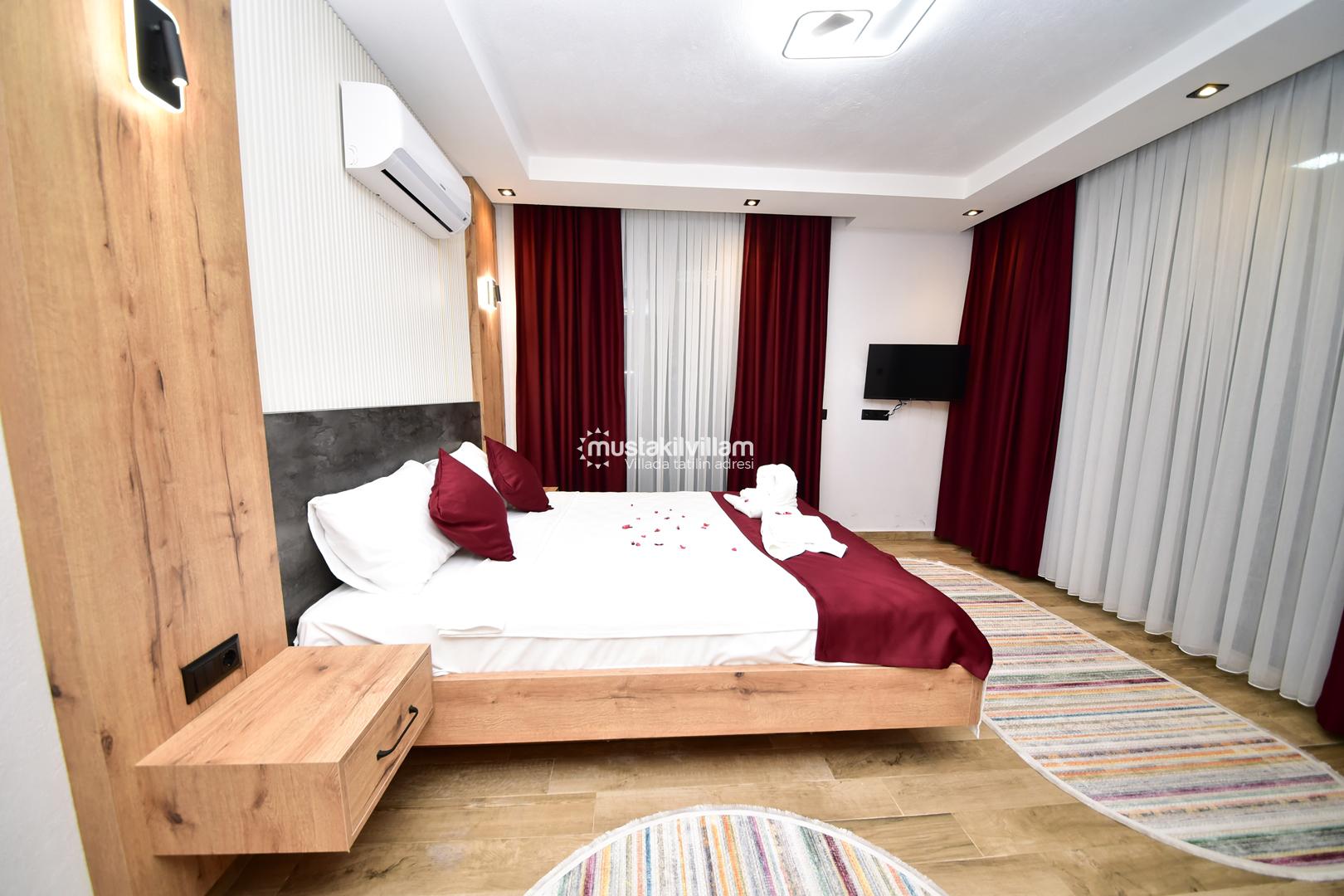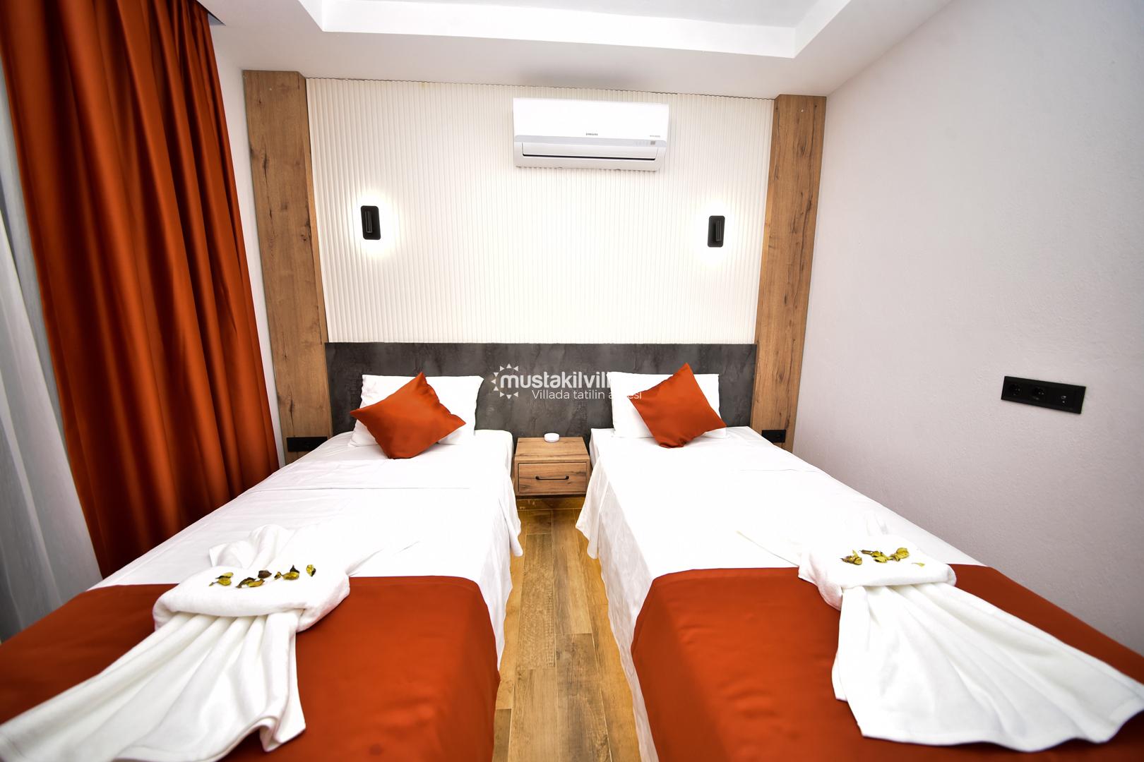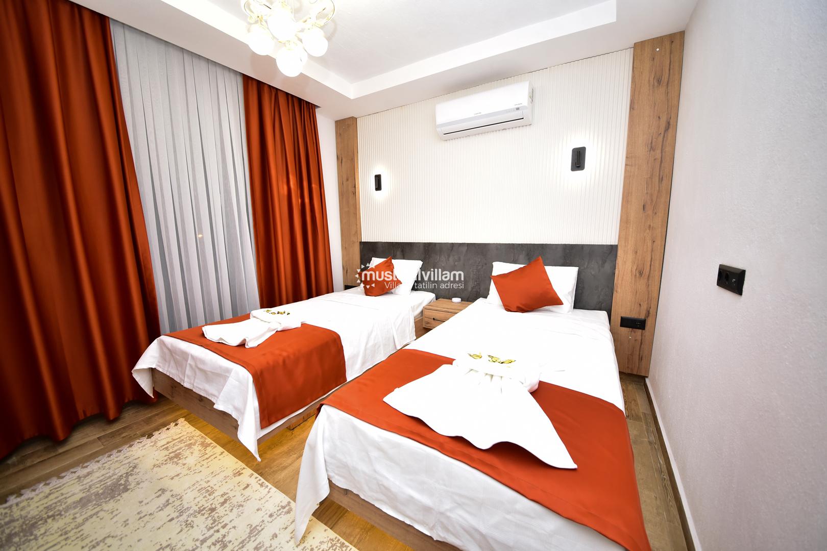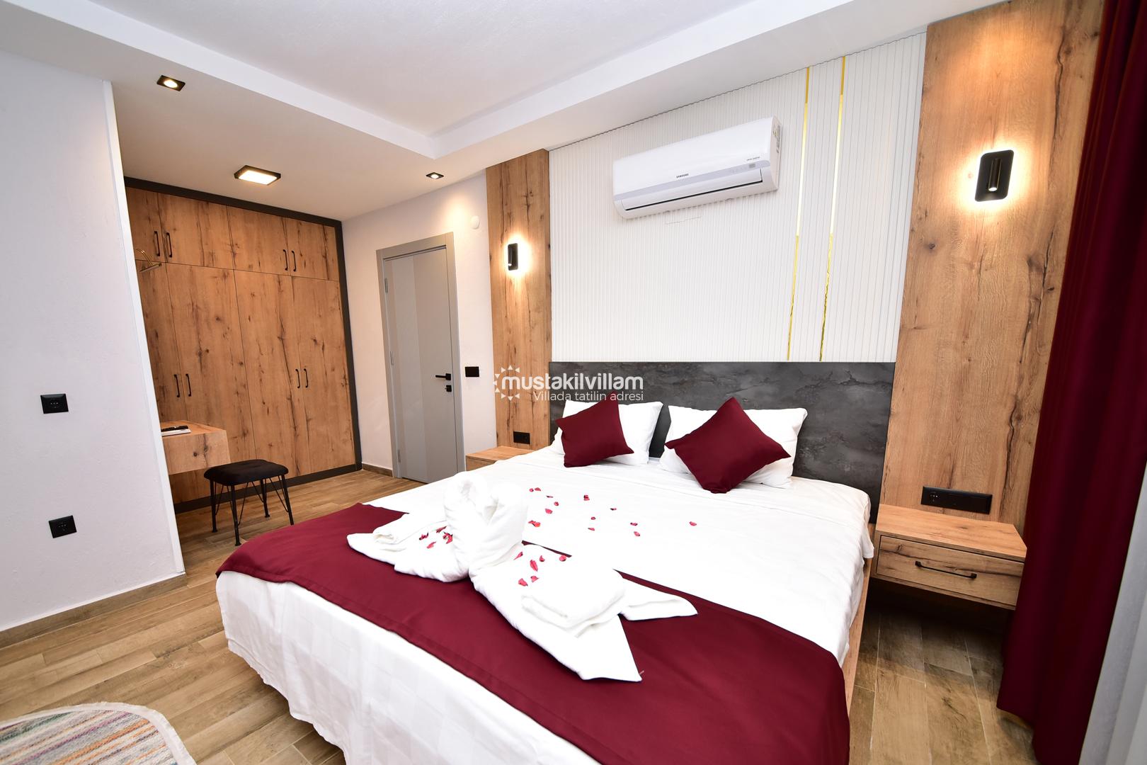 Bu yerleşim, misafirlerin mahremiyetini korur ve her bireye konforlu bir alan sunar. Villanın odaları, modern tasarımı ve estetik detaylarıyla tatil boyunca rahat ve keyifli bir ortam sağlar.