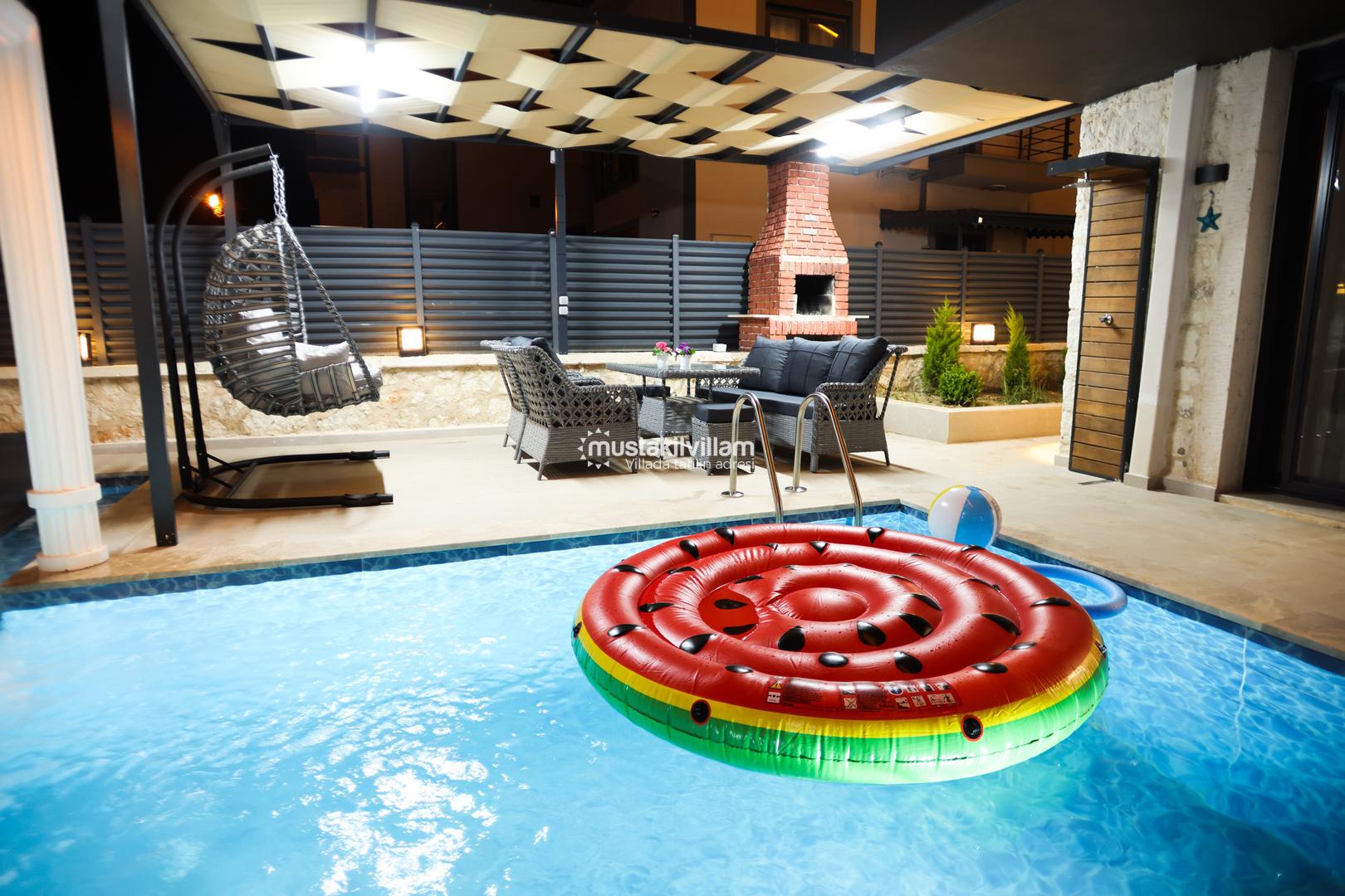 Villanın özel yüzme havuzu ve sığ havuz alanı, hem çocuklu aileler hem de yetişkinler için güvenli ve konforludur. Havuz çevresinde şezlong, şemsiye, oturma grubu ve yemek masası bulunur. Ayrıca barbekü alanı sayesinde doğa içinde lezzetli yemekler hazırlamak mümkündür.