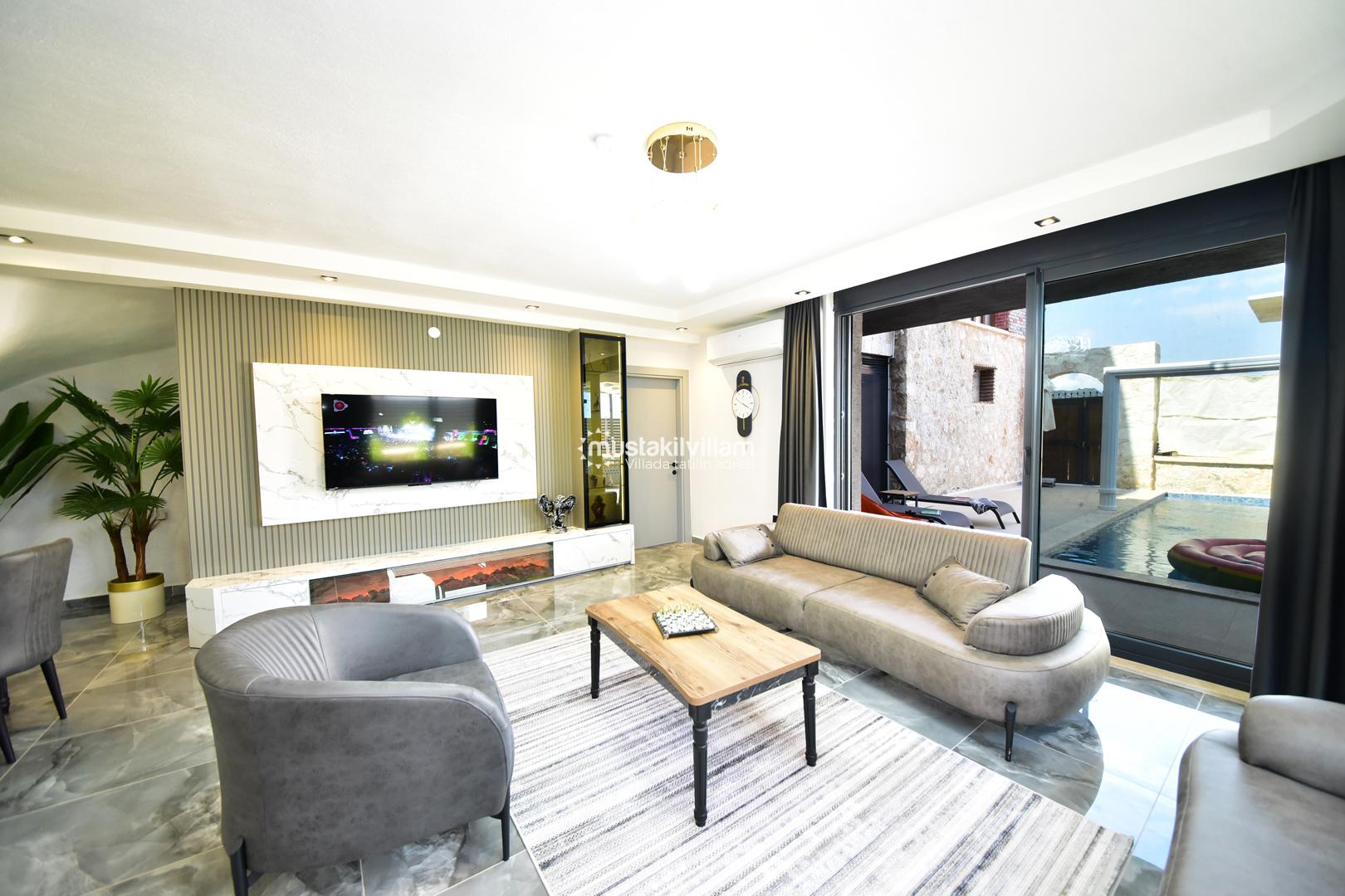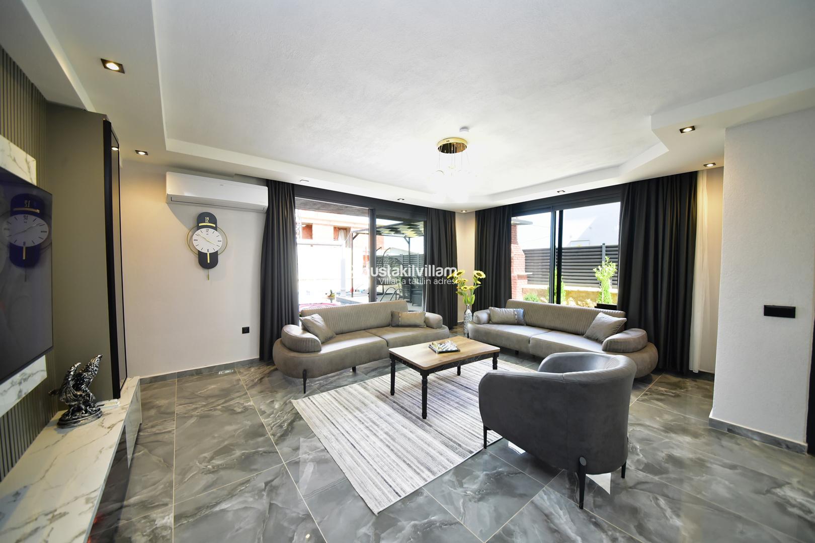 Villanın salon kısmı, konforlu oturma grubu, klima, sehpa, TV, uydu alıcı ve kablosuz internet ile donatılmıştır. Havuz terasına direkt erişim sağlayan salon, açık hava ile iç mekan arasında rahat bir geçiş sunar. Smart TV ve modern mobilyalar, tatil boyunca keyifli vakit geçirmenizi sağlar.