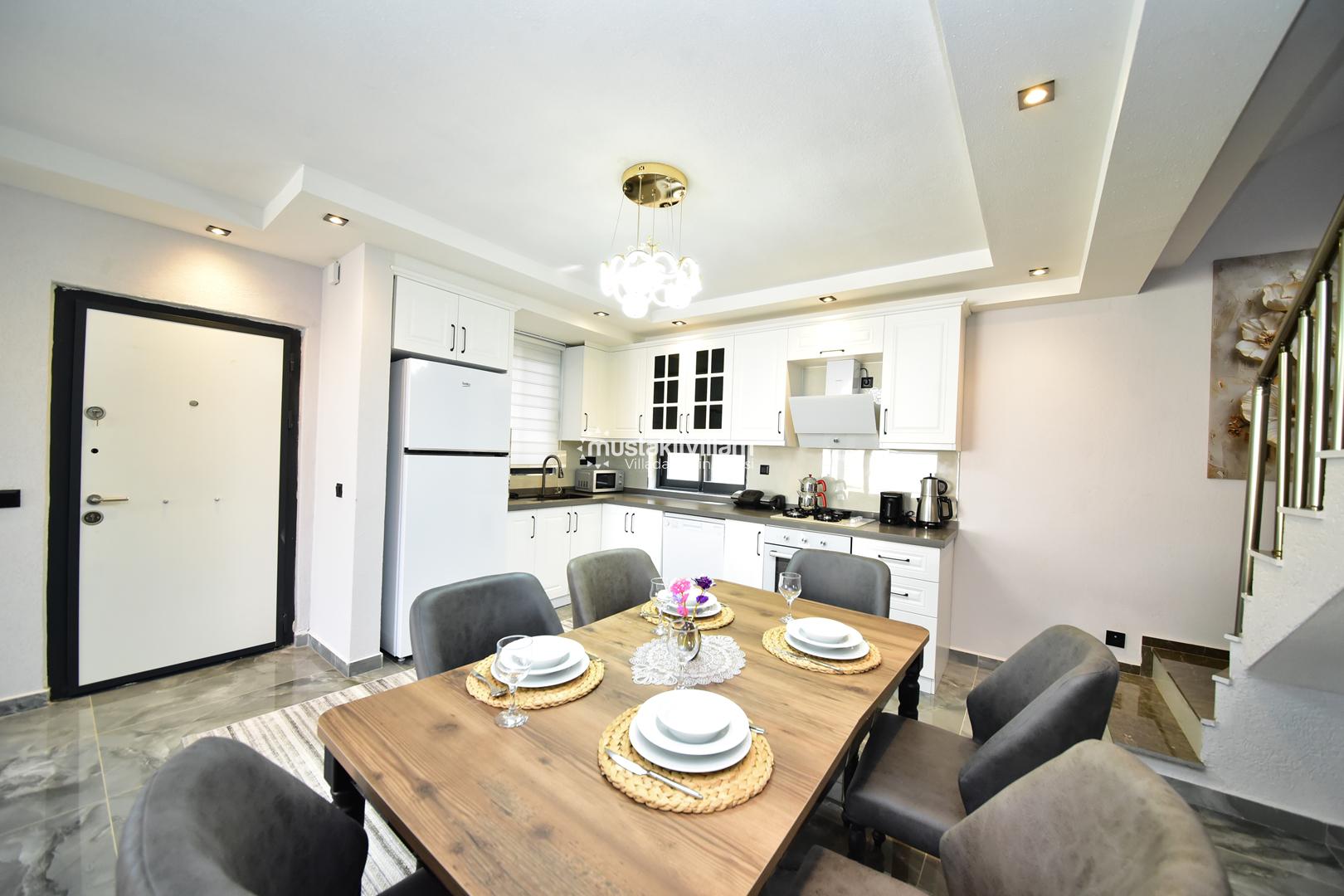 Mutfak, misafirlerin ihtiyaç duyabileceği tüm gereçlerle donatılmıştır. Bu sayede kısa veya uzun süreli tatillerde ev konforunu ve özgürlüğünü yaşayabilirsiniz.