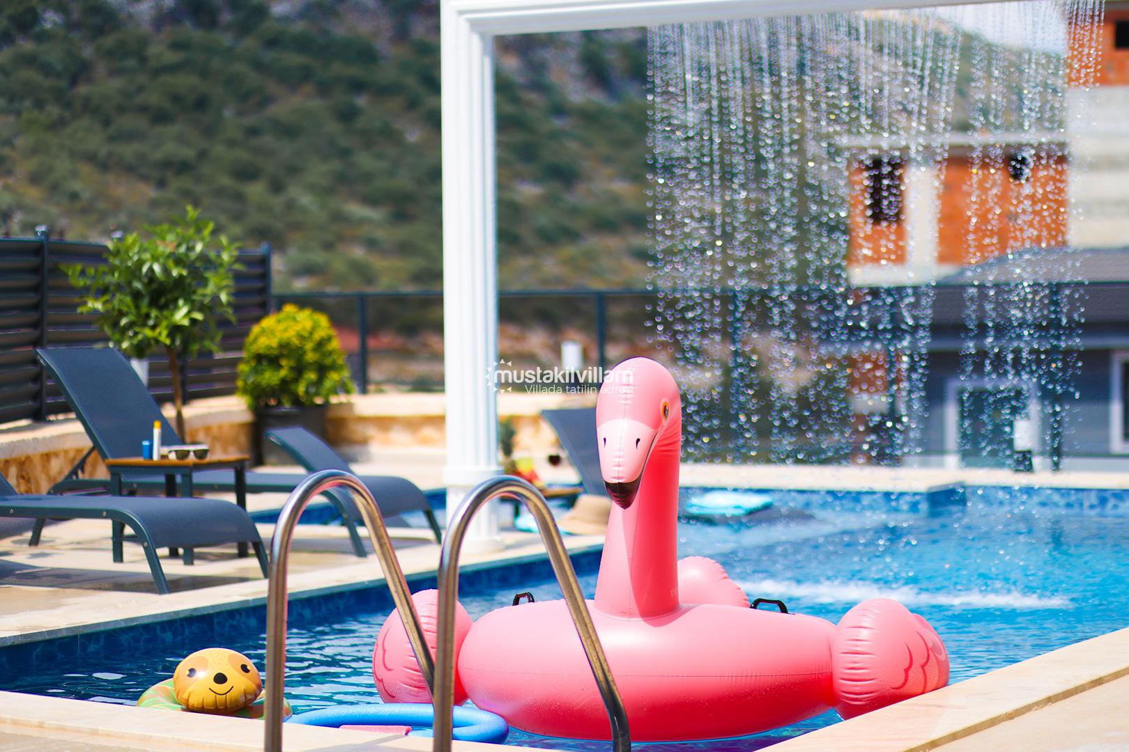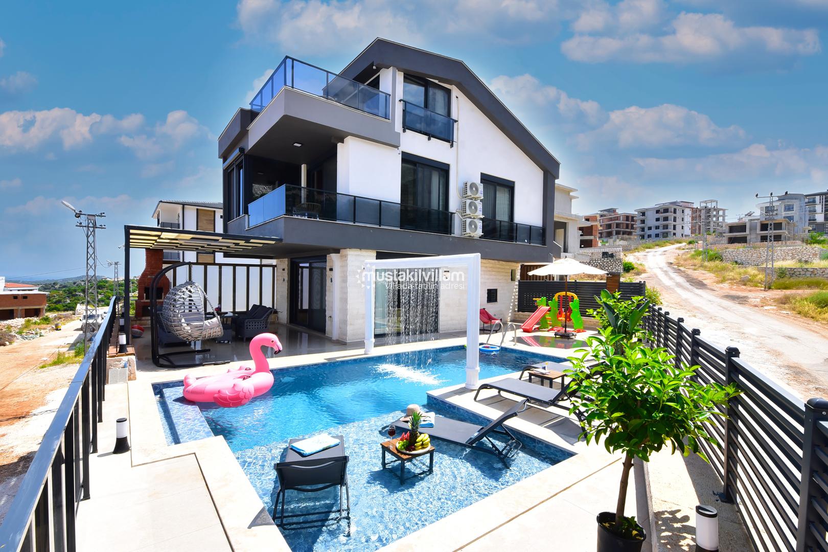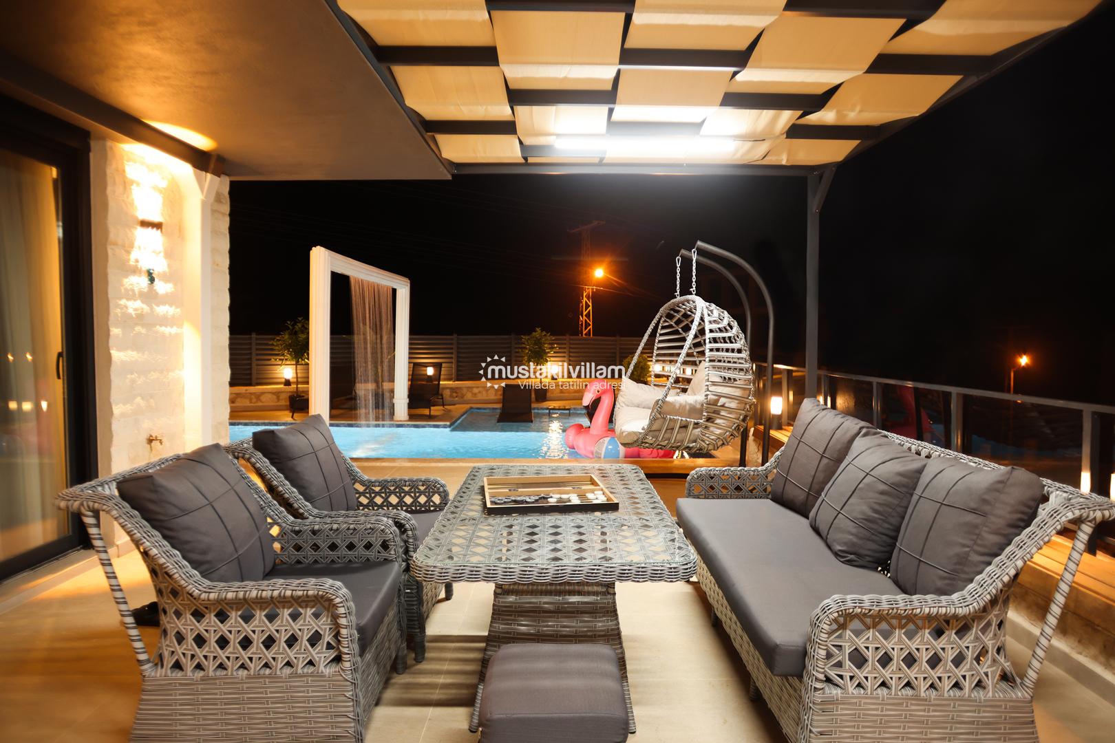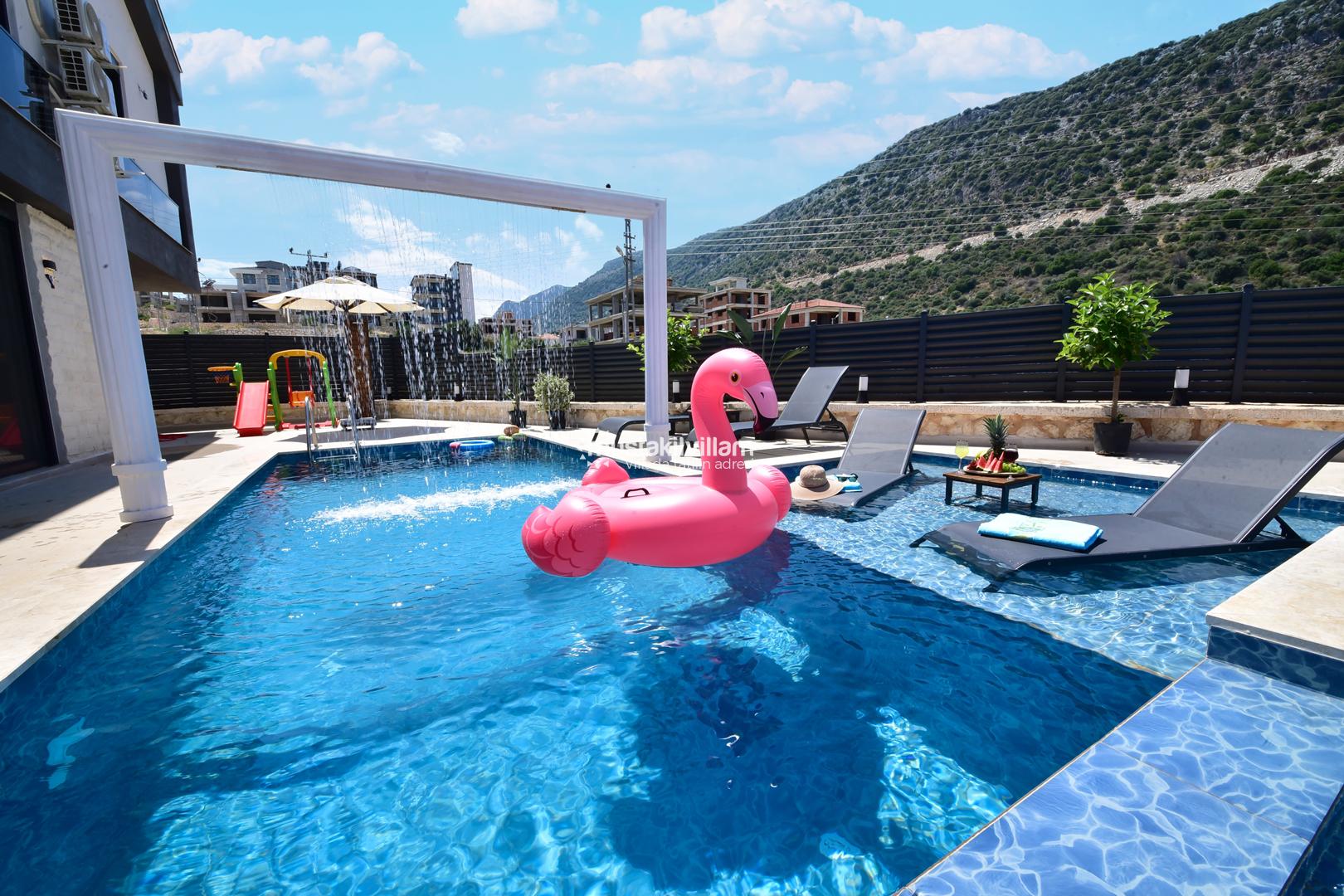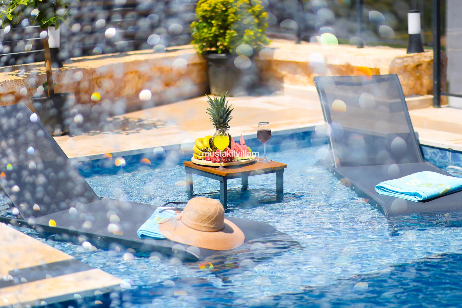 Villanın en dikkat çeken özelliklerinden biri, özel yüzme havuzudur. Havuz, yaz aylarında serinlemek için mükemmel bir alternatiftir ve çocuklar için sığ havuz kısmı sayesinde güvenli bir kullanım olanağı sunar. Havuz etrafındaki şezlonglar ve oturma alanları, güneşlenmek ve dinlenmek için tasarlanmıştır.