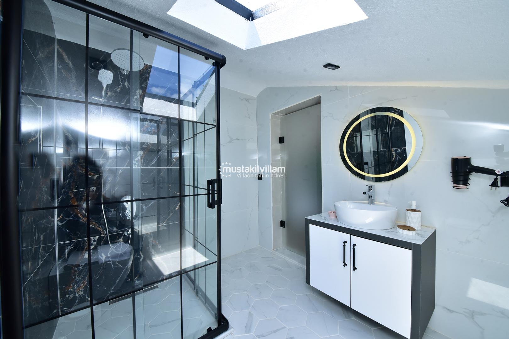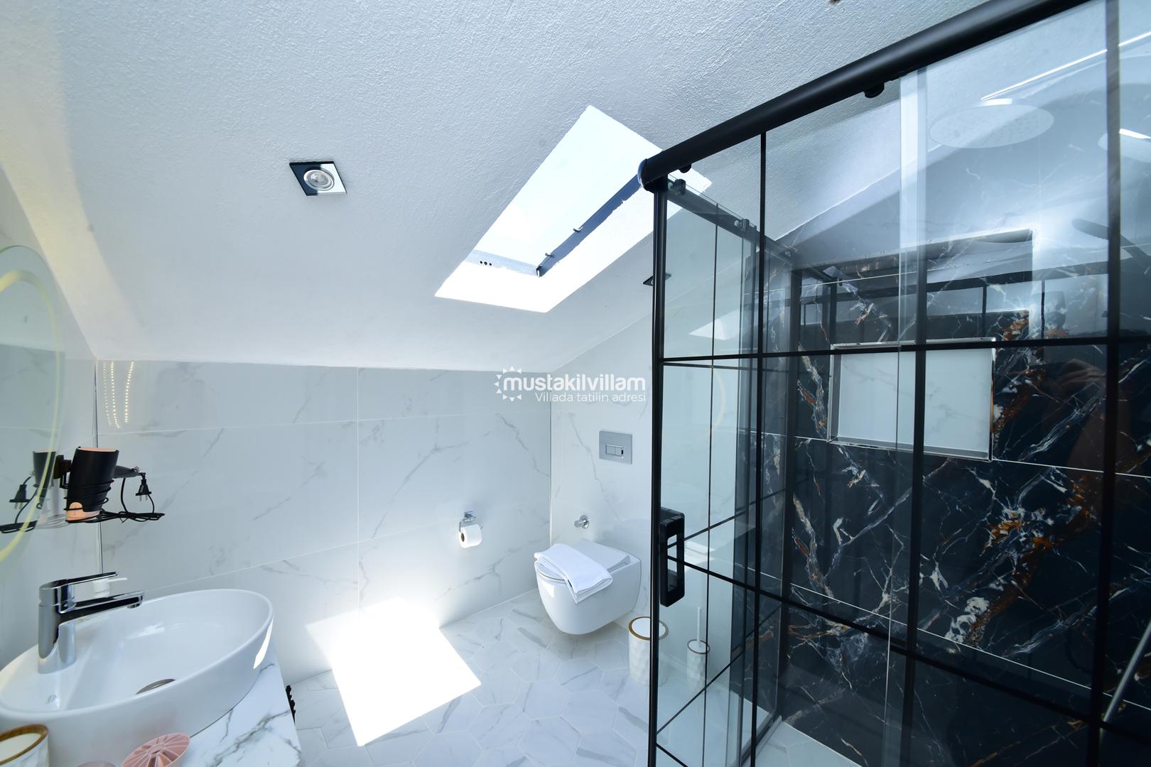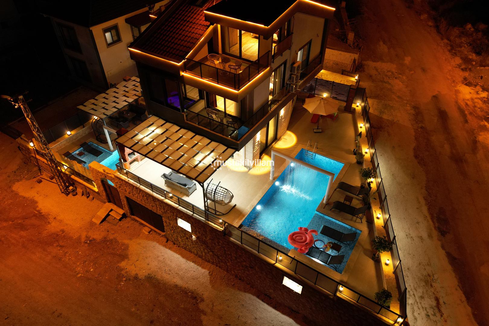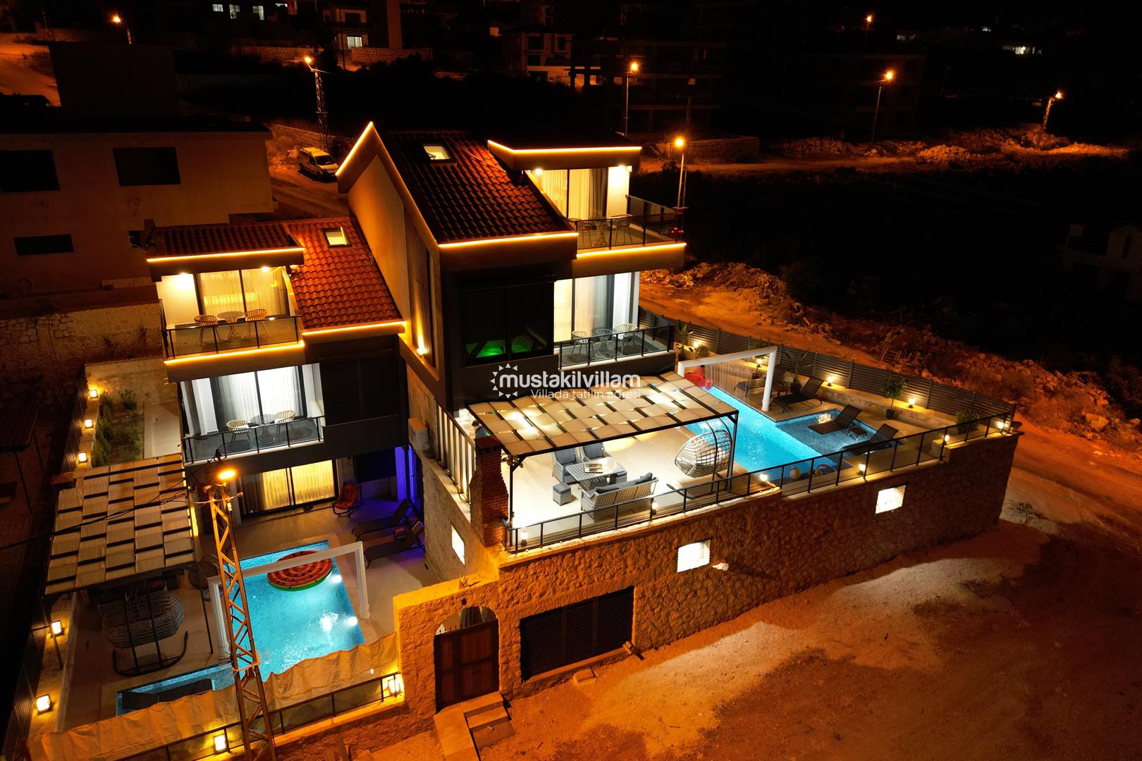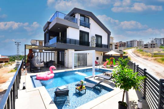 Villanın en dikkat çeken özelliklerinden biri, özel yüzme havuzudur. Havuz, yaz aylarında serinlemek için mükemmel bir alternatiftir ve çocuklar için sığ havuz kısmı sayesinde güvenli bir kullanım olanağı sunar. Havuz etrafındaki şezlonglar ve oturma alanları, güneşlenmek ve dinlenmek için tasarlanmıştır.