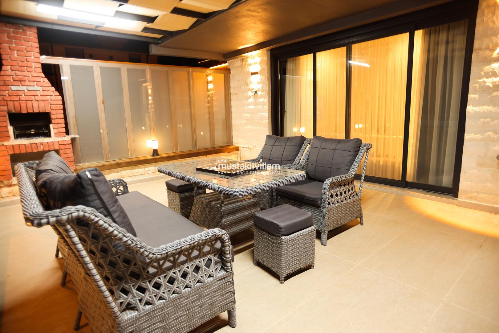 Dış alan, barbekü ve yemek alanı olarak da kullanılabilir. Açık havada yemek yemek ve sevdiklerinizle vakit geçirmek, tatilinizi daha keyifli hale getirir. Bahçede doğal bitki örtüsü ve çiçekler, villaya ayrı bir güzellik katmaktadır.