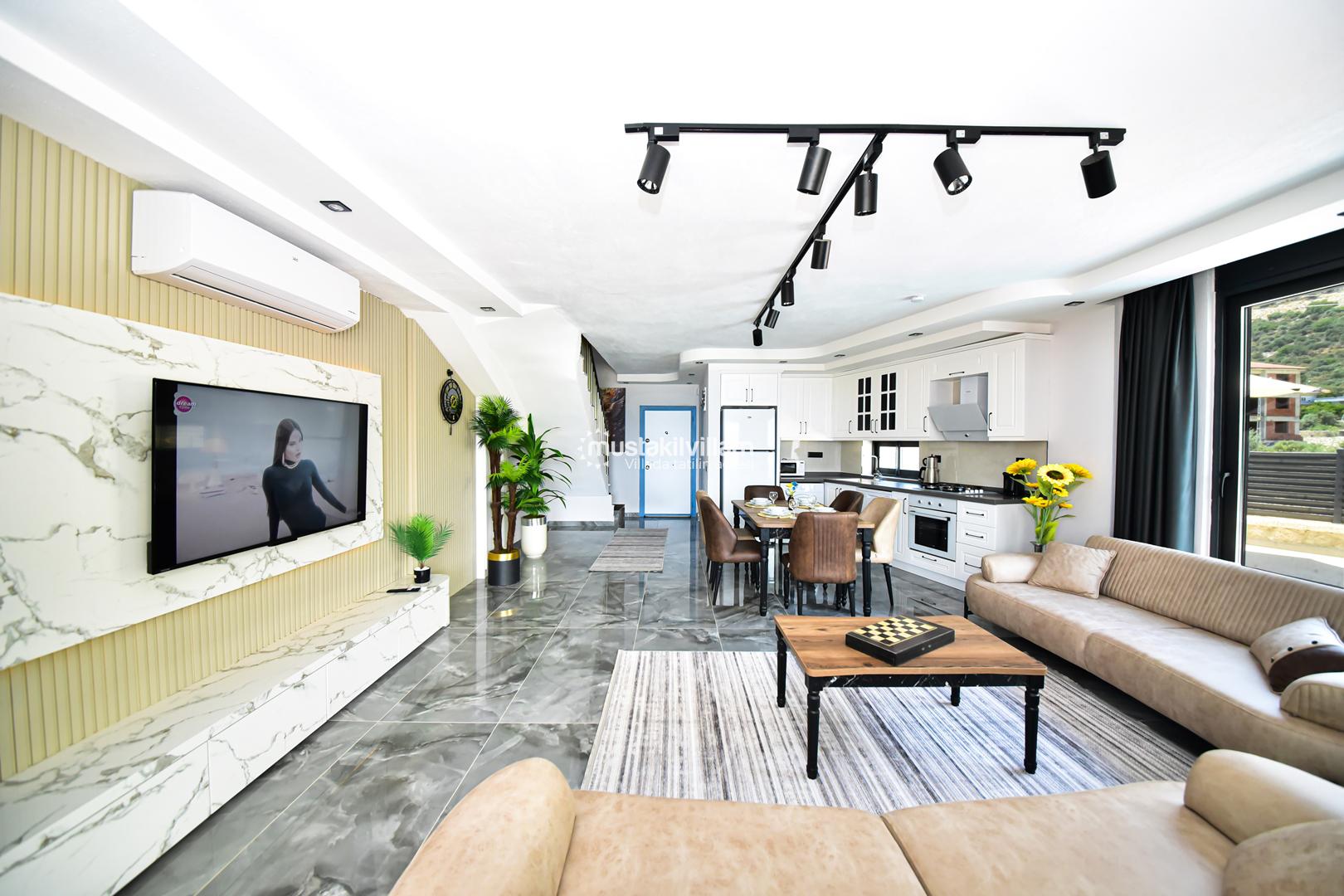Salon alanı, konforlu oturma grupları ve klima ile donatılmıştır. Villada ücretsiz Wi-Fi bulunması sayesinde tatil sırasında sevdiklerinizle iletişimde kalabilir veya uzaktan çalışabilirsiniz. Ayrıca salonun büyük pencereleri sayesinde doğal ışıkla aydınlanan bir ortam sunulmaktadır.