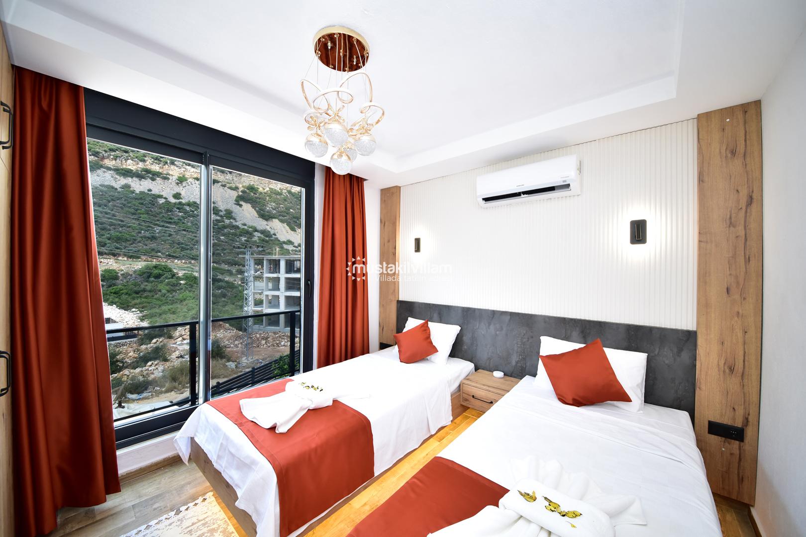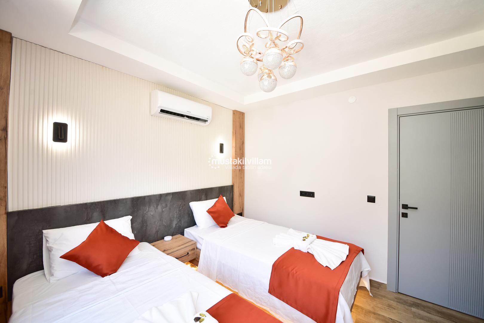 2. Yatak Odası: İki tek kişilik yatak, klima, komodin ve elbise dolabı.