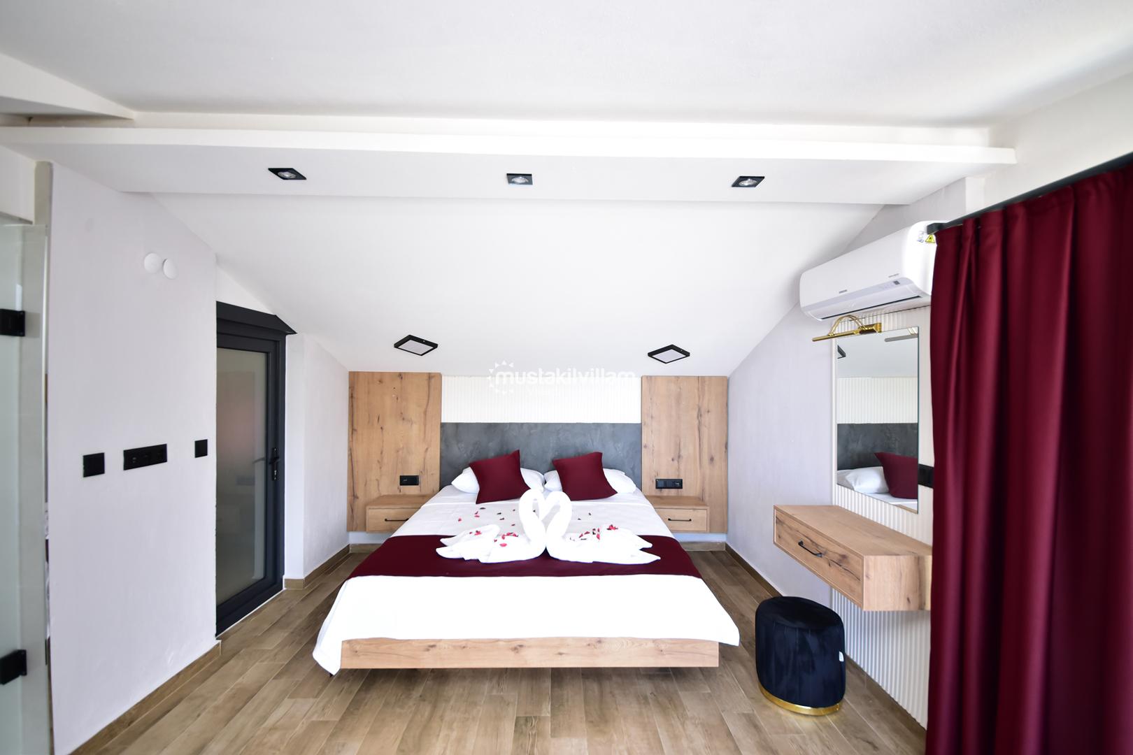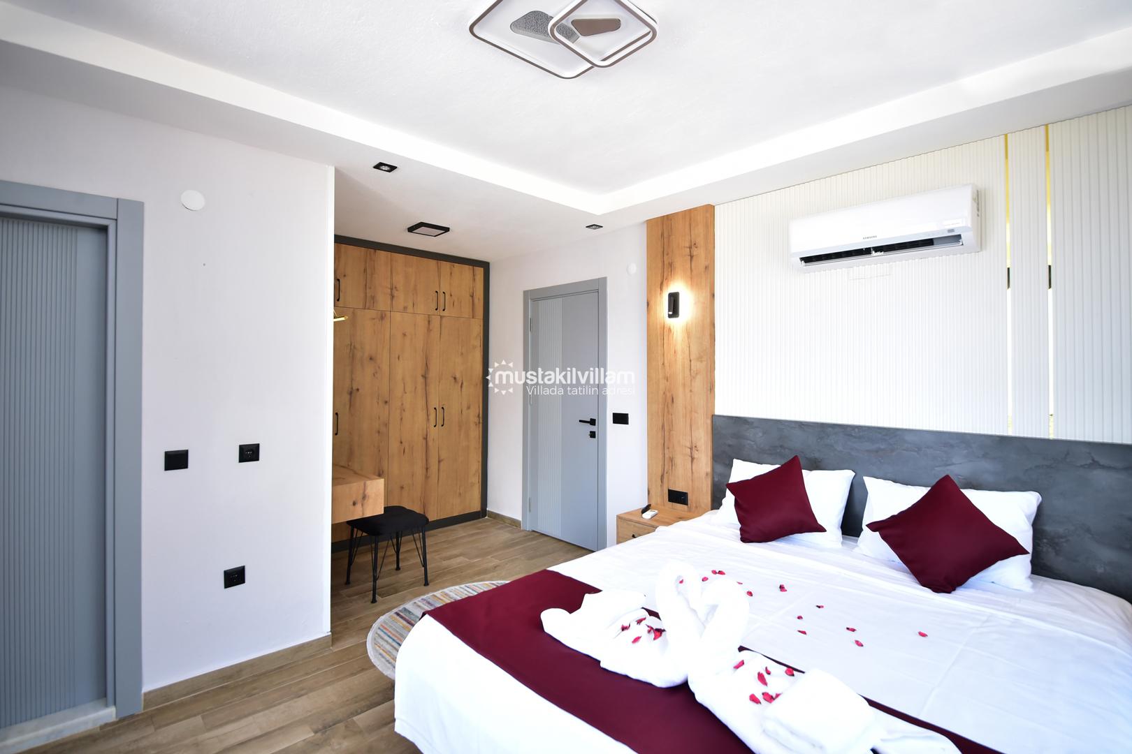 1. Yatak Odası: Çift kişilik yatak, banyo/WC, klima ve elbise dolabı.