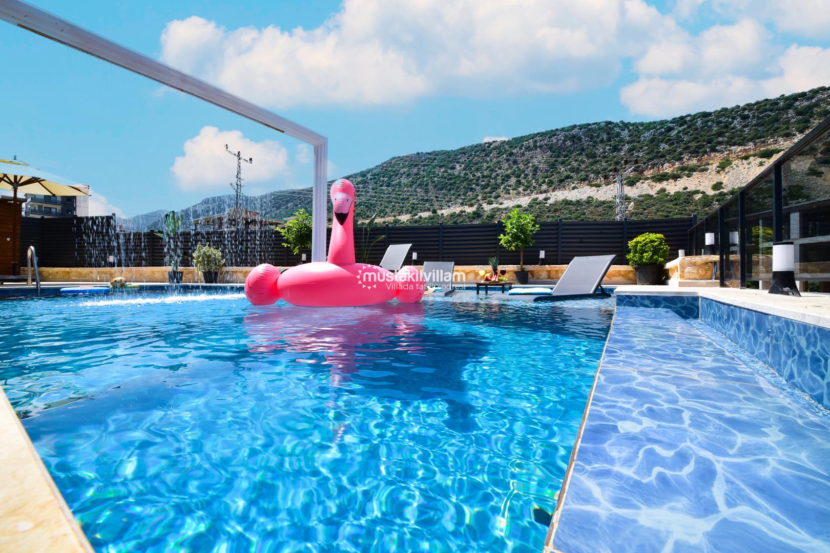 Belmora Villa’nın özel yüzme havuzu, tatilin en keyifli alanlarından biridir. Sığ havuz kısmı çocuklar için güvenli bir ortam sunar. Havuz etrafında şezlonglar ve oturma alanları yer almakta olup, güneşlenme ve dinlenme için idealdir.