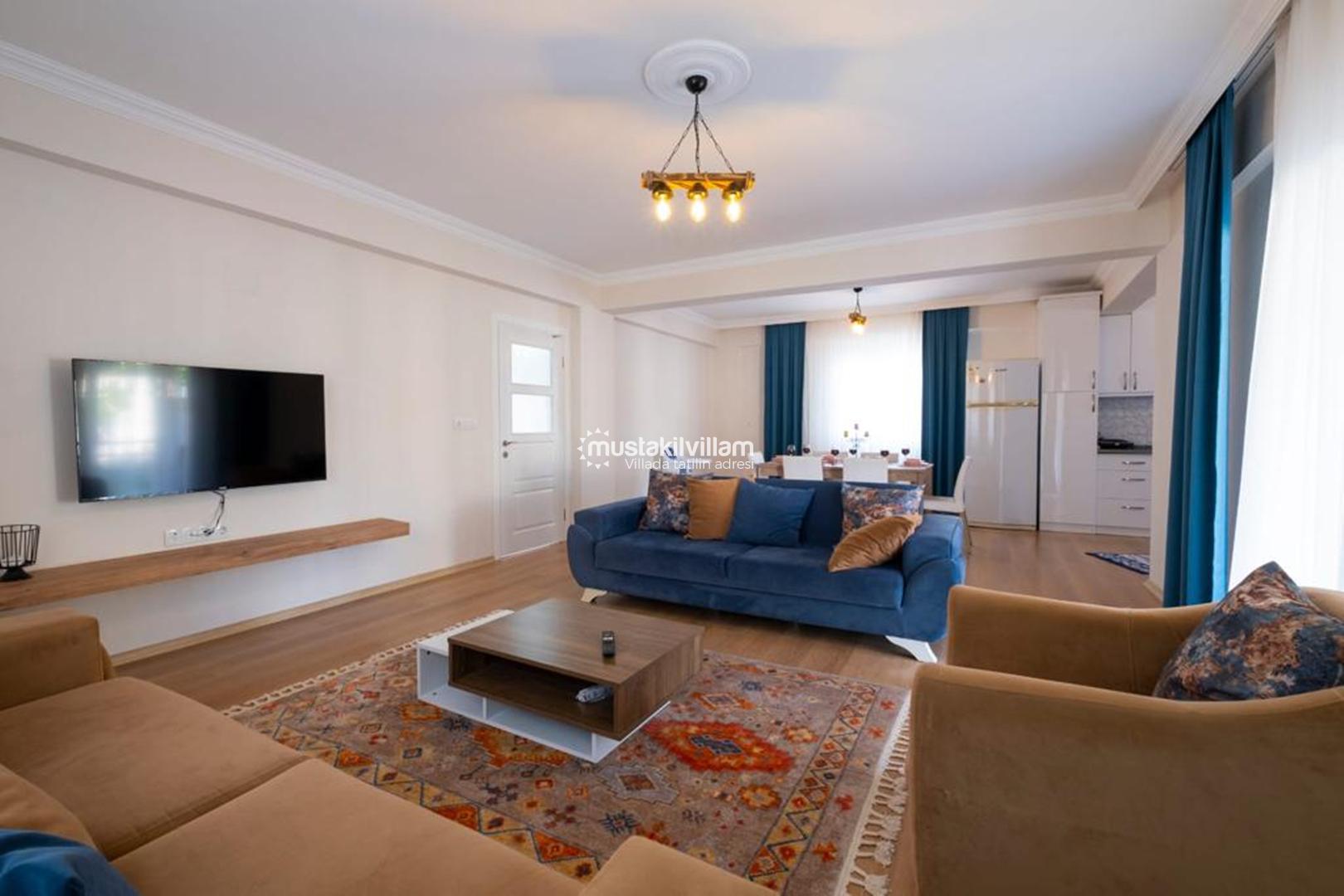 Salon bölümünde konforlu oturma grubu, klima, televizyon ve kablosuz internet gibi tatil boyunca ihtiyaç duyabileceğiniz tüm temel donanımlar bulunmaktadır. Geniş cam kapılar sayesinde salon alanı gün ışığını bolca alır ve doğa manzarasıyla iç mekânı bütünleştirir.