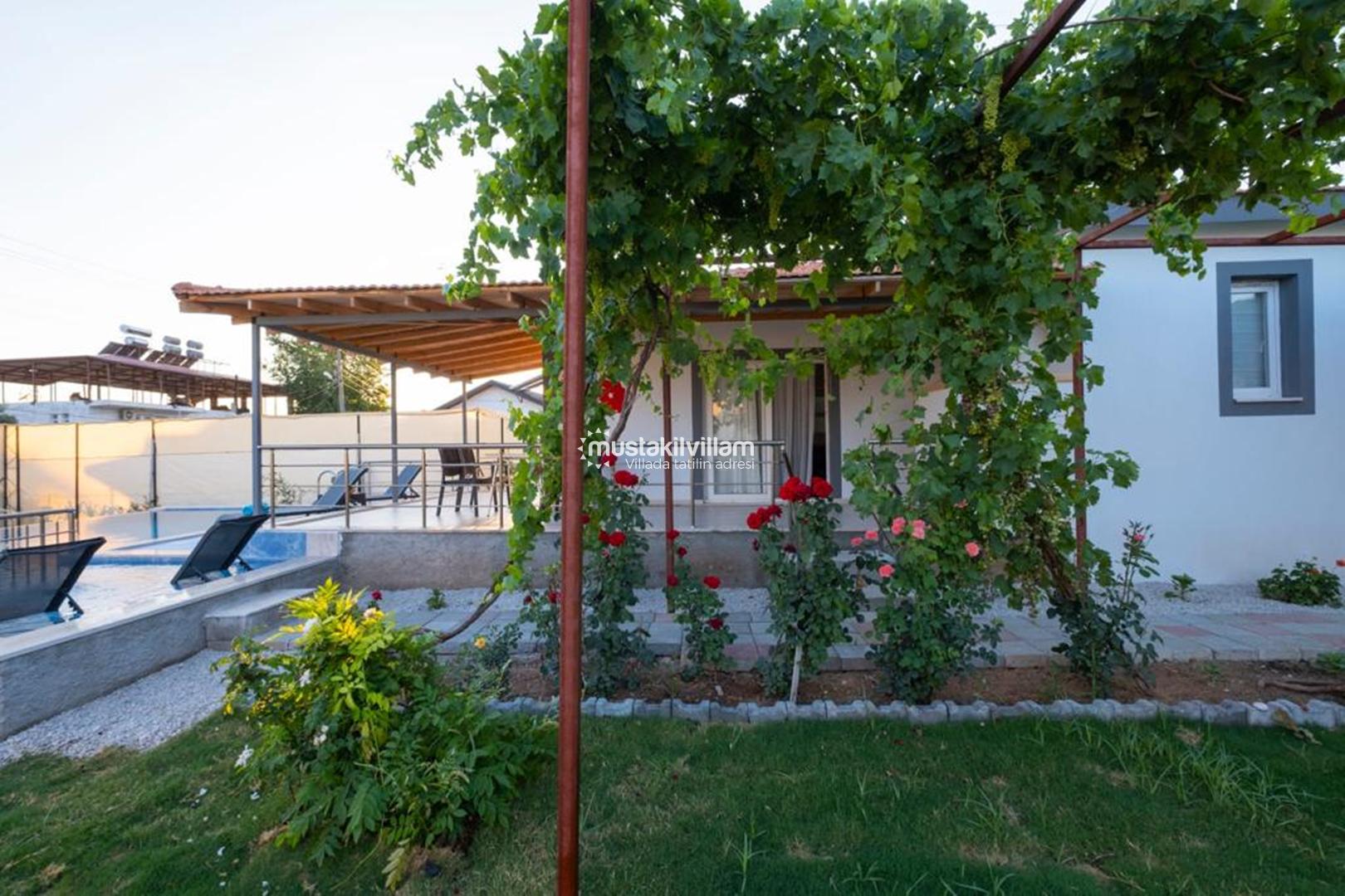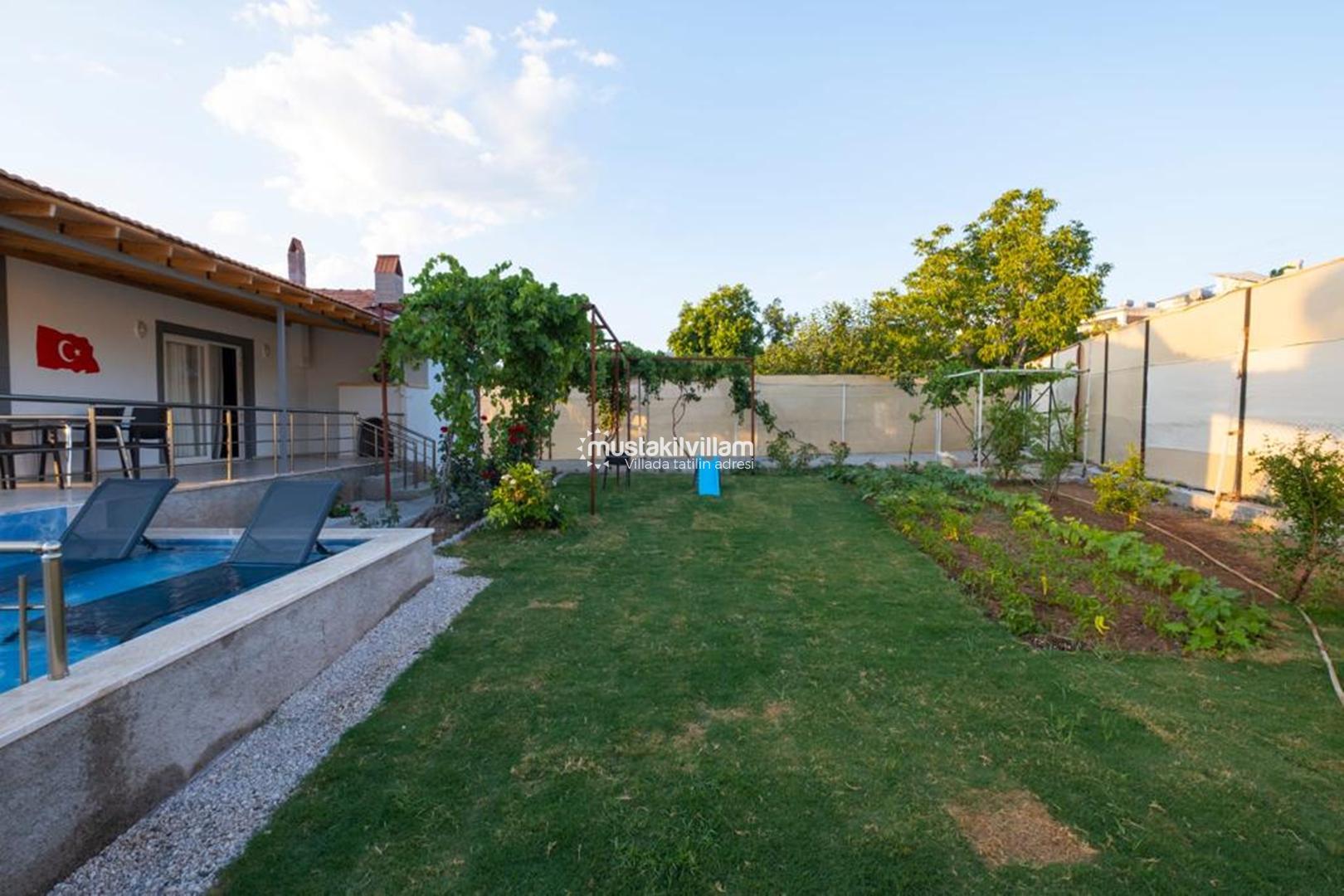 Villa Bahargülü’nün bahçesi tatilinizi daha keyifli hale getiren detaylarla donatılmıştır.