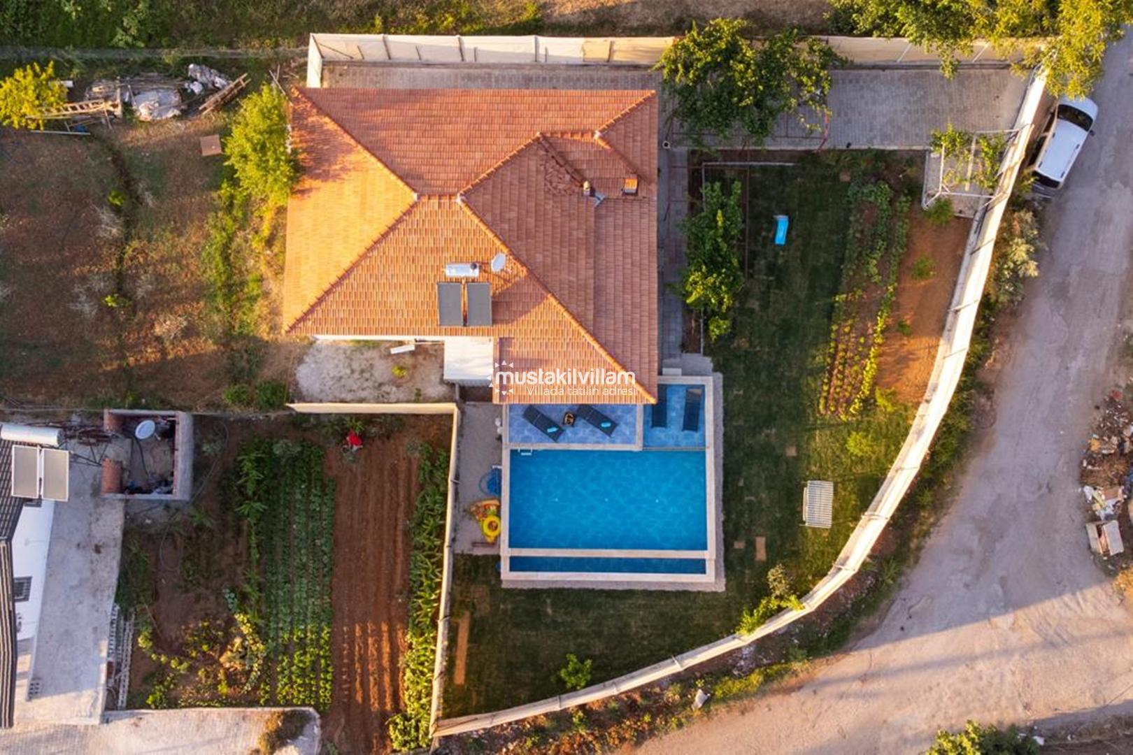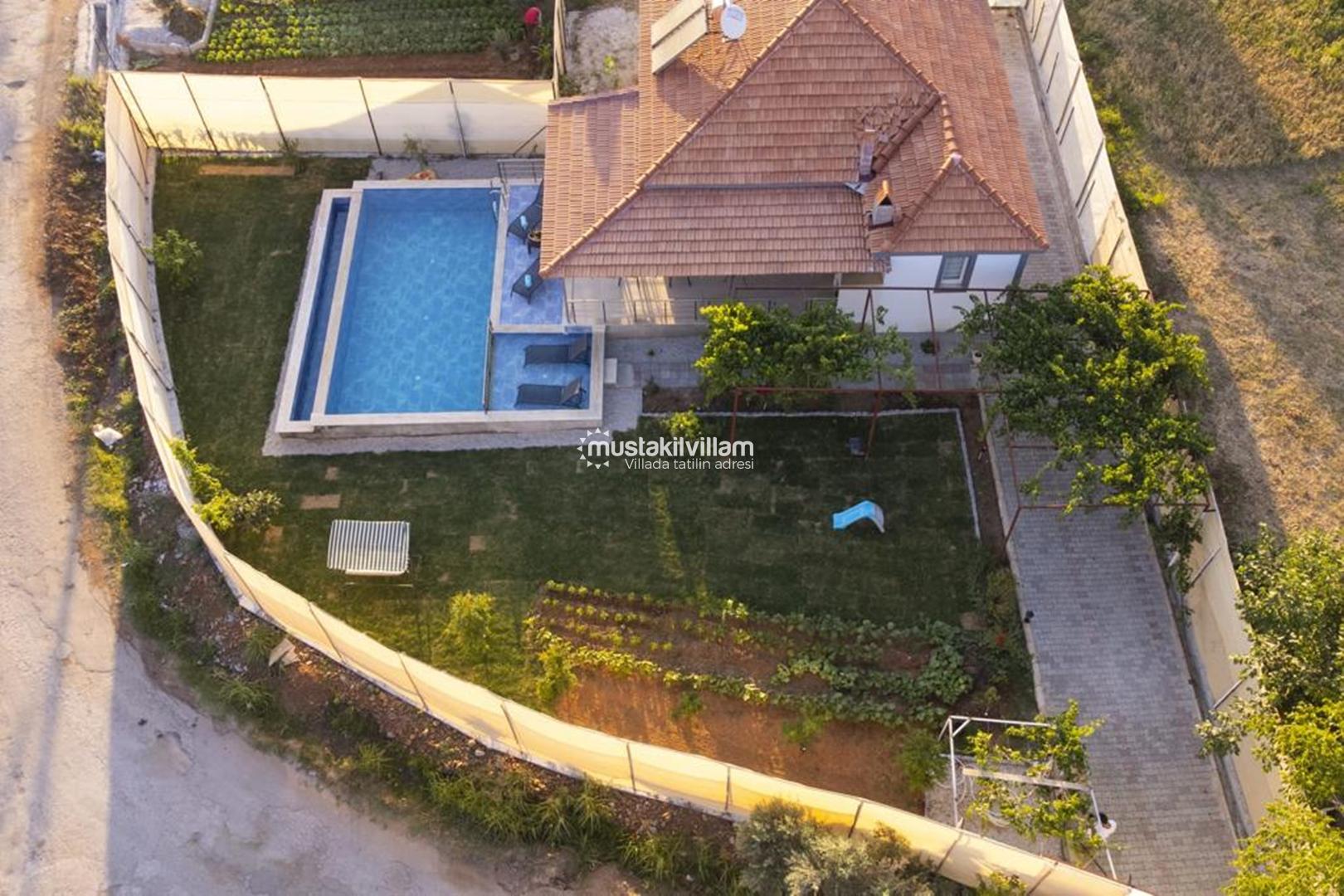 Villa Bahargülü’nün en dikkat çeken özelliklerinden biri özel yüzme havuzu ve geniş bahçe alanıdır.