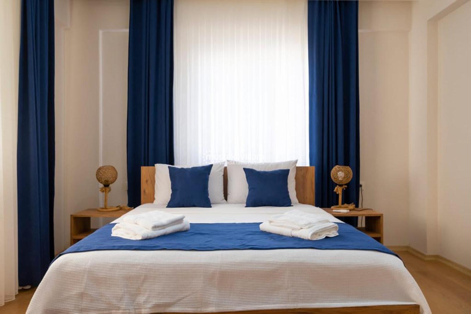 Birinci yatak odasında çift kişilik yatak bulunmaktadır. Bu oda özellikle balayı çiftleri veya ebeveynler için konforlu bir uyku alanı sunar. Oda içerisinde klima, komodin ve elbise dolabı gibi temel donanımlar yer almaktadır.