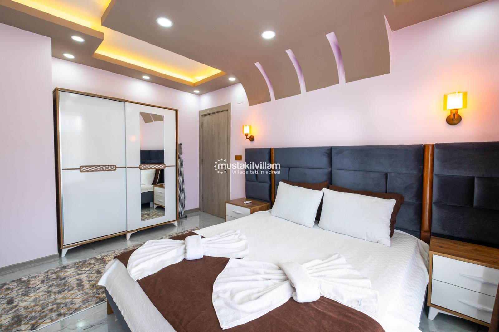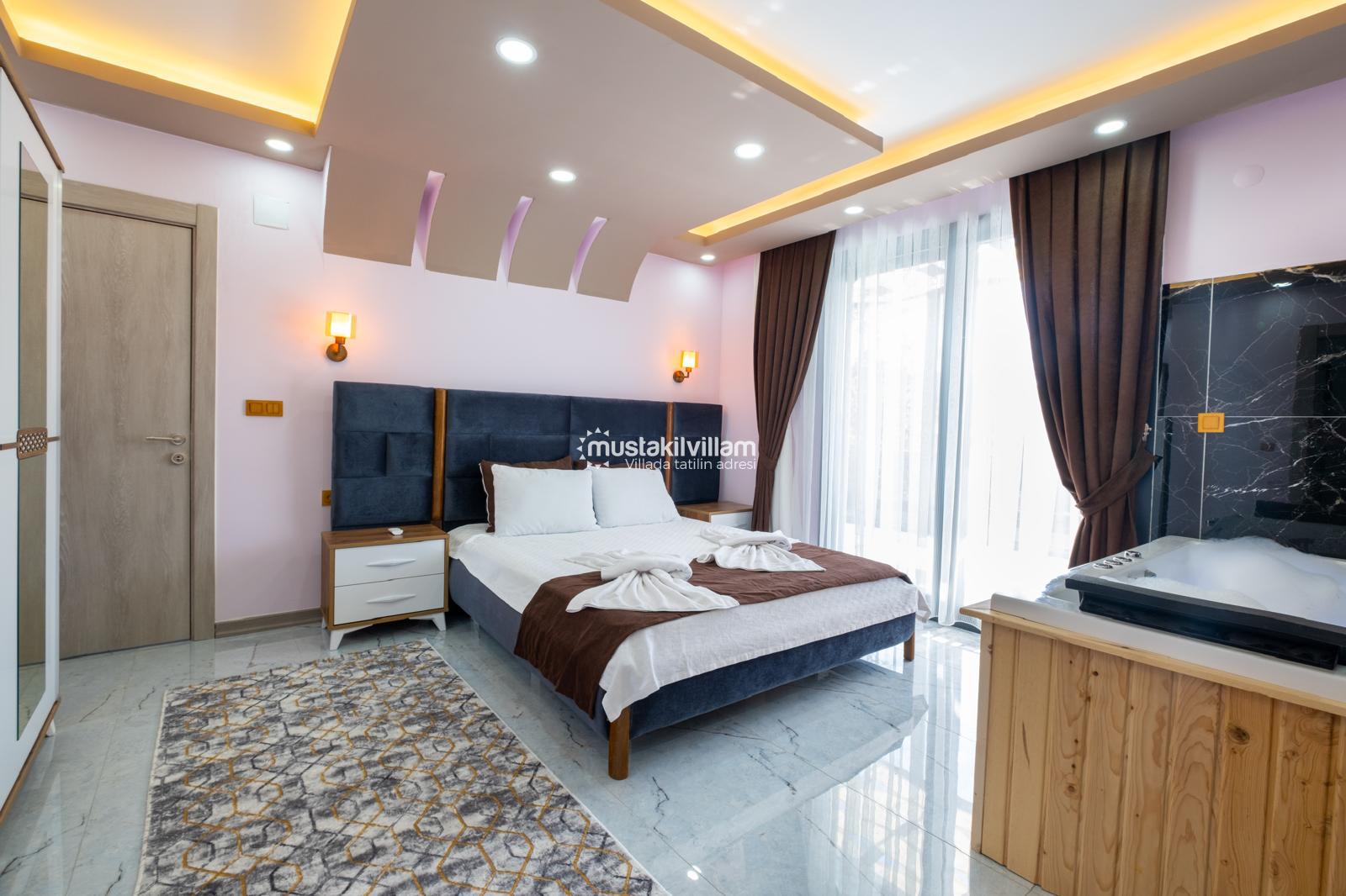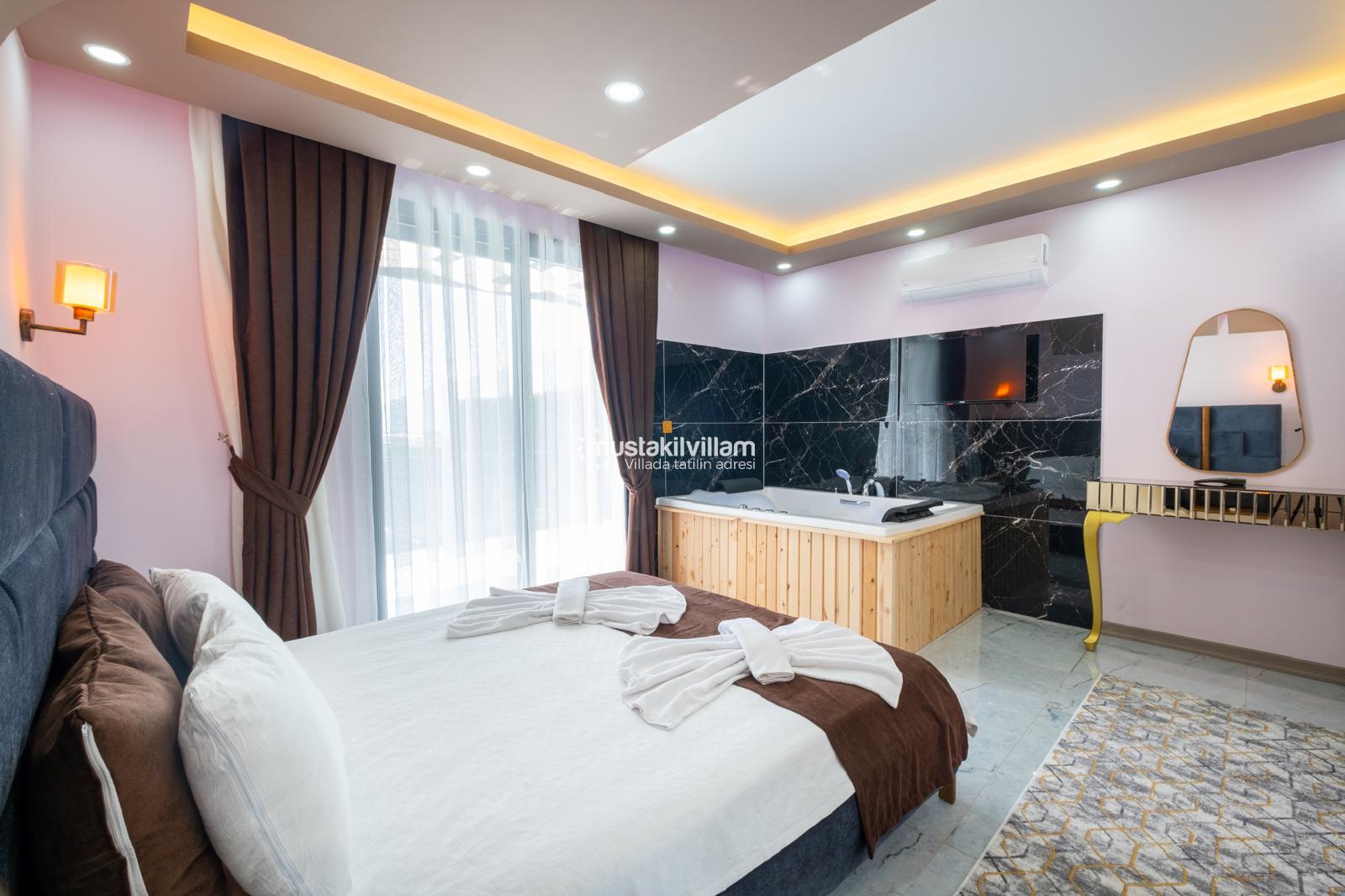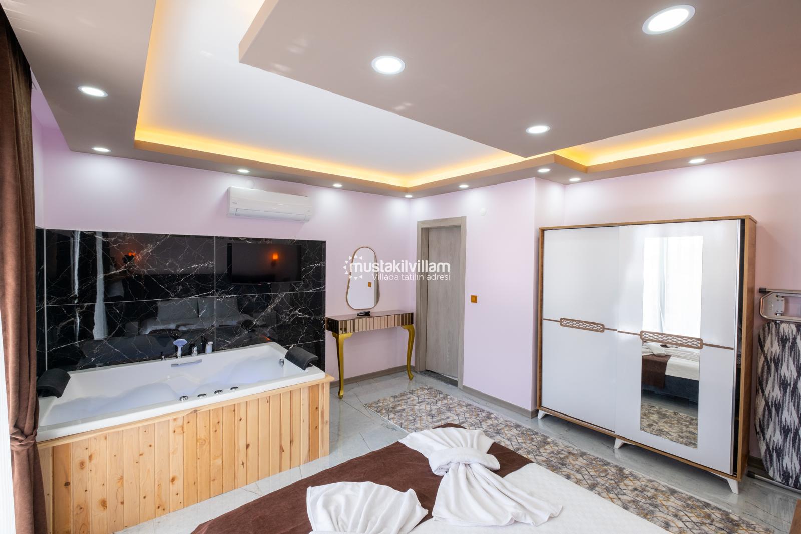 Çift kişilik yatak, elbise dolabı, komodin, klima, ebeveyn banyosu (WC-Duş) ve jakuzi bulunmaktadır. Özellikle balayı çiftleri için oldukça konforlu bir alan sunar.