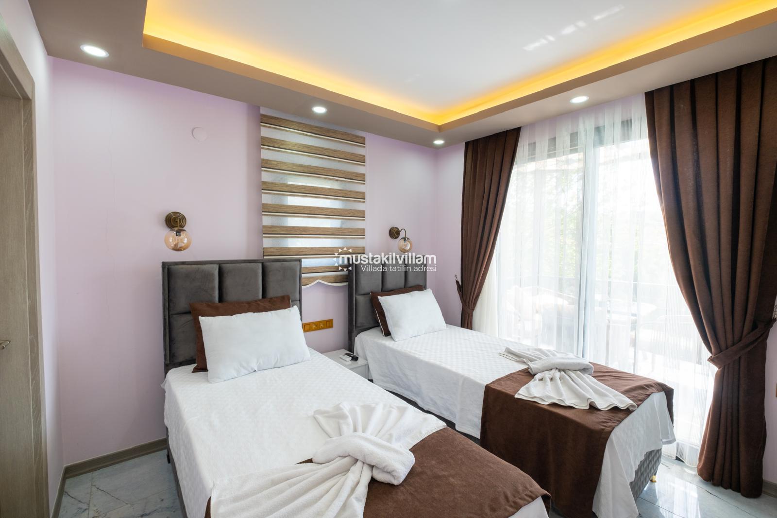 2 adet tek kişilik yatak, elbise dolabı, komodin, klima ve ebeveyn banyosu (WC-Duş) yer almaktadır.