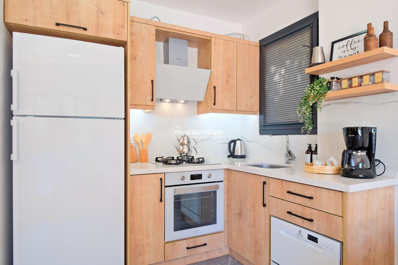 Modern mutfak donanımı: Buzdolabı, bulaşık makinesi, çamaşır makinesi, ankastre ocak-fırın ve temel mutfak gereçleri