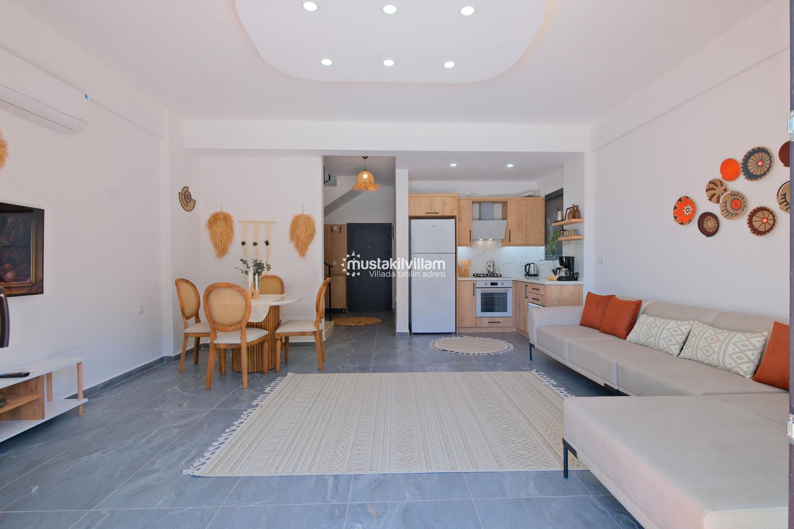 Açık plan salon ve Amerikan mutfak: Konforlu oturma grubu, uydu TV, klima ve havuz terasına direkt çıkış