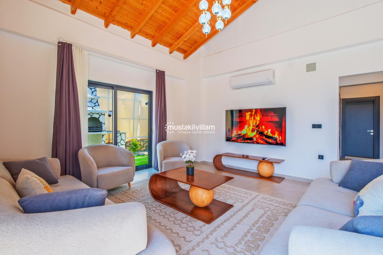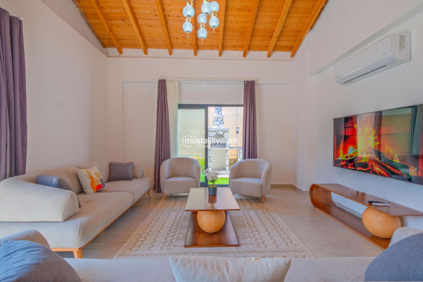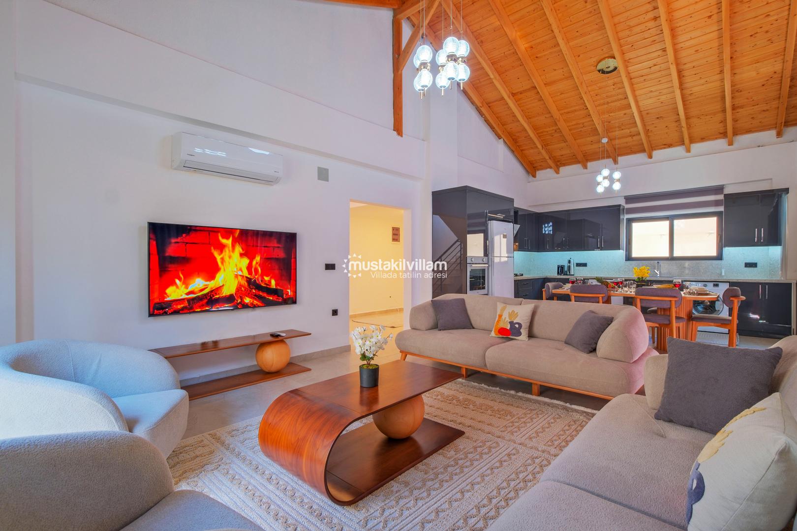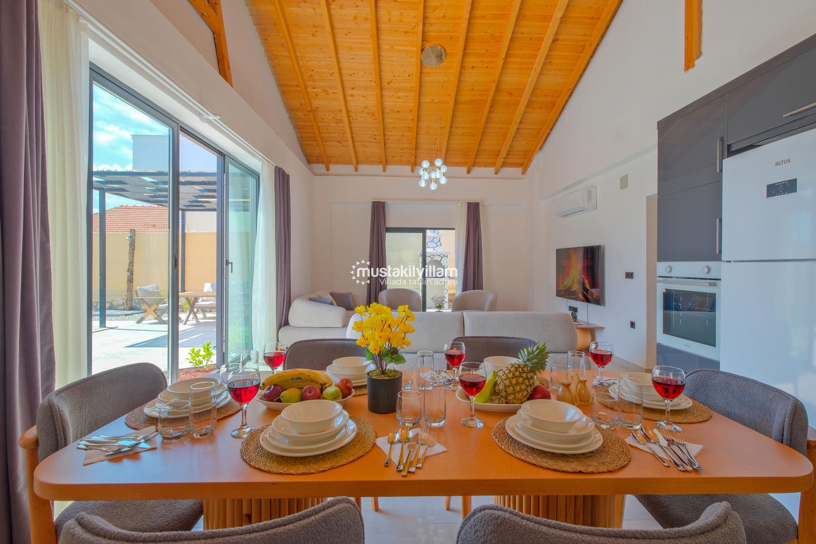 Villamızda klimalı salon ve açık plan mutfak bulunmaktadır. Modern mobilyalarla döşenmiş salon bölümünde TV ve uydu alıcısı yer almakta olup, geniş cam kapılar sayesinde havuz terasına doğrudan çıkış sağlanmaktadır.