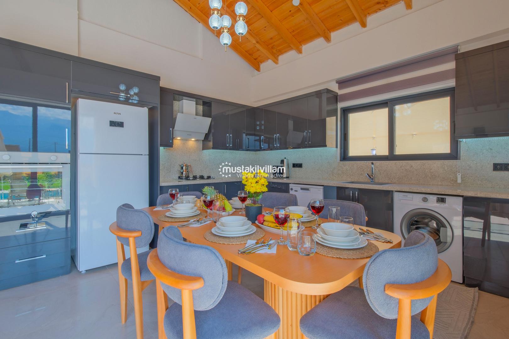 Tam donanımlı mutfakta; buzdolabı, ankastre ocak-fırın, mikrodalga, bulaşık makinesi, çamaşır makinesi, kapsül kahve makinesi ve temel mutfak ekipmanları yer almaktadır. Tatil süresince ihtiyaç duyabileceğiniz tüm detaylar düşünülmüştür.