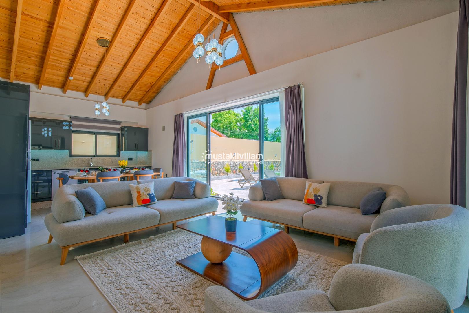 Villamızda klimalı salon ve açık plan mutfak bulunmaktadır. Modern mobilyalarla döşenmiş salon bölümünde TV ve uydu alıcısı yer almakta olup, geniş cam kapılar sayesinde havuz terasına doğrudan çıkış sağlanmaktadır.