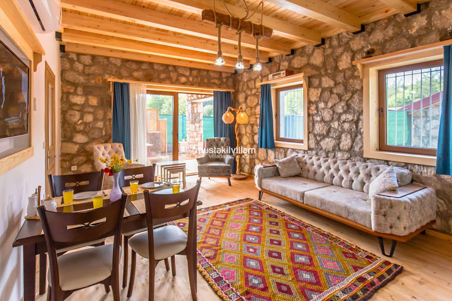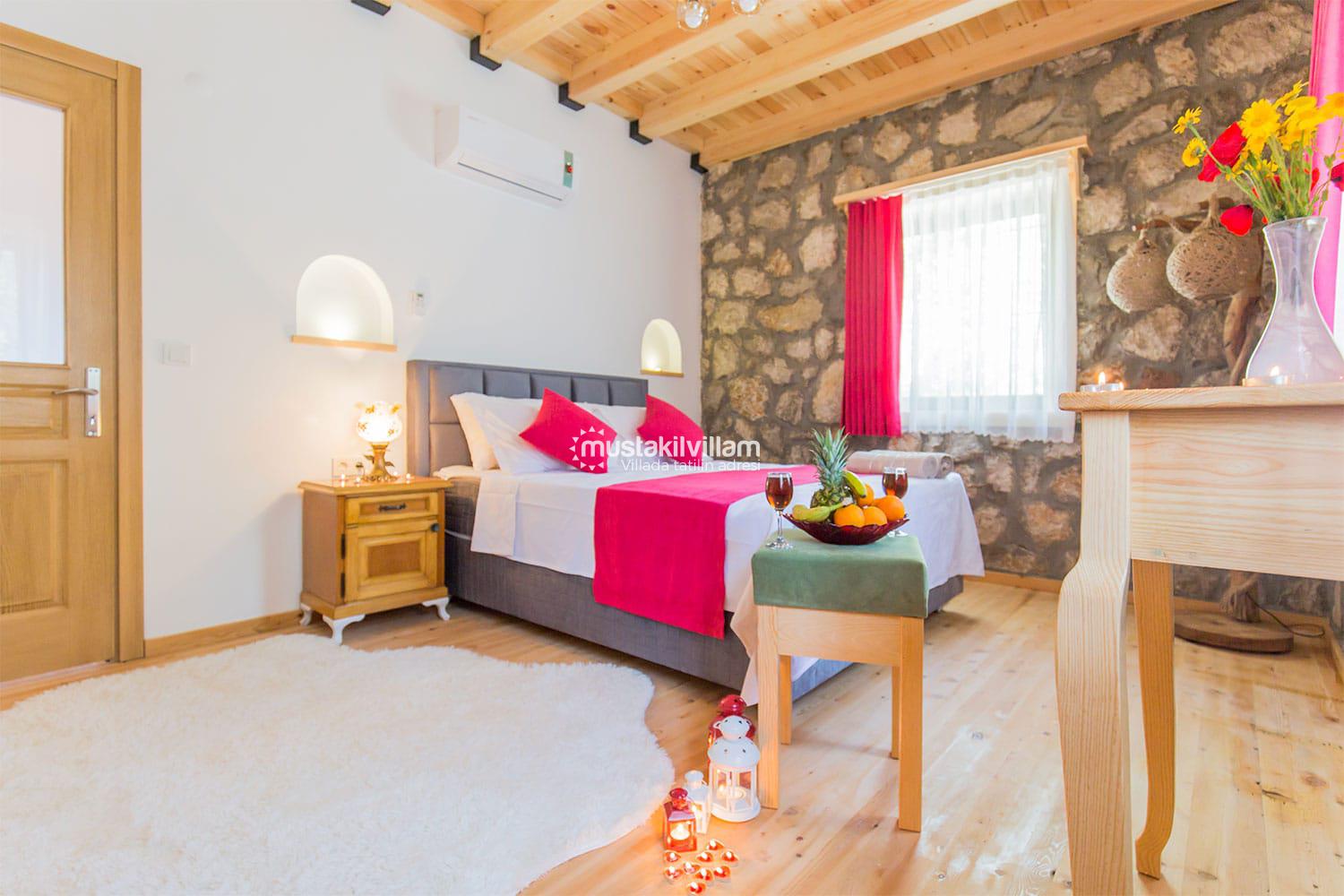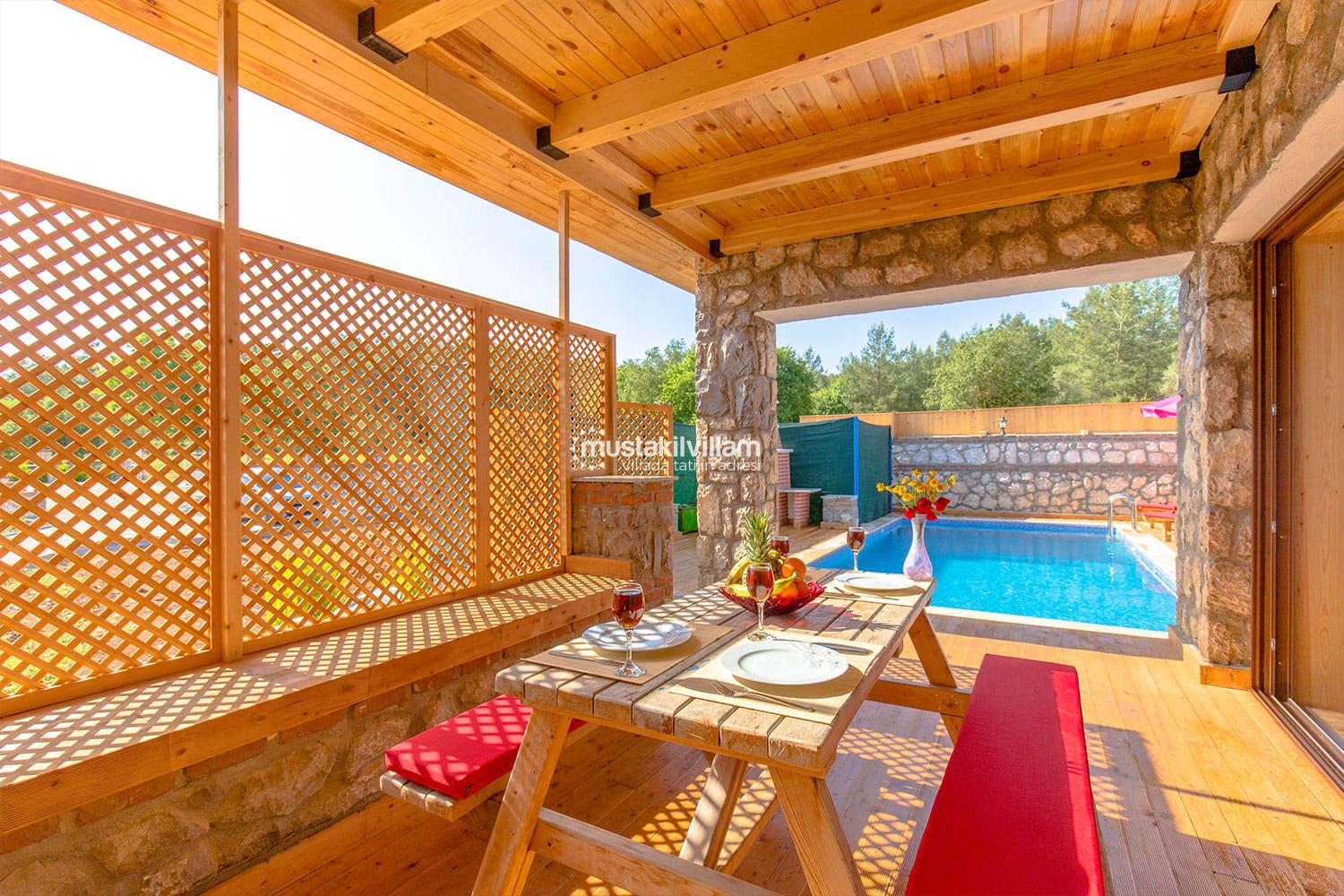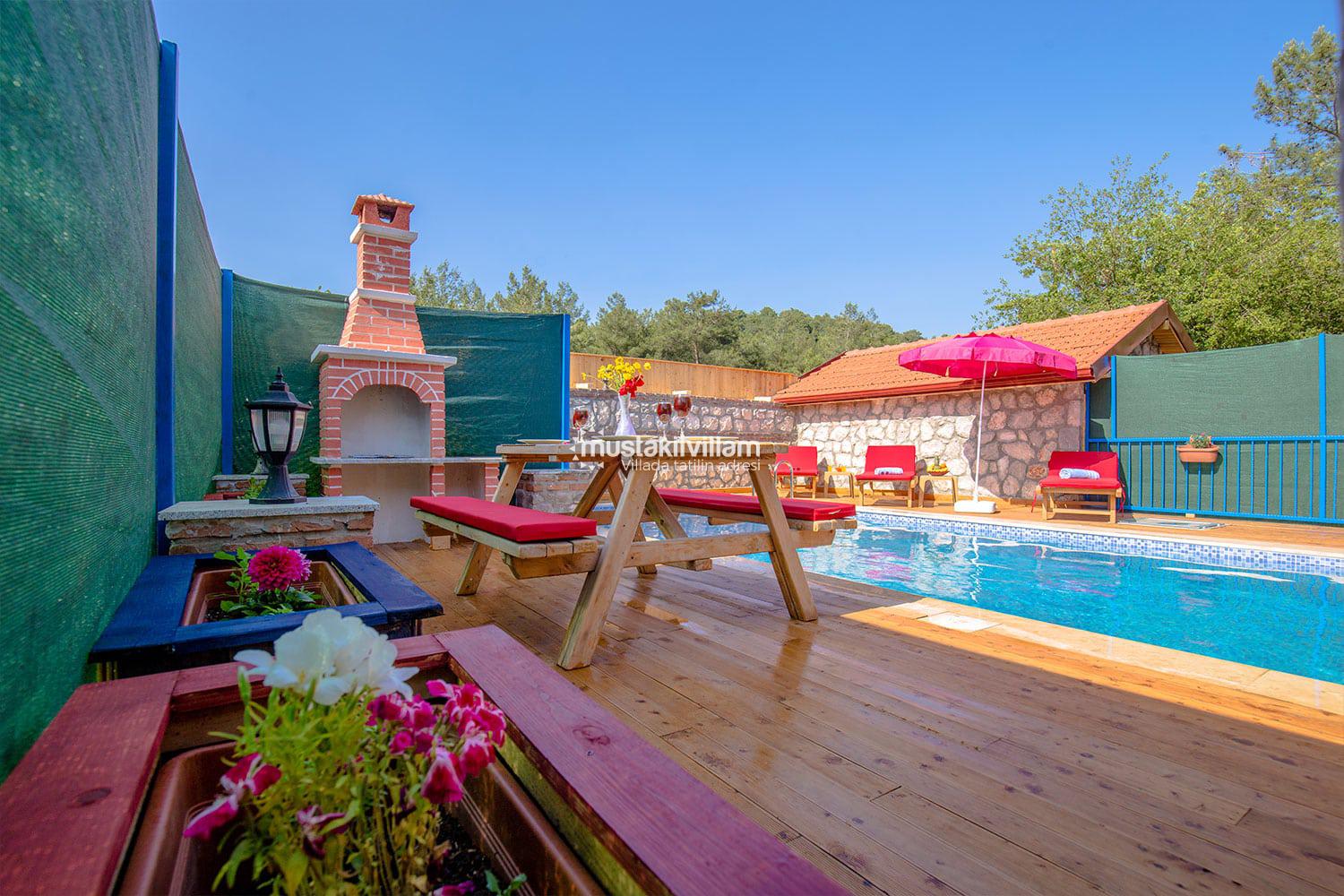 En çok tercih edilen tatil beldelerimizden Fethiye Ovacık mevkiinde konumlu Villa Sultanım 2 yatak odasına sahip 4 kişi konaklama kapasiteli kiralık tatil villasıdır. Taş ve ahşap mimarinin bir arada kullanıldığı konforlu mobilyalarla dizayn edilmiş olan villamızın özel havuzu bulunmaktadır. Bahçe terası tam korunaklı olan villamız dışarıdan görünmemektedir, bu özelliğinden dolayı muhafazakar aile ve balayı çiftlerimiz için uygun tatil villa seçenekleri arasında yer alır. Bahçe terasında bulunan yemek masası ve barbeküde sevdiklerinizle birlikte keyifli sofralar kurabilir havuzda serinlemenin ve güneşlenmenin tadını çıkarabilirsiniz. Villamızda bulunan jakuzi de senenin tüm yorgunluğunu üzerinizden atıp rahatlama olanağına da sahipsiniz. Villamızın hemen yanında aynı tarz ve konseptte yer alan Villa Sevil yer almaktadır. Bu 2 villamız aynı anda kiralama imkanı ile toplamda 8 kişi konaklama kapasitesine sahiptir.