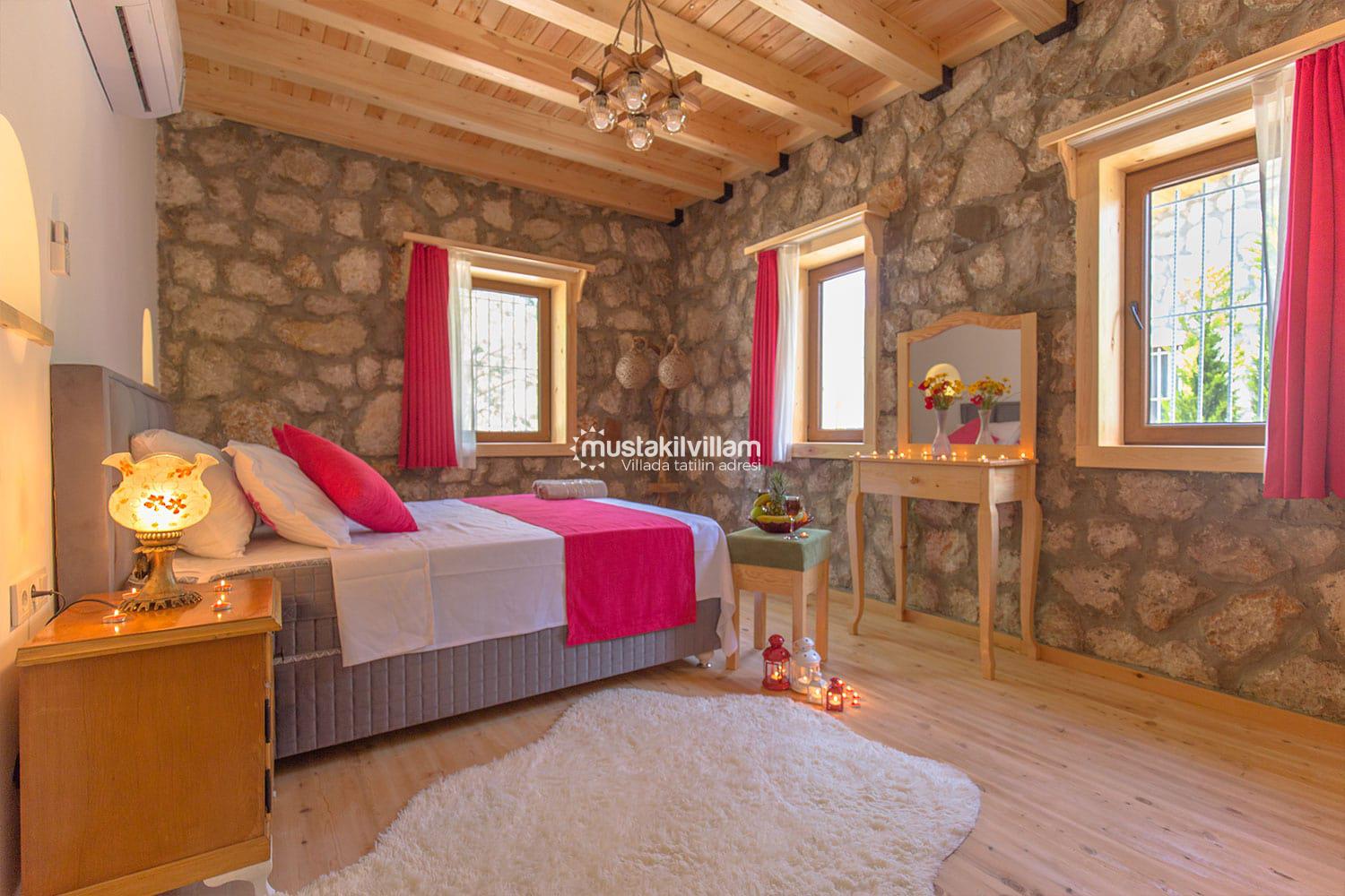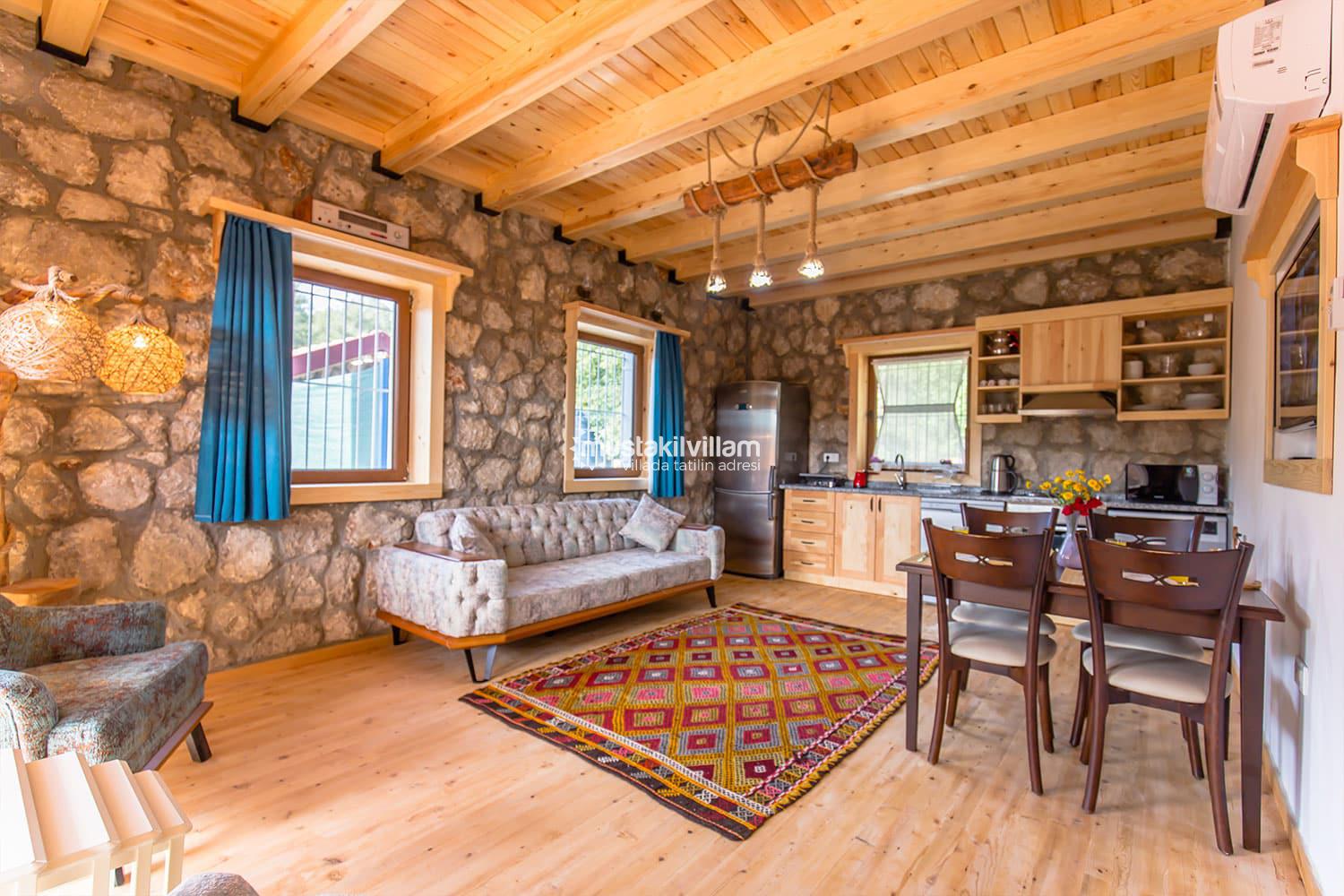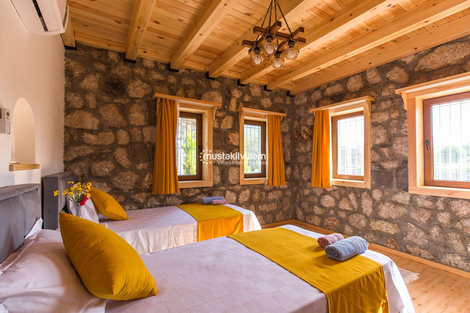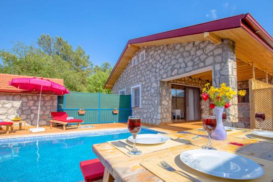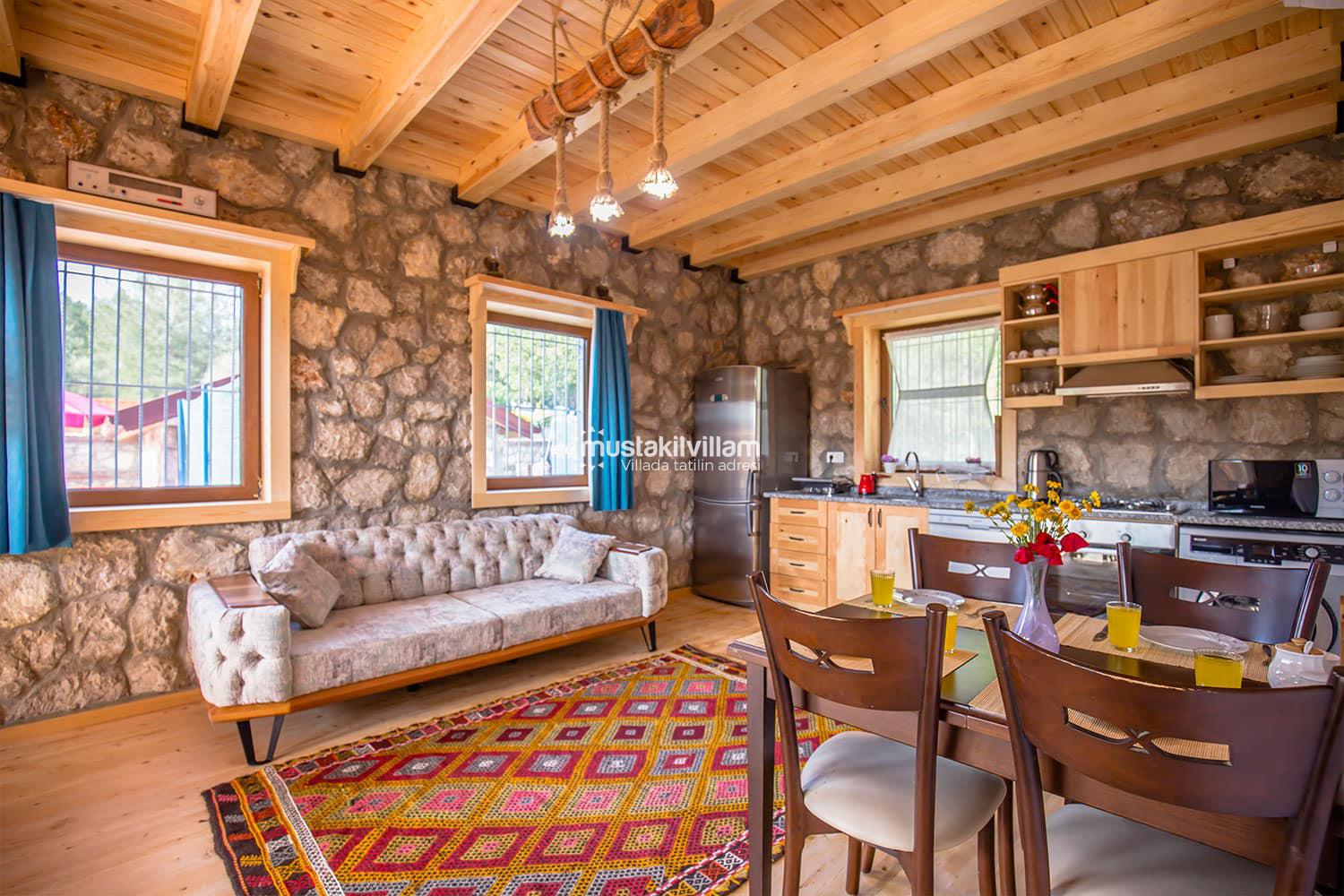 En çok tercih edilen tatil beldelerimizden Fethiye Ovacık mevkiinde konumlu Villa Sultanım 2 yatak odasına sahip 4 kişi konaklama kapasiteli kiralık tatil villasıdır. Taş ve ahşap mimarinin bir arada kullanıldığı konforlu mobilyalarla dizayn edilmiş olan villamızın özel havuzu bulunmaktadır. Bahçe terası tam korunaklı olan villamız dışarıdan görünmemektedir, bu özelliğinden dolayı muhafazakar aile ve balayı çiftlerimiz için uygun tatil villa seçenekleri arasında yer alır. Bahçe terasında bulunan yemek masası ve barbeküde sevdiklerinizle birlikte keyifli sofralar kurabilir havuzda serinlemenin ve güneşlenmenin tadını çıkarabilirsiniz. Villamızda bulunan jakuzi de senenin tüm yorgunluğunu üzerinizden atıp rahatlama olanağına da sahipsiniz. Villamızın hemen yanında aynı tarz ve konseptte yer alan Villa Sevil yer almaktadır. Bu 2 villamız aynı anda kiralama imkanı ile toplamda 8 kişi konaklama kapasitesine sahiptir.