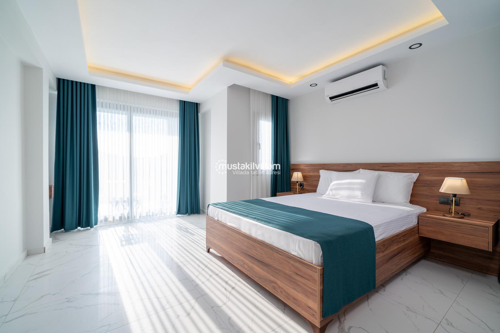 Çift kişilik yatak, klima, komodin, elbise dolabı ve özel banyo/WC bulunmaktadır.