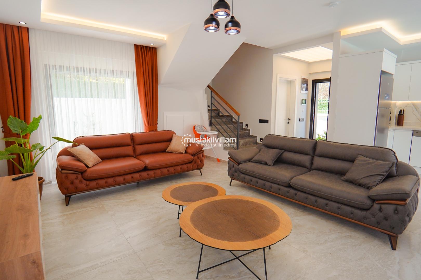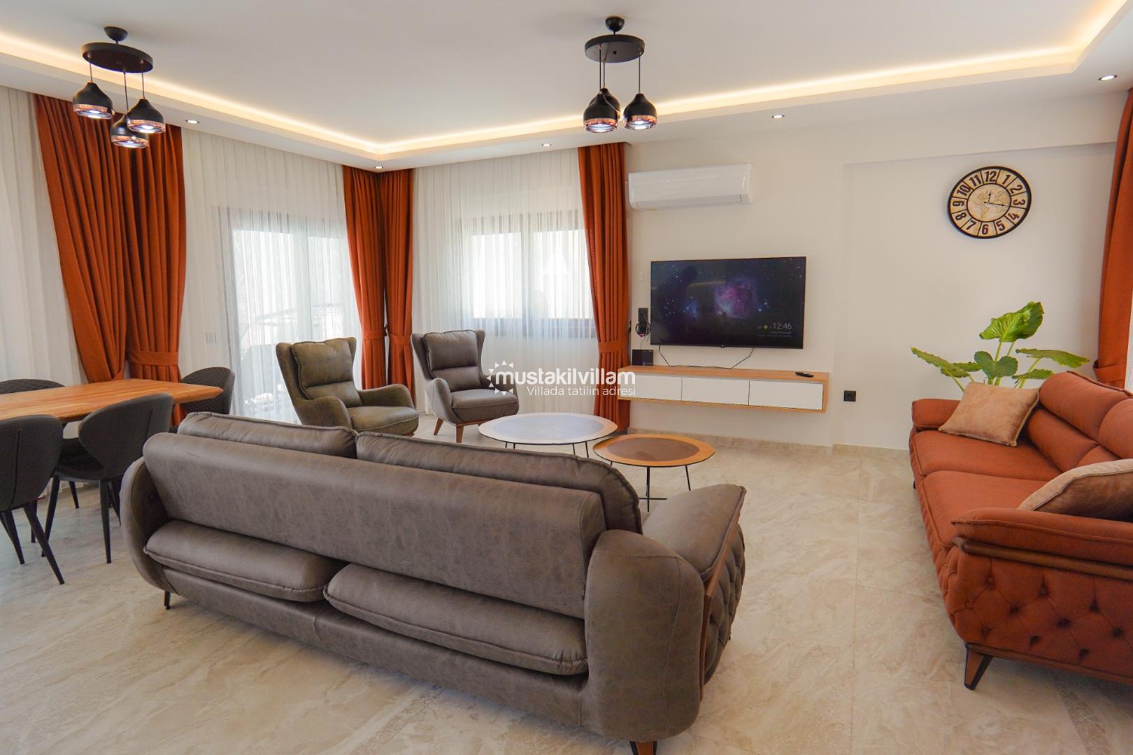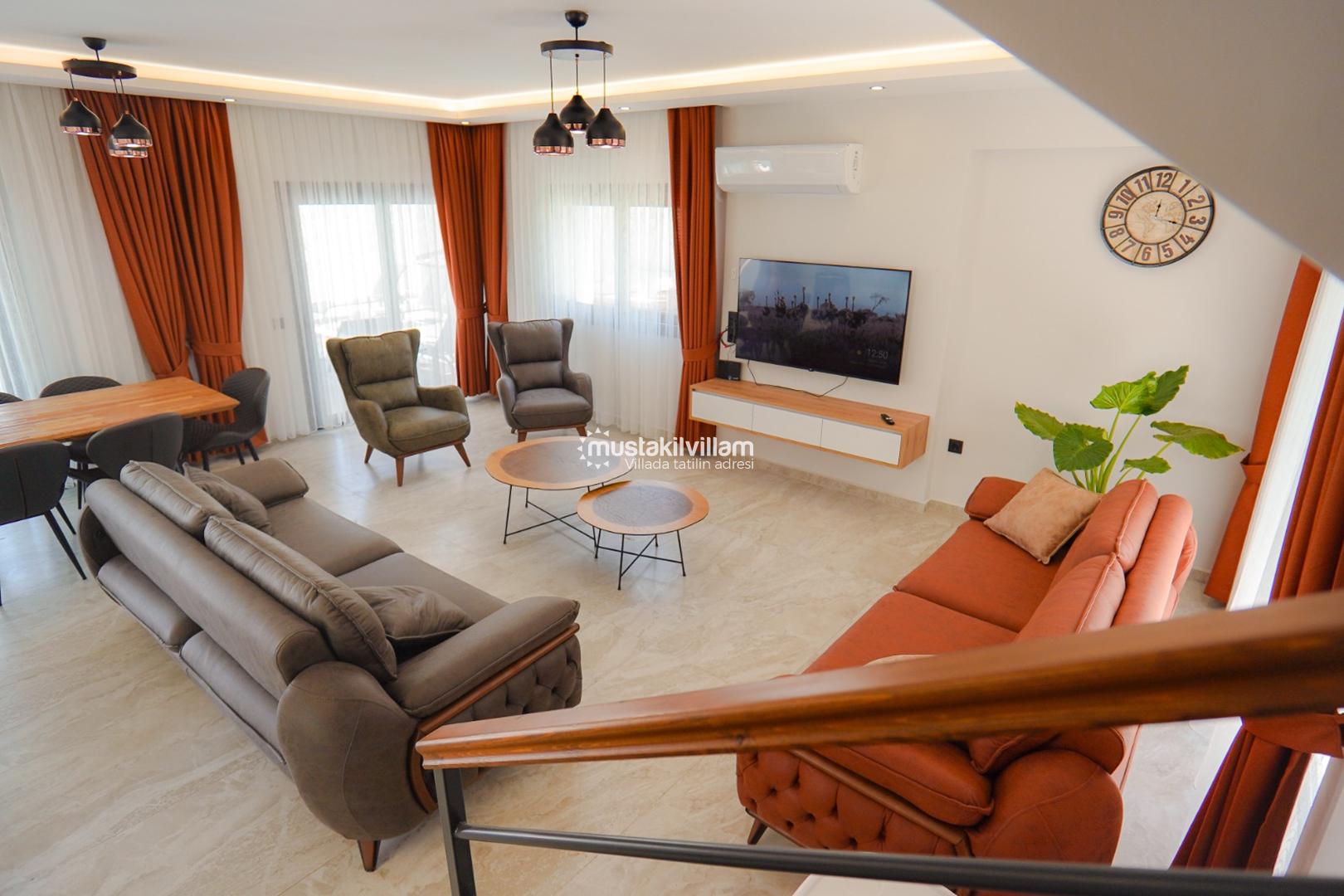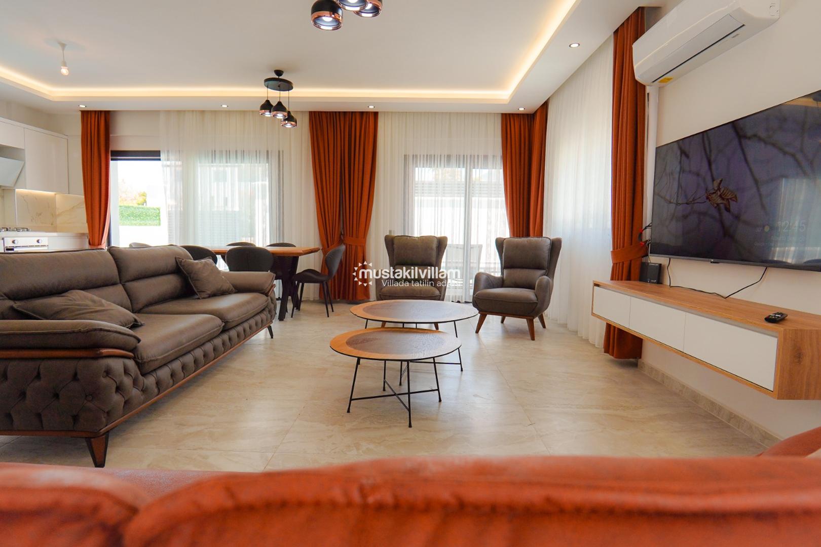 Villanın iç mekân tasarımı modern, şık ve kullanışlı detaylarla donatılmıştır. Geniş ve ferah salon alanı, konforlu oturma grubu ile dekore edilmiş olup klima, LCD televizyon ve uydu alıcısı gibi olanaklarla desteklenmiştir. Salon bölümünden doğrudan havuz terasına çıkış imkânı bulunmakta ve bu sayede iç ve dış yaşam alanları arasında doğal bir geçiş sağlanmaktadır. Bu özellik, özellikle yaz aylarında açık hava yaşamını daha keyifli hale getirmektedir.