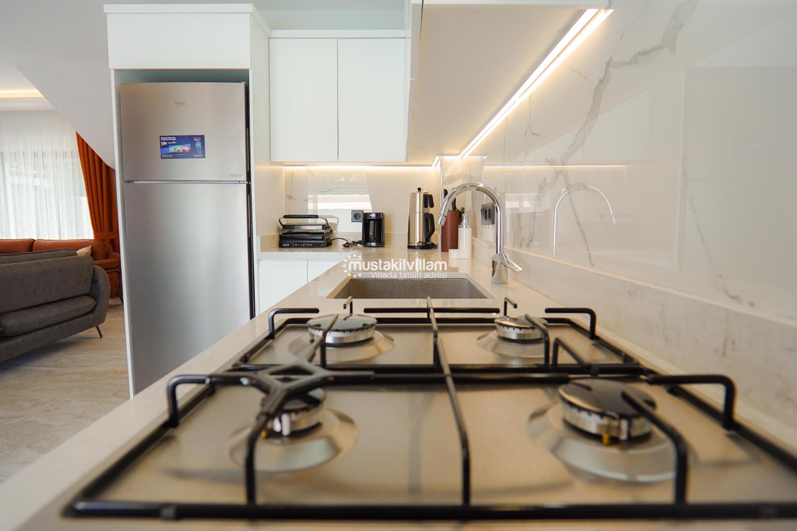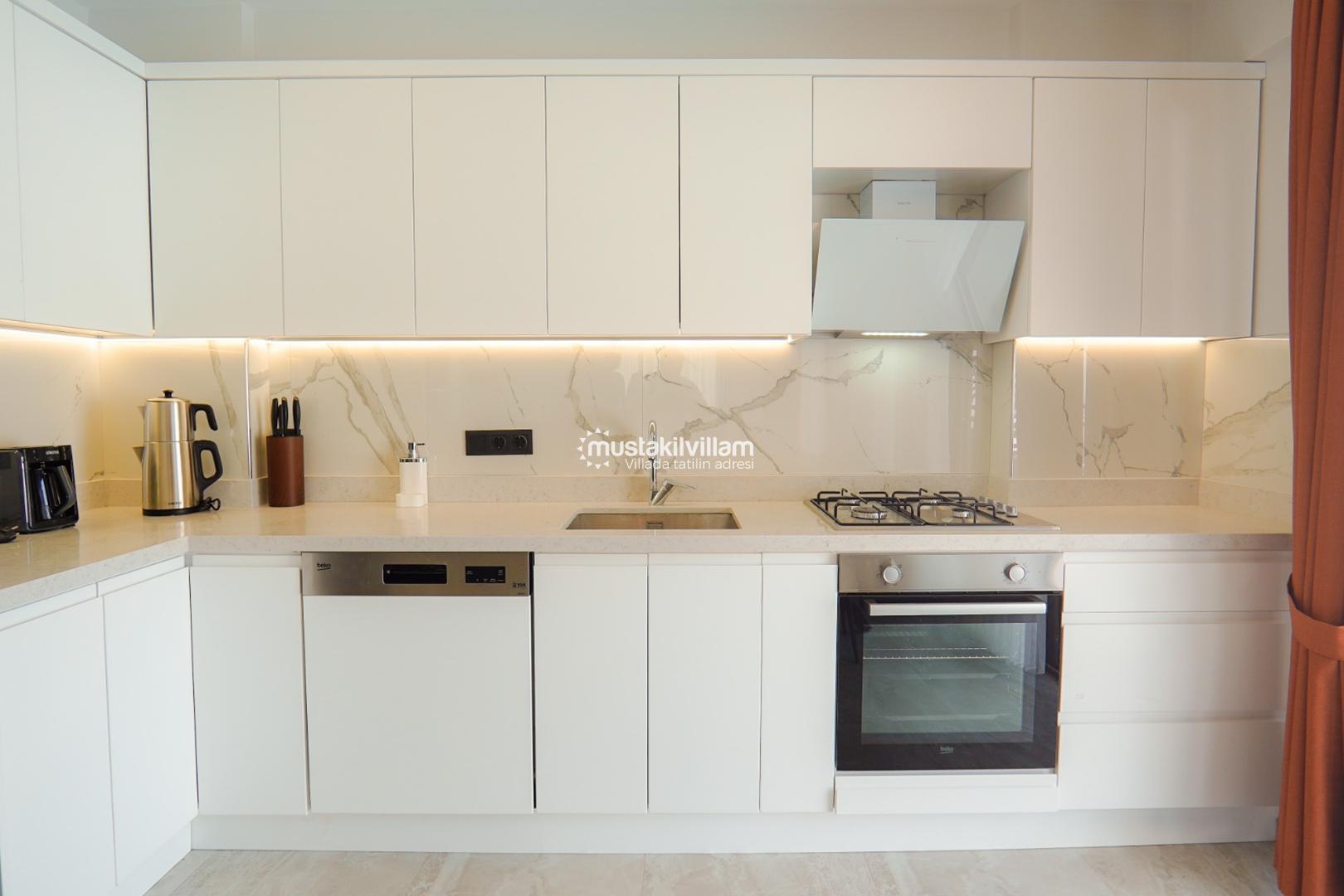 Açık mutfak konsepti ile tasarlanmış olan mutfak alanı, tatil boyunca ihtiyaç duyulabilecek tüm ekipmanlara sahiptir. Buzdolabı, bulaşık makinesi, çamaşır makinesi, fırın, ocak, kettle ve mutfak gereçleri gibi birçok detay eksiksiz şekilde sunulmuştur. Misafirler, diledikleri zaman kendi yemeklerini hazırlayarak ev konforunda bir tatil deneyimi yaşayabilirler.