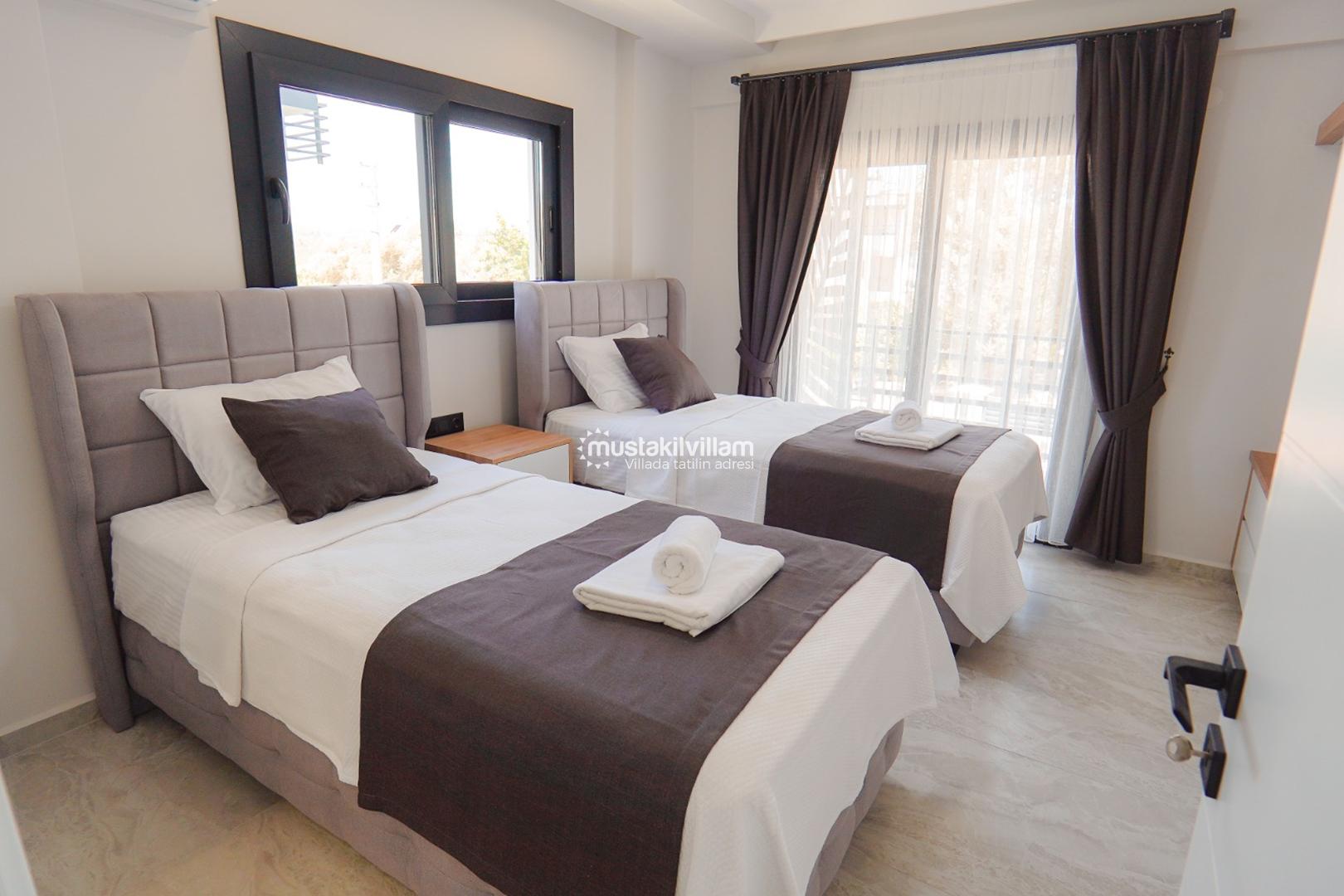 İkinci yatak odasında çift kişilik yatak, klima ve özel banyo/WC yer alırken; üçüncü yatak odasında iki adet tek kişilik yatak bulunmaktadır. Bu yataklar isteğe bağlı olarak birleştirilebilir ve çift kişilik kullanım imkânı sunar. Tüm odalar ferah, aydınlık ve konforlu bir konaklama deneyimi sunacak şekilde dizayn edilmiştir.