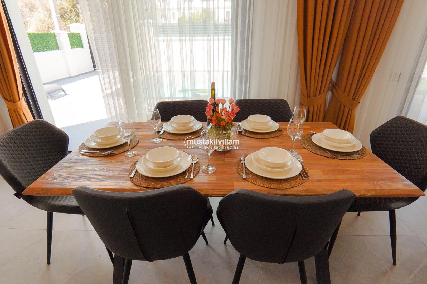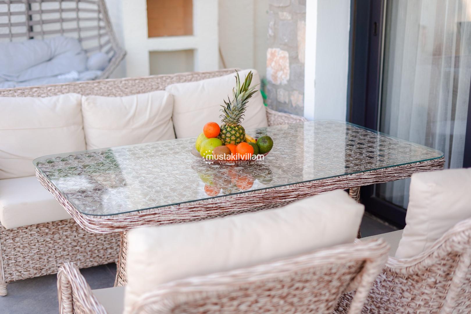 Havuz çevresi şezlonglar, güneş şemsiyeleri, veranda oturma alanı ve bahçe mobilyaları ile donatılmıştır. Ayrıca barbekü/mangal alanı sayesinde misafirler açık havada keyifli yemekler hazırlayabilir ve sevdikleriyle birlikte unutulmaz akşamlar geçirebilirler. Bahçede bulunan salıncak gibi detaylar ise hem çocuklar hem de yetişkinler için eğlenceli bir atmosfer sunmaktadır.