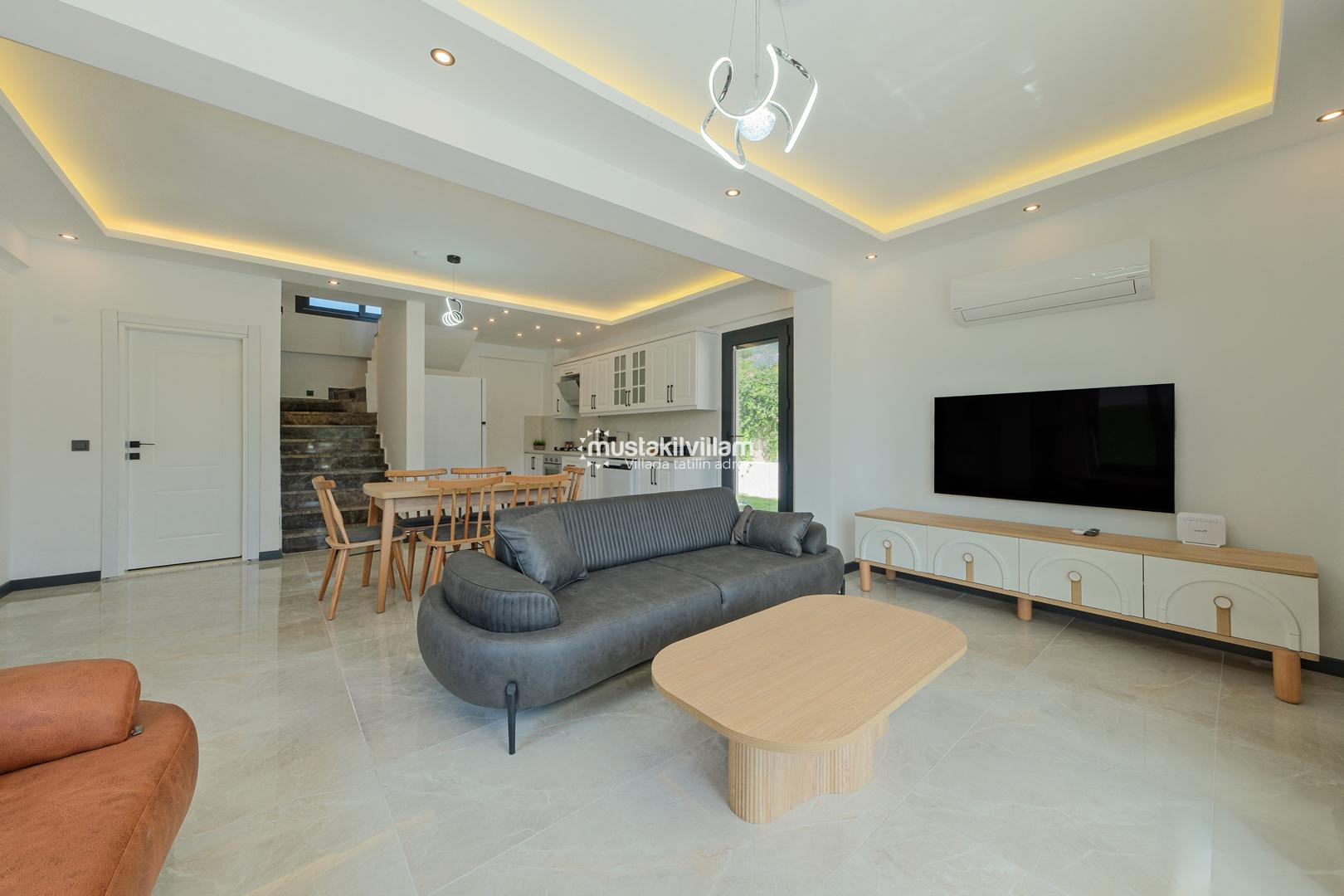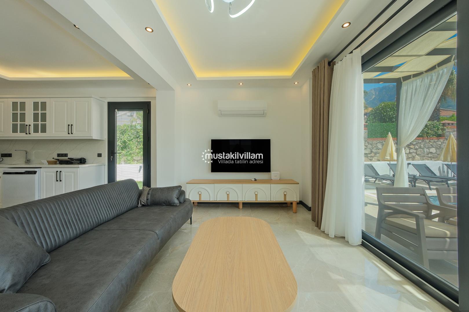 Salon bölümünde konforlu oturma grubu, televizyon ve klima bulunur. Geniş cam kapılar sayesinde gün ışığı iç mekâna bolca girer ve yaşam alanı daha da ferah bir hale gelir. Tatil boyunca hem dinlenmek hem de keyifli vakit geçirmek için ideal bir ortam sunar.