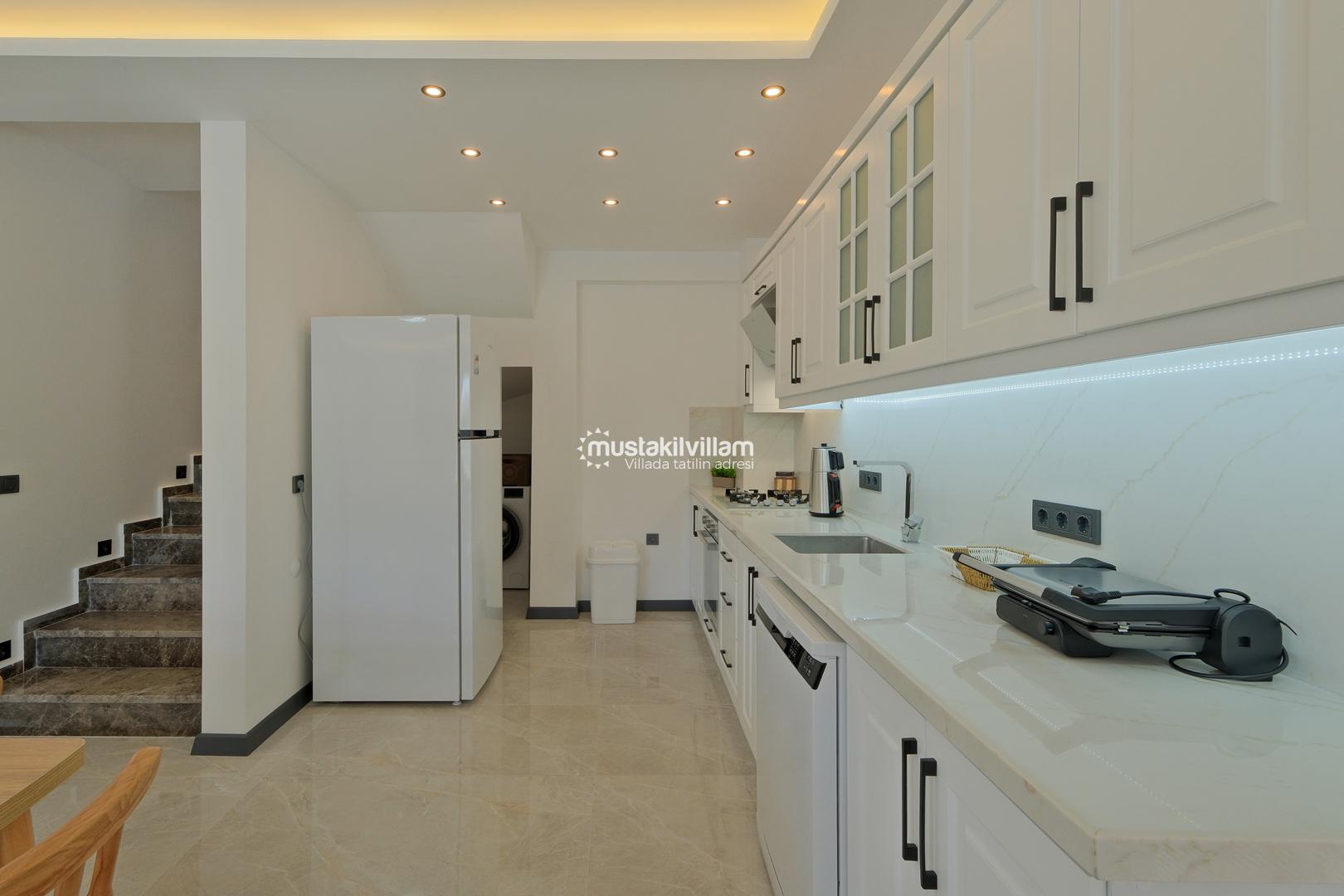 Villa iç tasarımında modernlik ve işlevsellik ön planda tutulmuştur. Açık plan salon ve mutfak alanı, geniş ve ferah yapısıyla dikkat çekerken aynı zamanda doğrudan havuz terasına açılarak iç ve dış mekân arasında kusursuz bir geçiş sağlar.