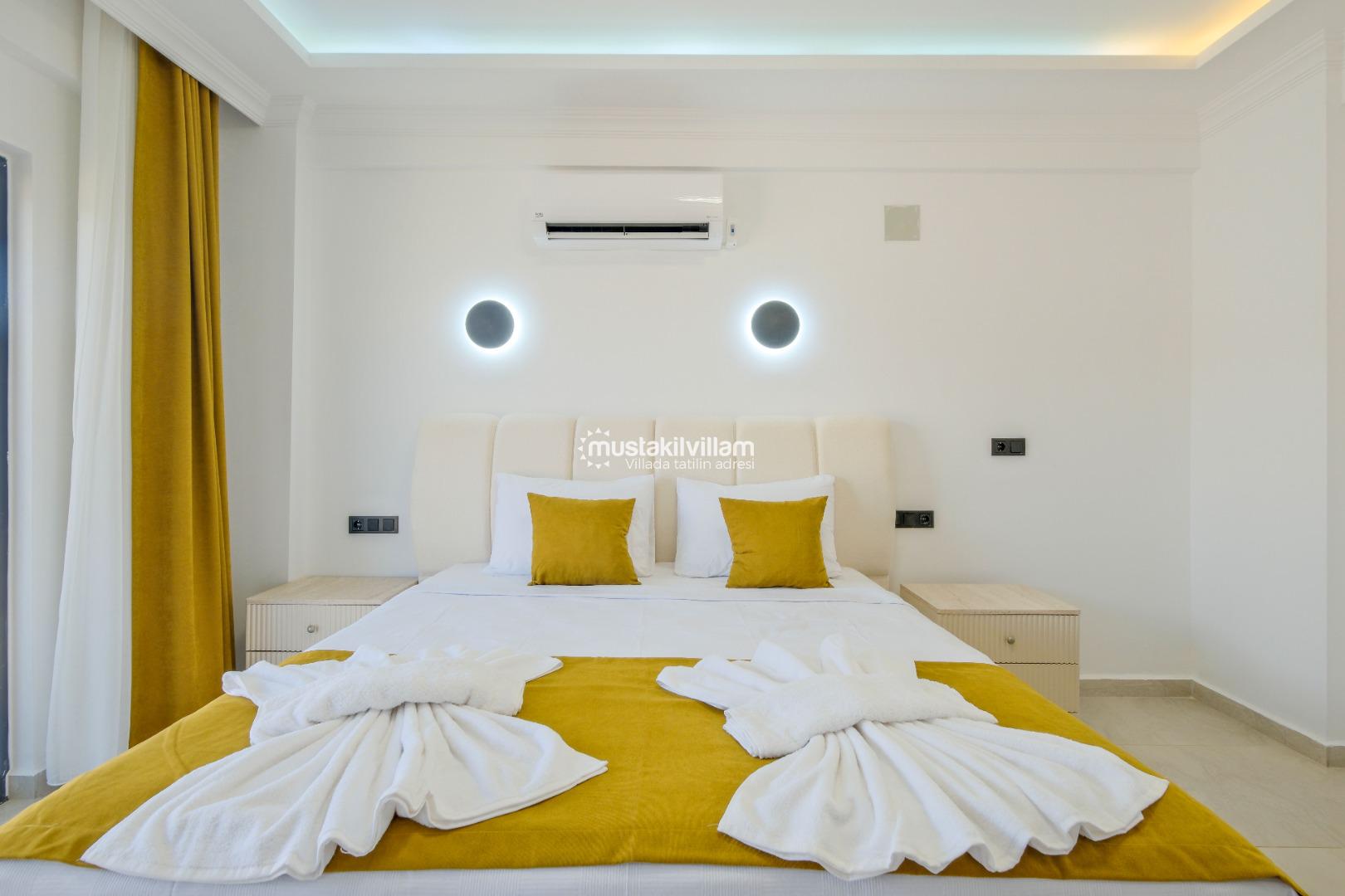 İlk iki yatak odası kendi banyosuna sahip olup, diğer iki oda ortak banyoyu kullanır. Bu düzenleme, geniş aileler ve arkadaş gruplarının konforlu ve rahat bir şekilde konaklamasını sağlar. Her odada klima ve geniş depolama alanları mevcuttur.