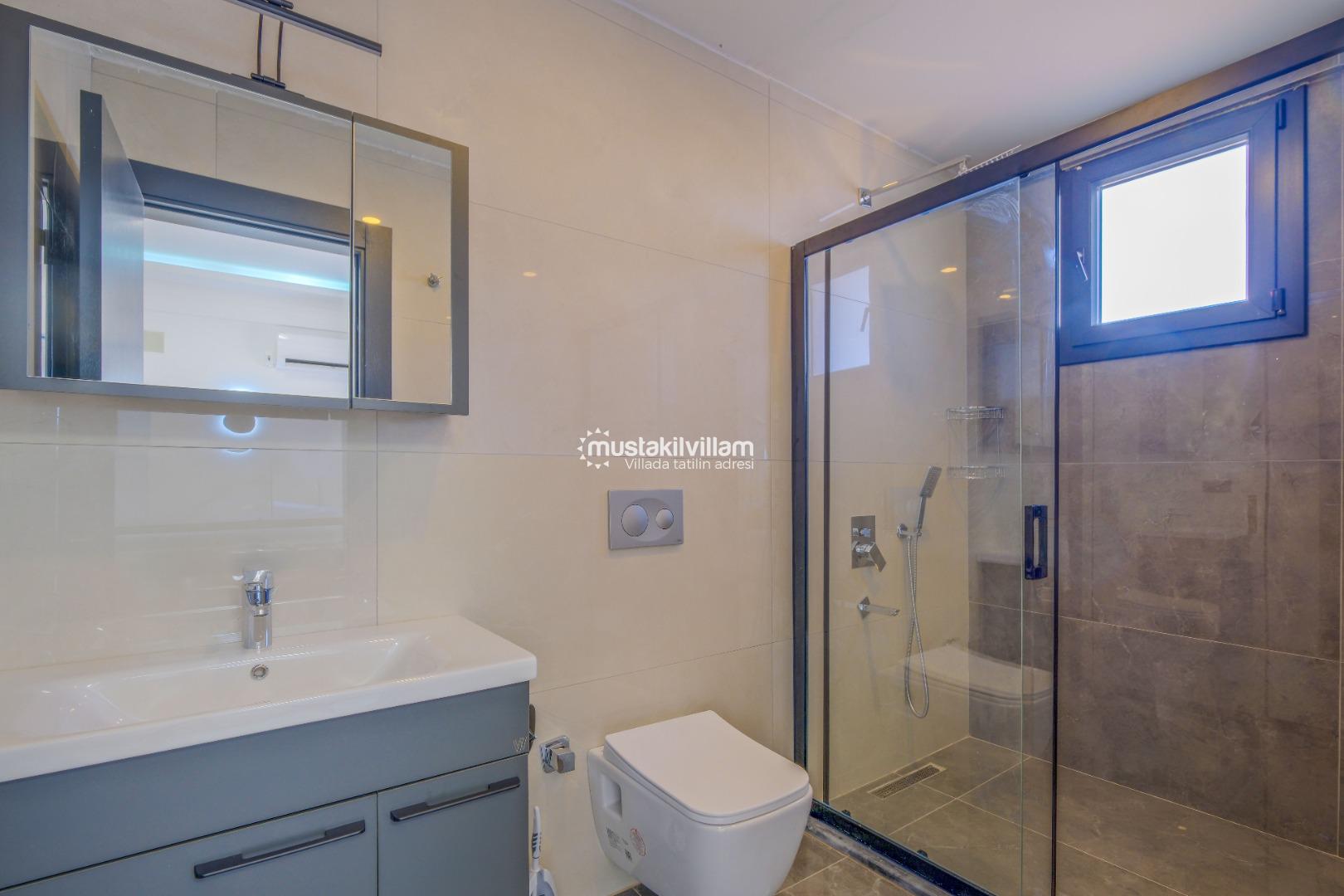 Toplam iki banyoya sahip villa, modern ve fonksiyonel dizaynı ile misafirlere rahat kullanım sunar. İlk iki odadaki ebeveyn banyoları özellikle konforlu bir alan yaratırken, ortak banyo tüm misafirlerin ihtiyaçlarına cevap verecek şekilde tasarlanmıştır.
