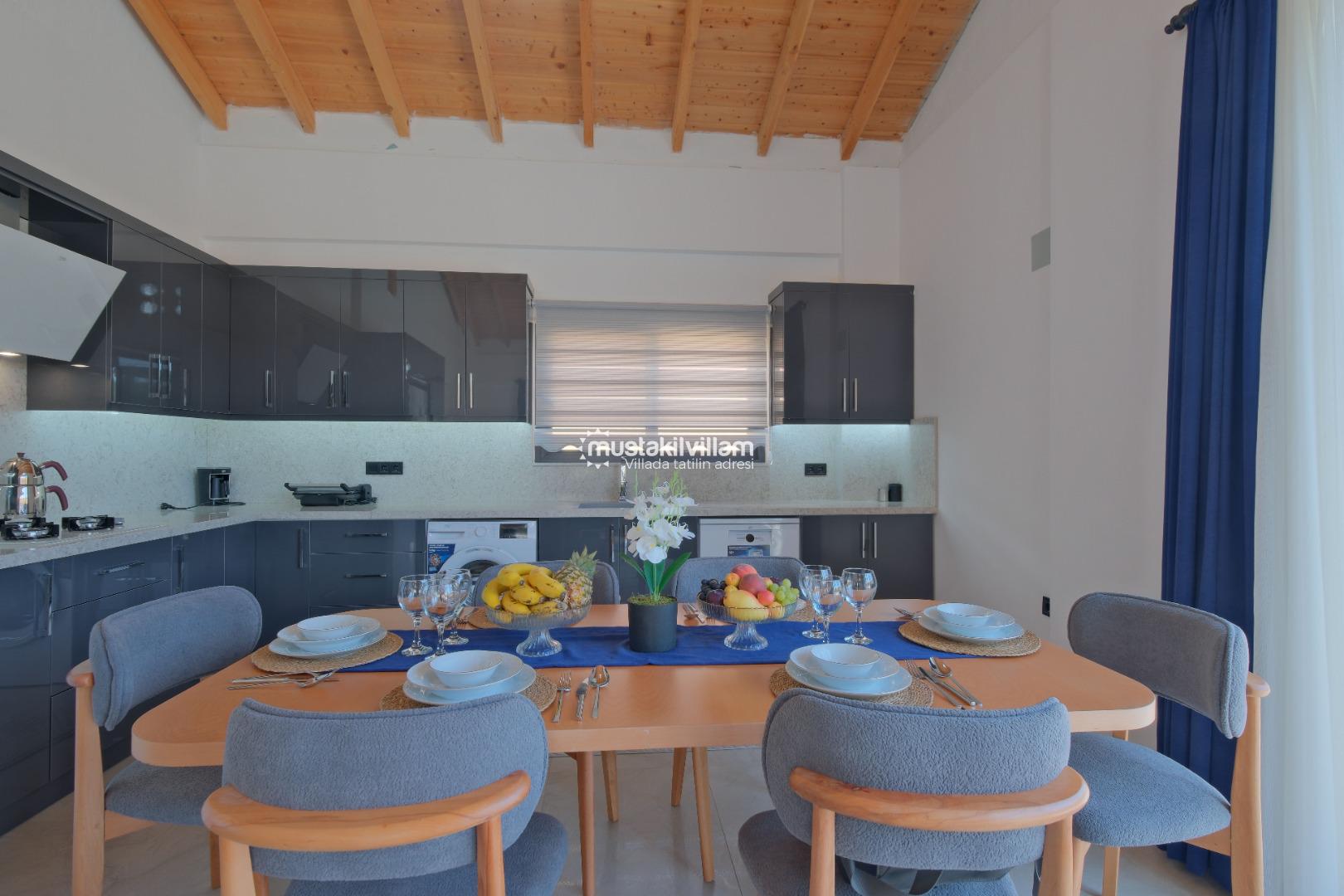 Tam donanımlı Amerikan mutfakta; geniş buzdolabı, bulaşık makinesi, çamaşır makinesi, ocak, fırın ve tüm mutfak gereçleri yer alır. Mutfak, kalabalık grupların birlikte yemek hazırlayabileceği şekilde tasarlanmıştır. Açık hava yemek alanıyla kombinlenerek akşam yemeklerinizi bahçede keyifli bir şekilde geçirebilirsiniz.