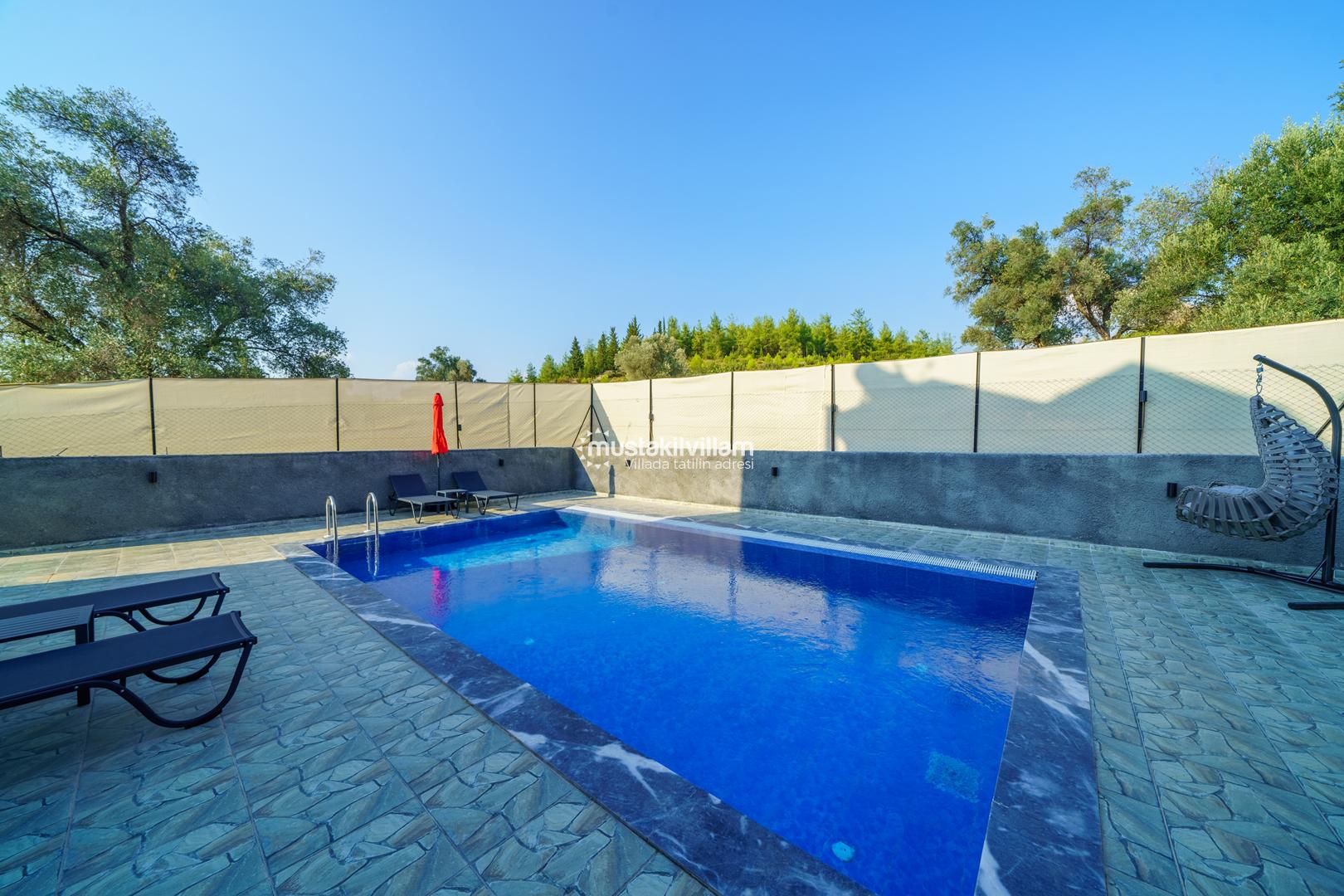Villa Busem’in en öne çıkan özelliklerinden biri korunaklı yapıya sahip özel yüzme havuzudur. Yaklaşık 8 metre uzunluğunda ve 4 metre genişliğindeki havuz, dışarıdan görünmeyecek şekilde tasarlanmış olup mahremiyete önem veren misafirler için ideal bir ortam sunar.