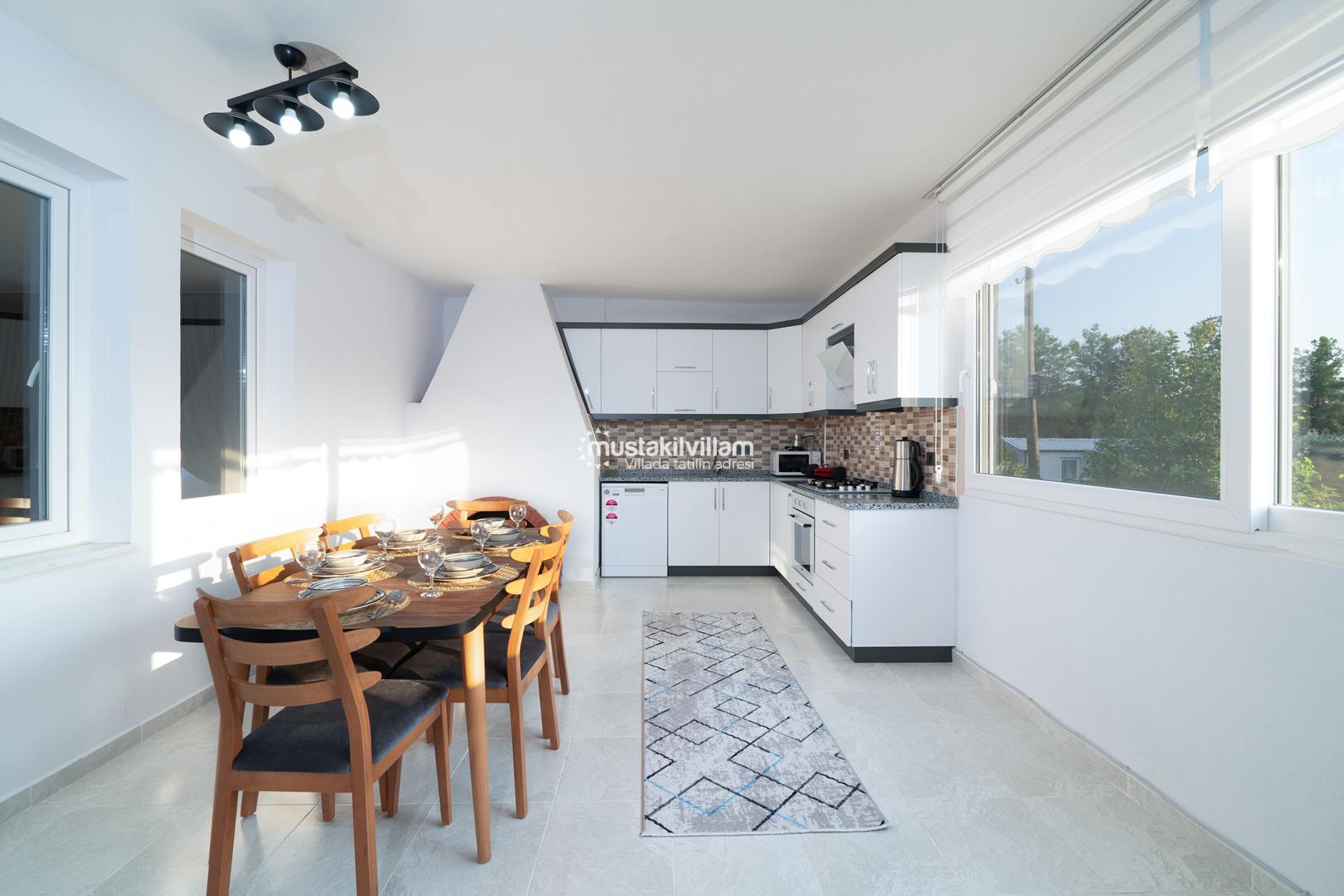 Açık plan Amerikan mutfak, tatil boyunca ihtiyaç duyabileceğiniz tüm ekipmanlara sahiptir. Buzdolabı, fırın, ocak, bulaşık makinesi ve çeşitli mutfak gereçleri sayesinde kendi yemeklerinizi kolaylıkla hazırlayabilir, evinizdeki rahatlığı tatilde de yaşayabilirsiniz.