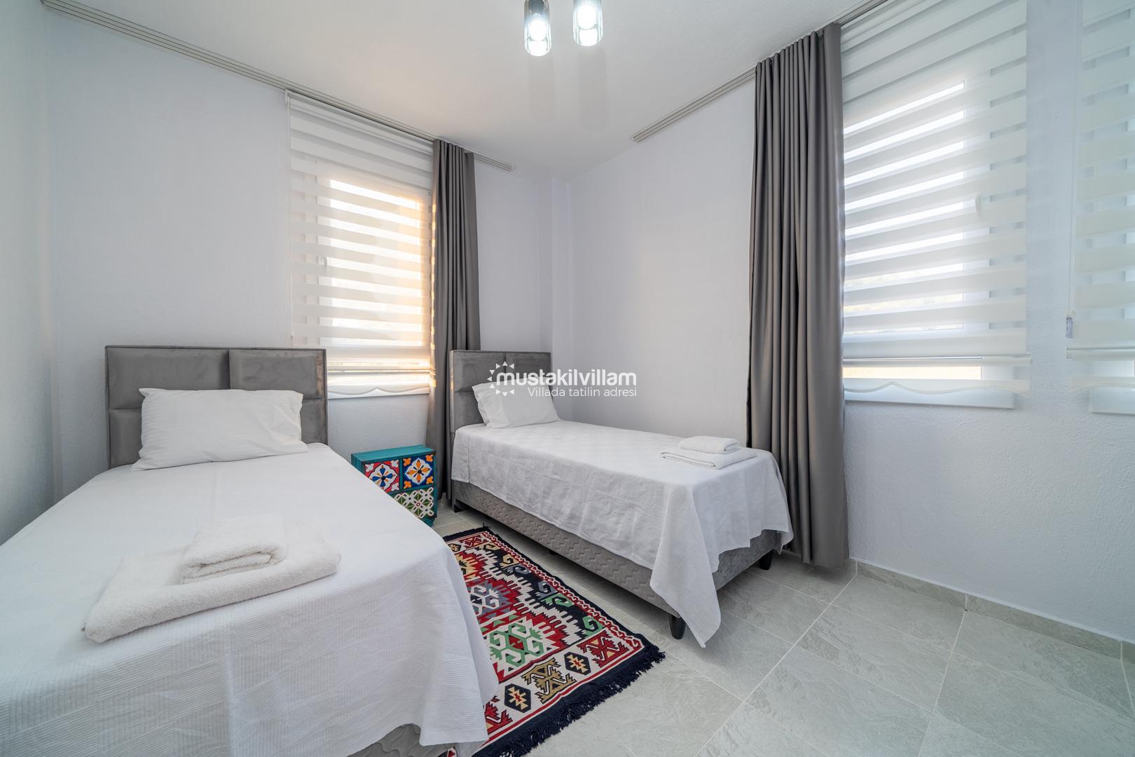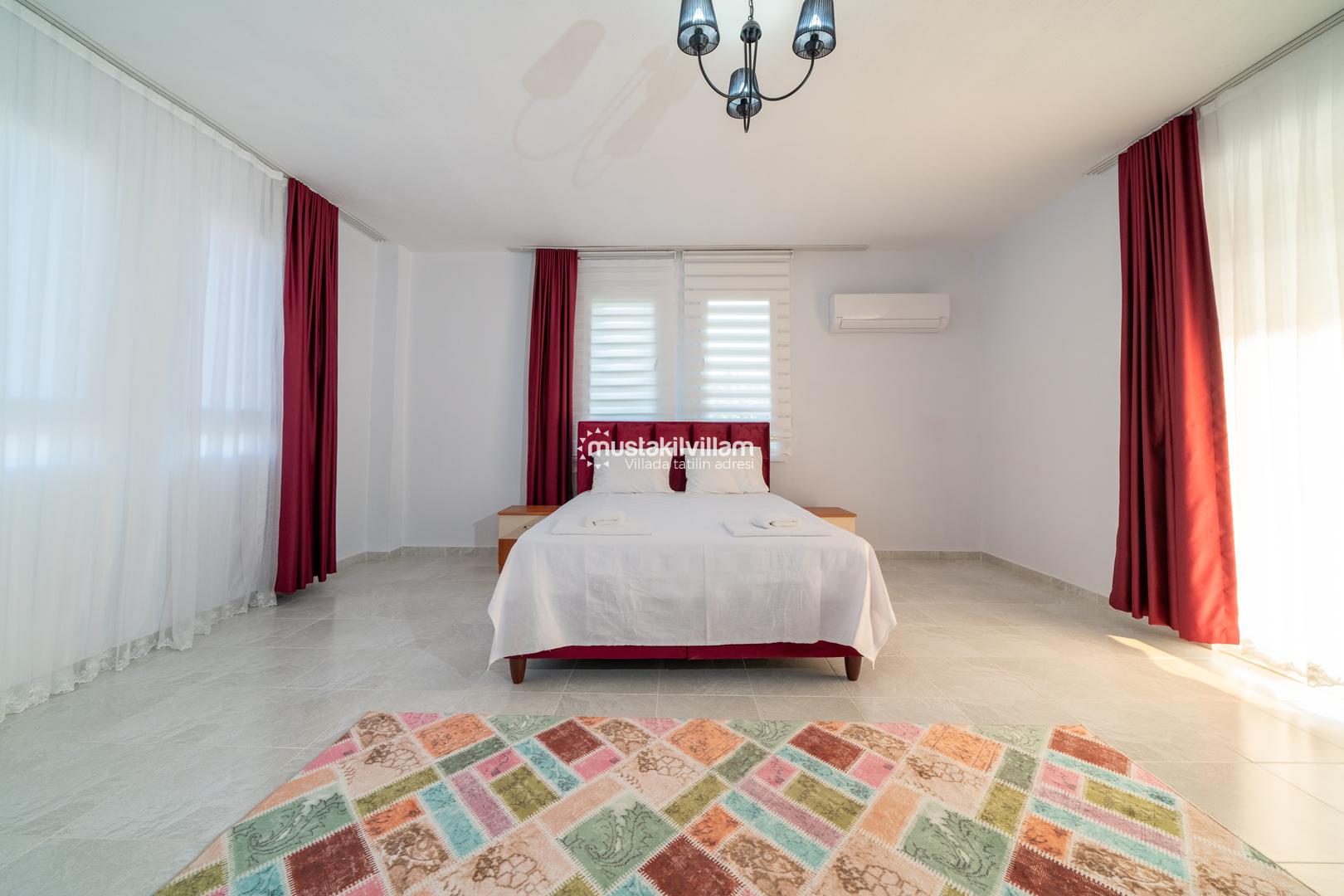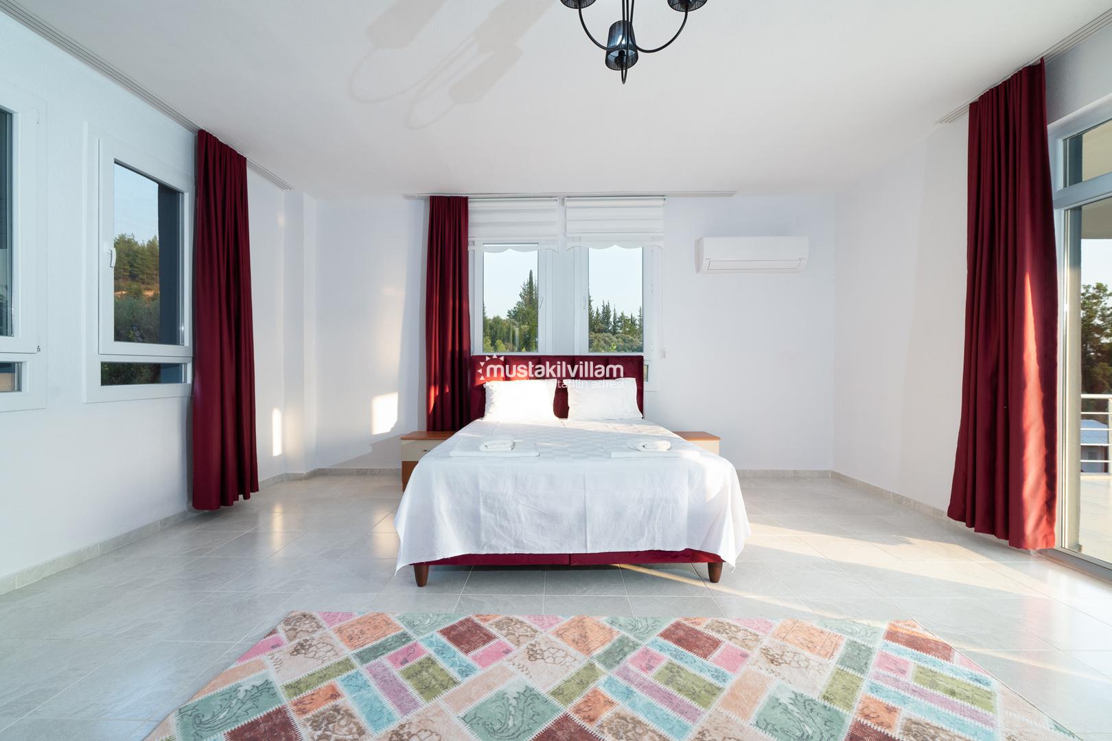 Villa Busem’de yer alan üç yatak odası da misafirlerin konforu düşünülerek düzenlenmiştir. Tüm odalarda klima bulunmakta olup yaz aylarında serin bir uyku ortamı sağlar.