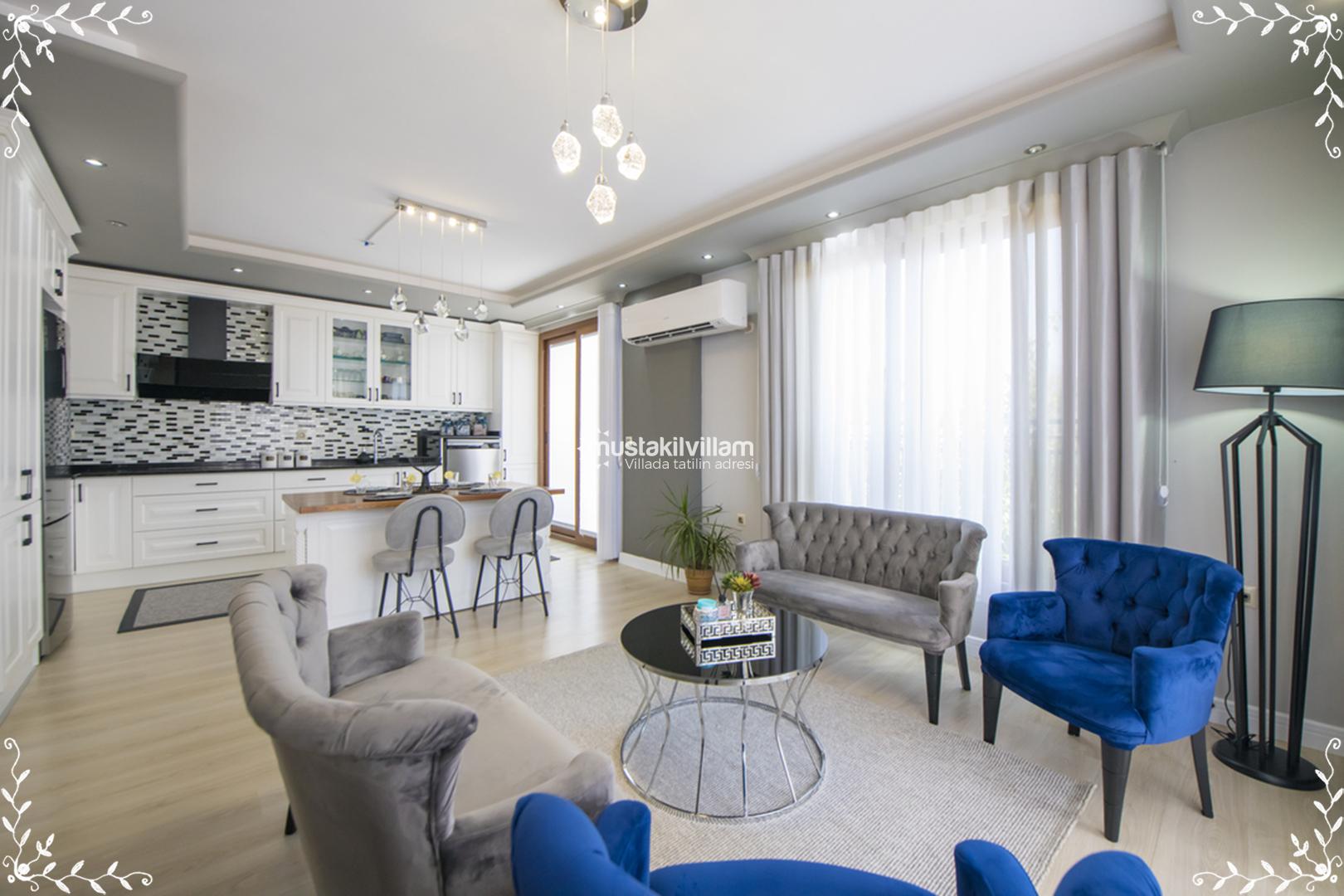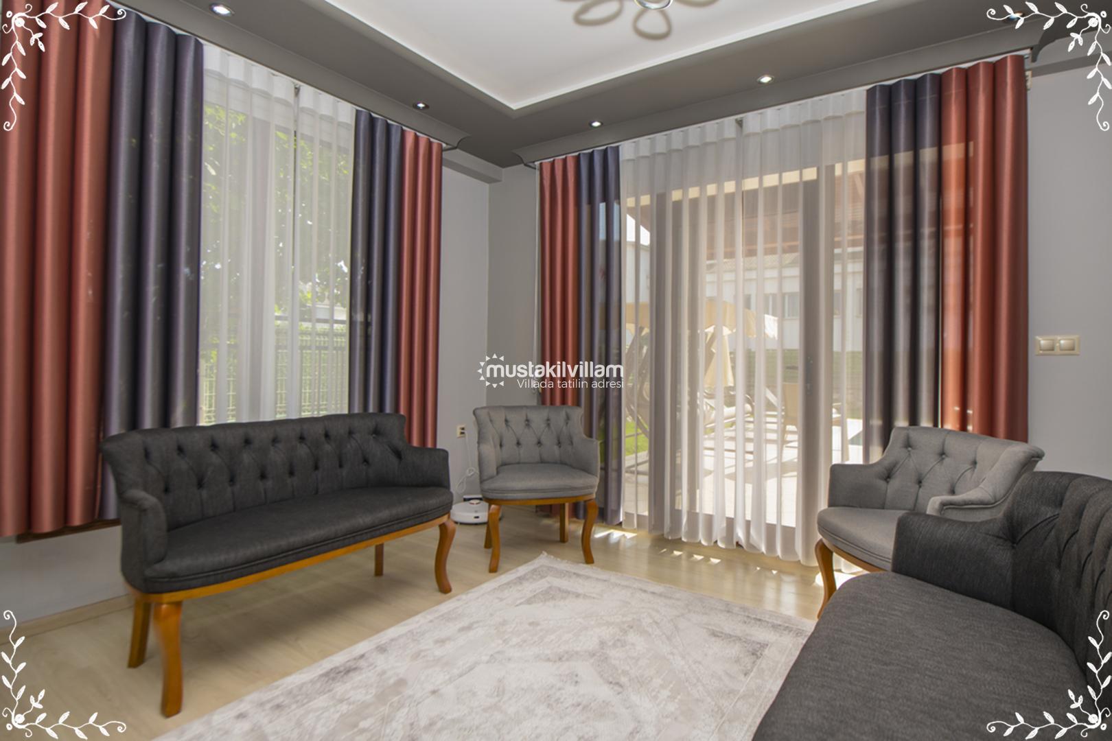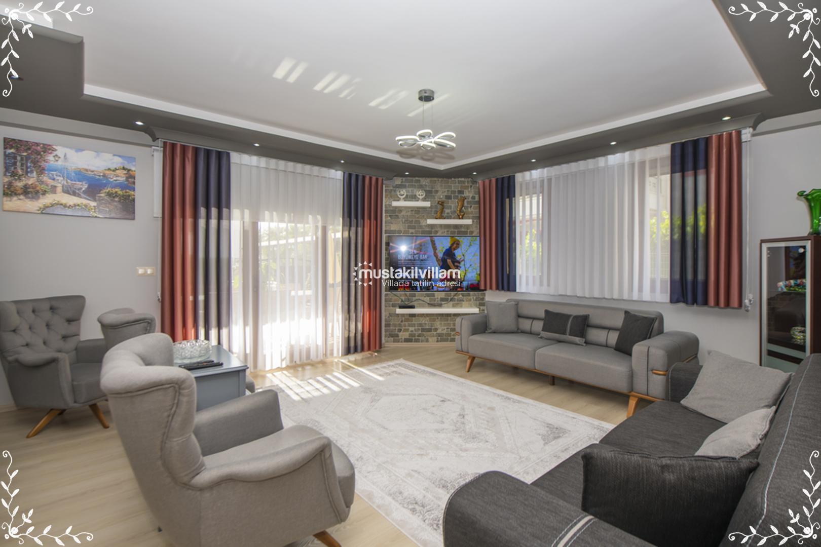 Villa Gold, toplam 4 yatak odası ve 4 banyo ile 8 kişiye kadar konaklama kapasitesi sunar. Villanın iç düzeni, ferah yaşam alanları ve modern dekorasyonuyla öne çıkar. Salon bölümünde konforlu oturma grubu, klima ve televizyon gibi donanımlar yer alır; salon aynı zamanda özel havuz terasına doğrudan çıkış sağlar.