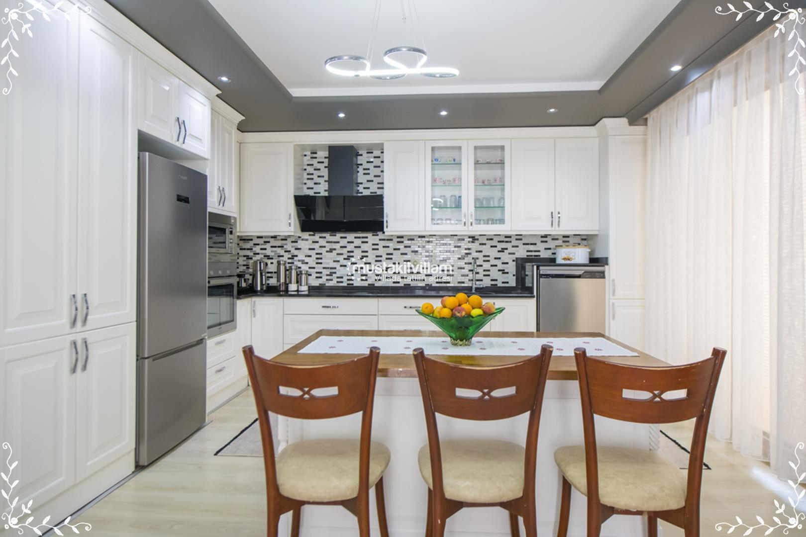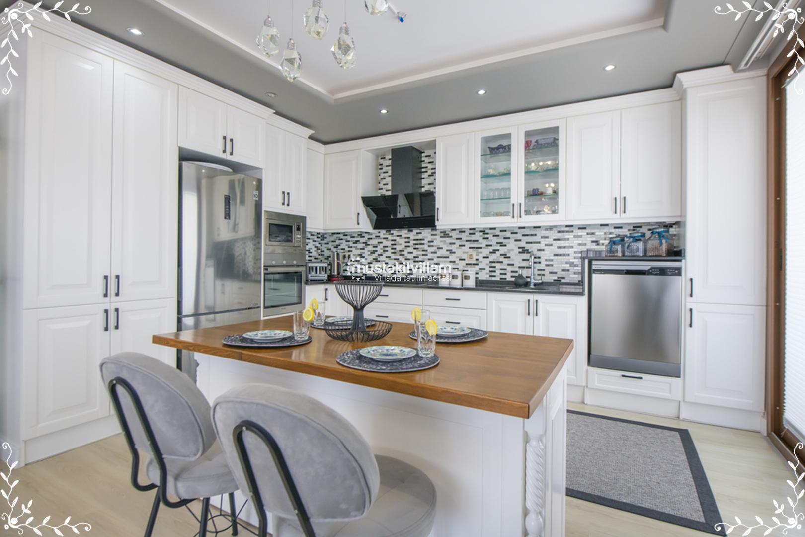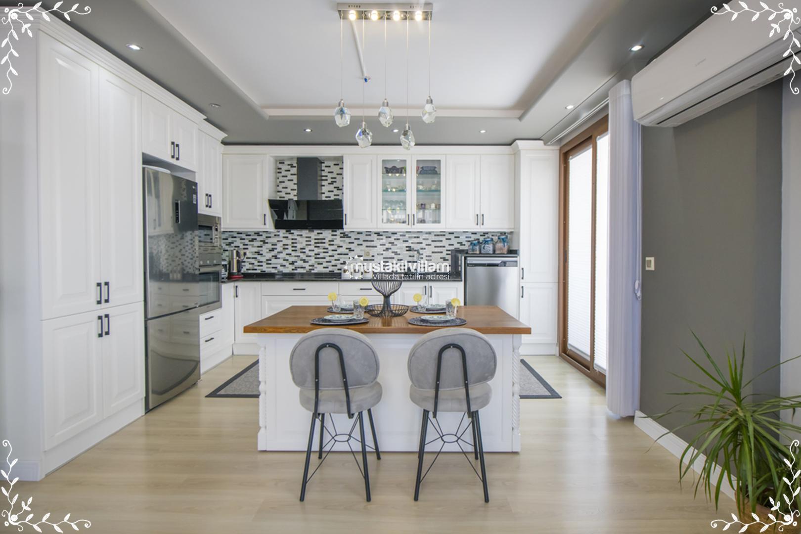 Villa Gold’un mutfağı, tatil boyunca evinizdeymiş gibi yemek hazırlayabileceğiniz şekilde tam donanımlıdır. Amerikan mutfak konsepti ile tasarlanan alanda şu donanımlar bulunur: