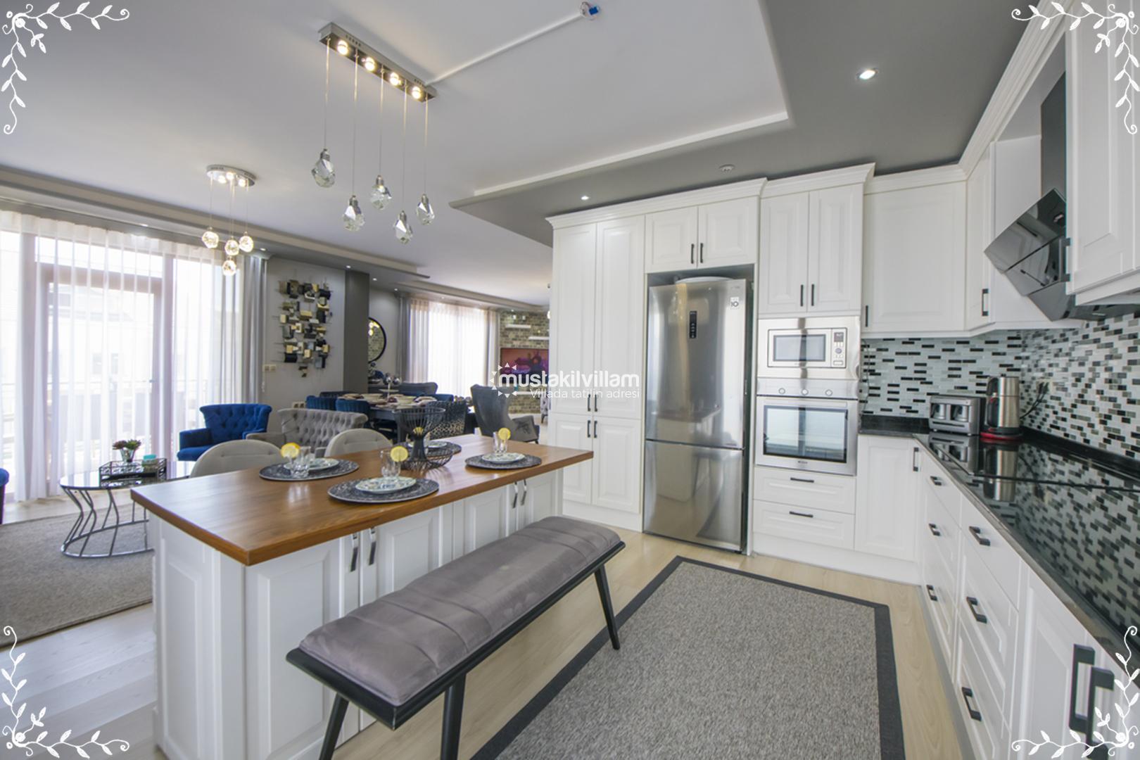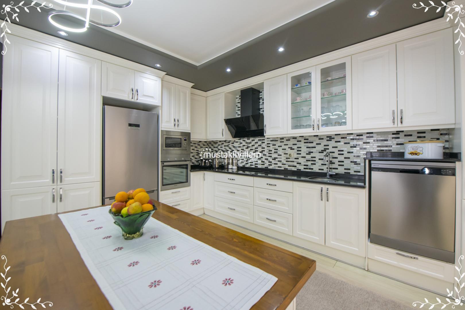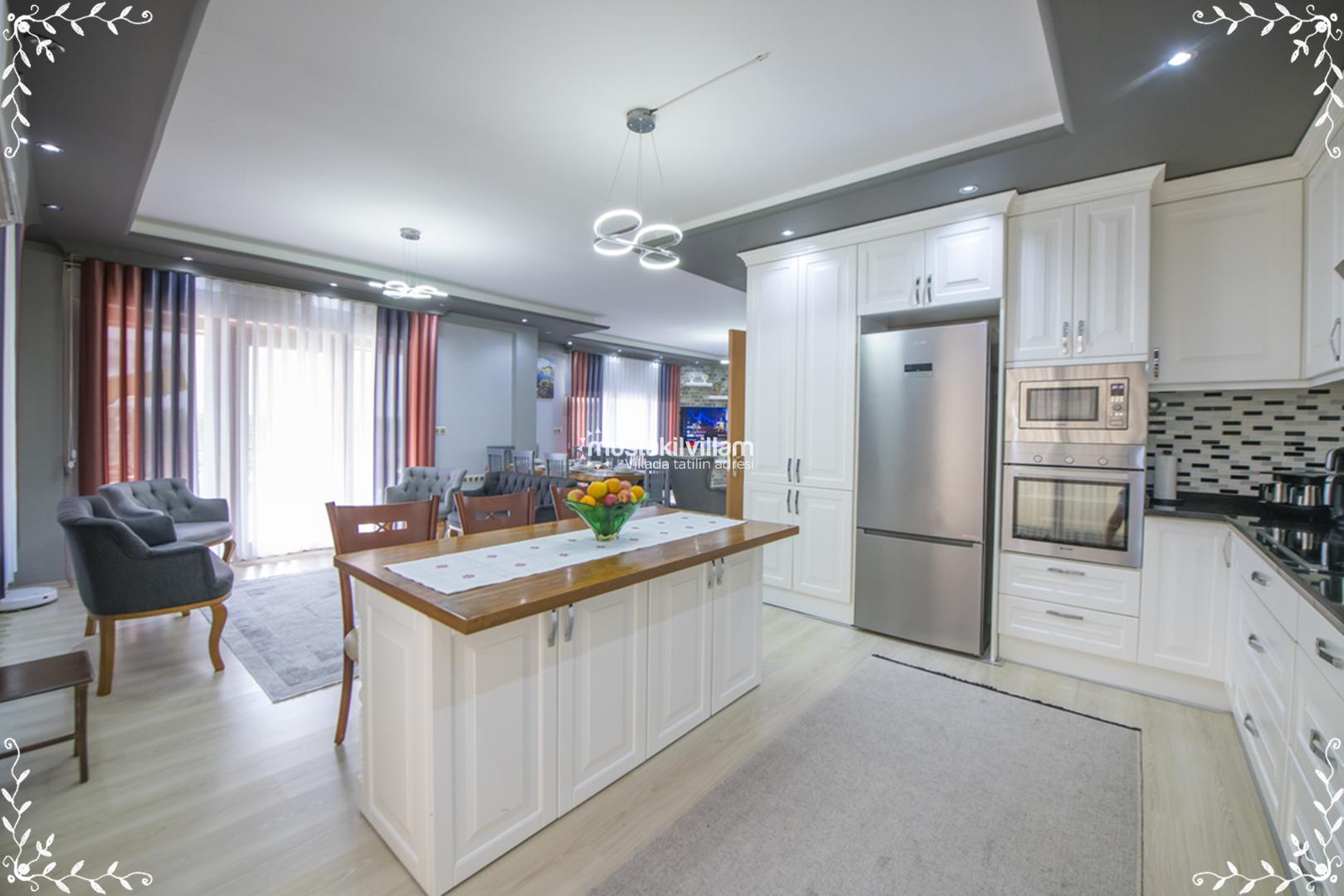 Villa Gold’un mutfağı, tatil boyunca evinizdeymiş gibi yemek hazırlayabileceğiniz şekilde tam donanımlıdır. Amerikan mutfak konsepti ile tasarlanan alanda şu donanımlar bulunur: