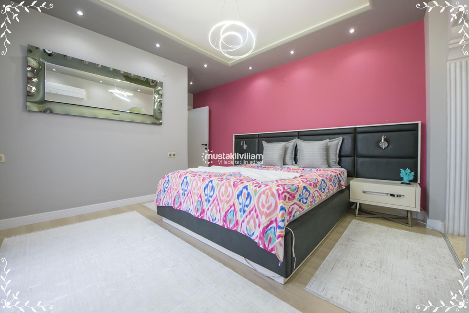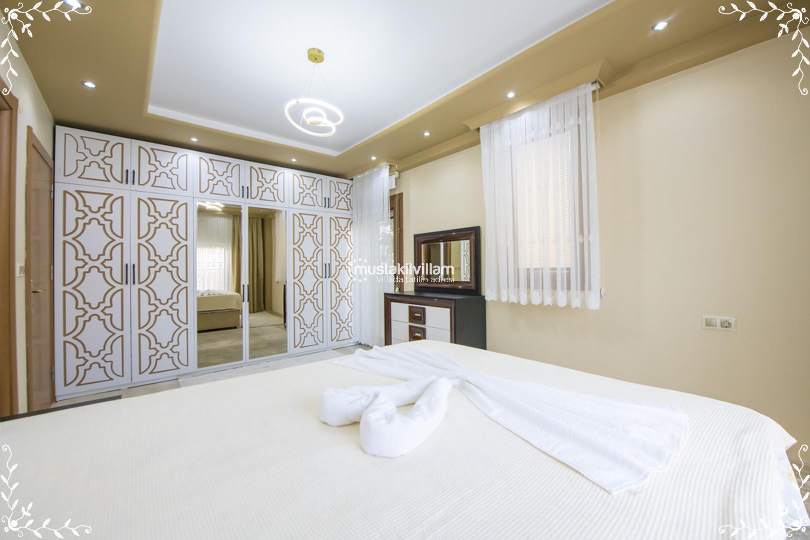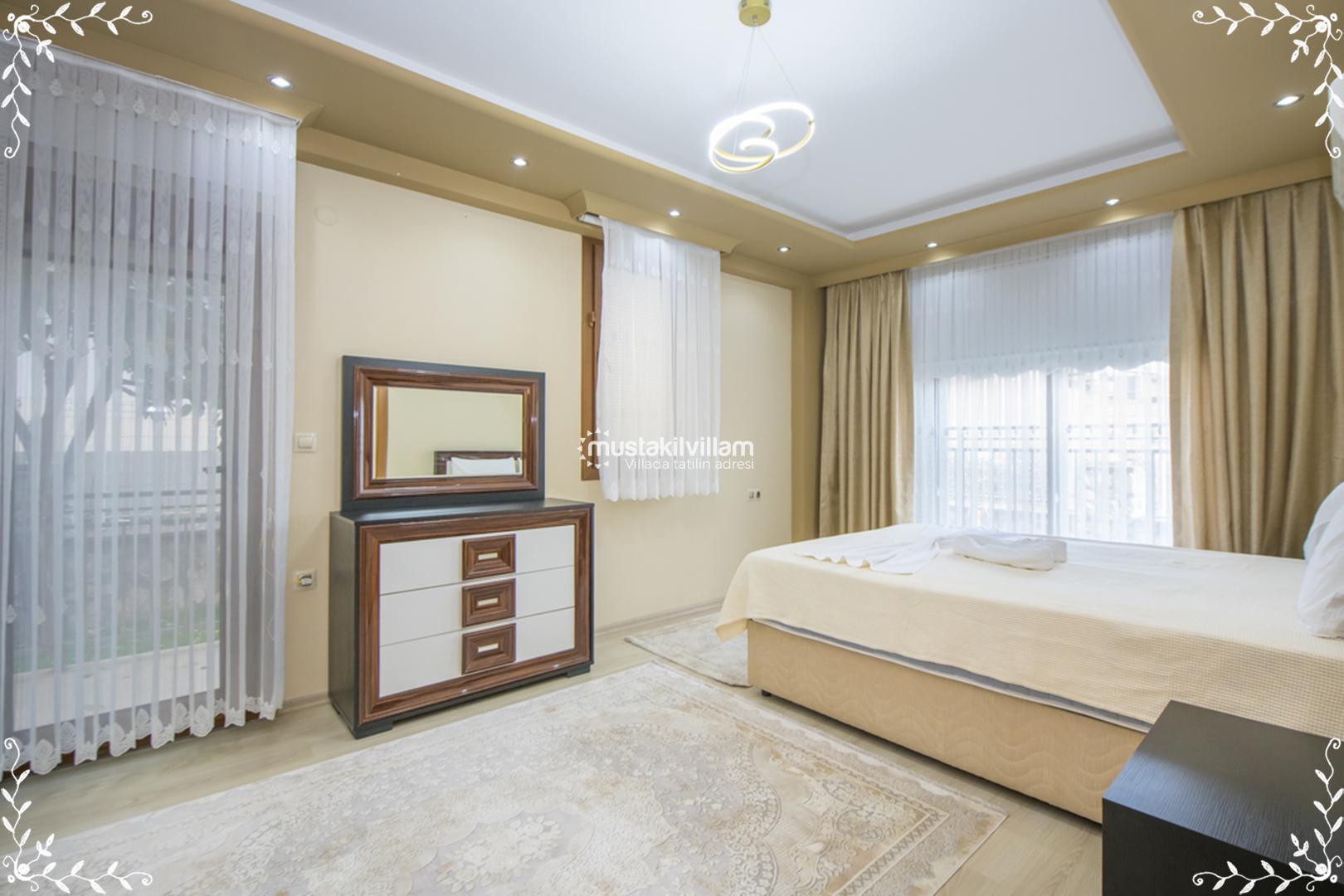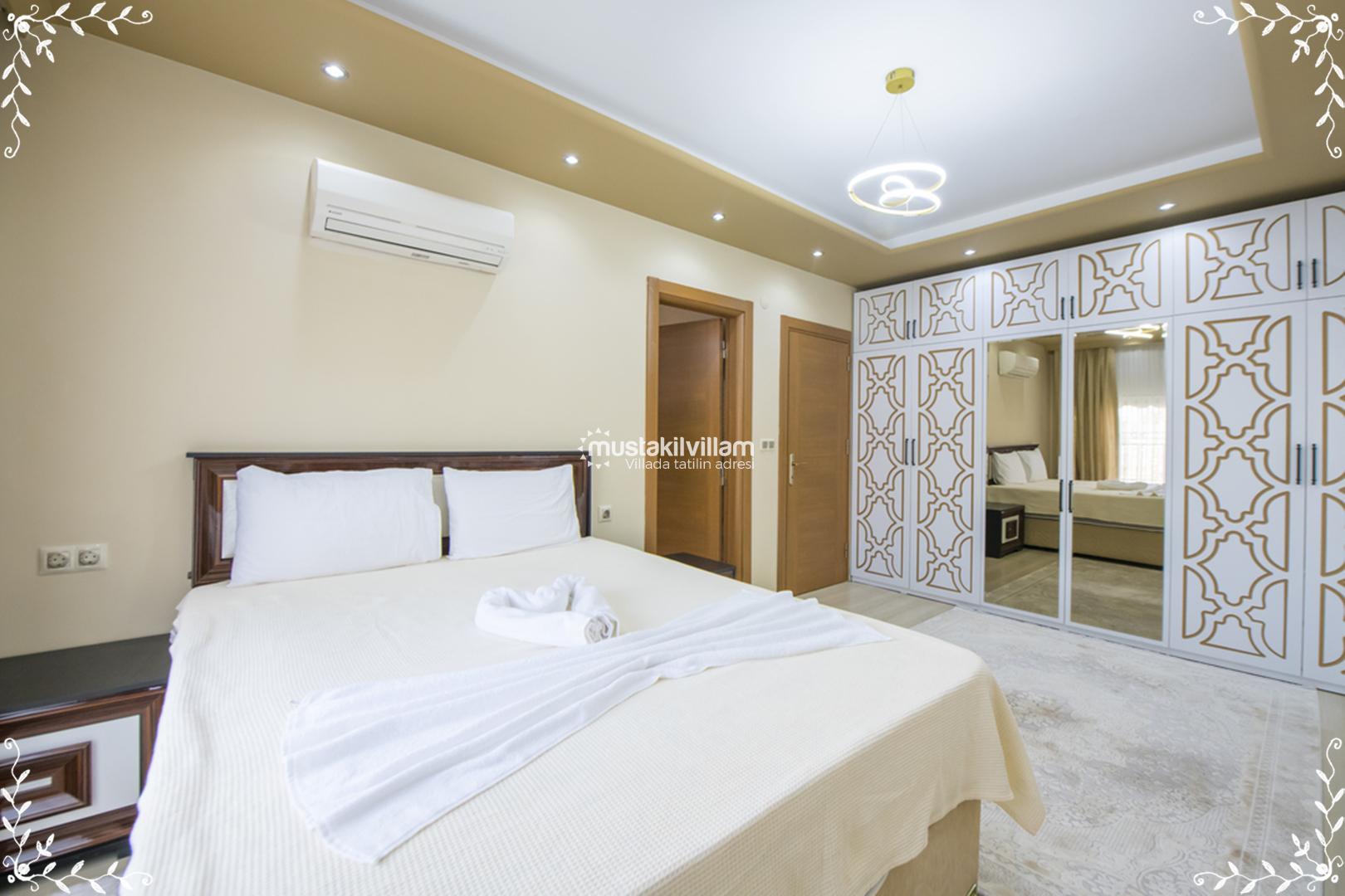 Villa Gold’un 4 yatak odası, konfor ve mahremiyet odaklı olarak tasarlanmıştır. Her odada klima, elbise dolabı ve özel banyo – WC gibi donanımlar bulunur. Odalar şöyle planlanmıştır: