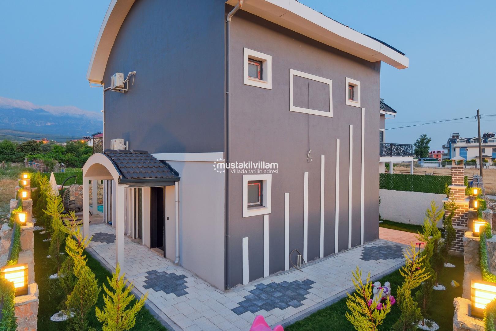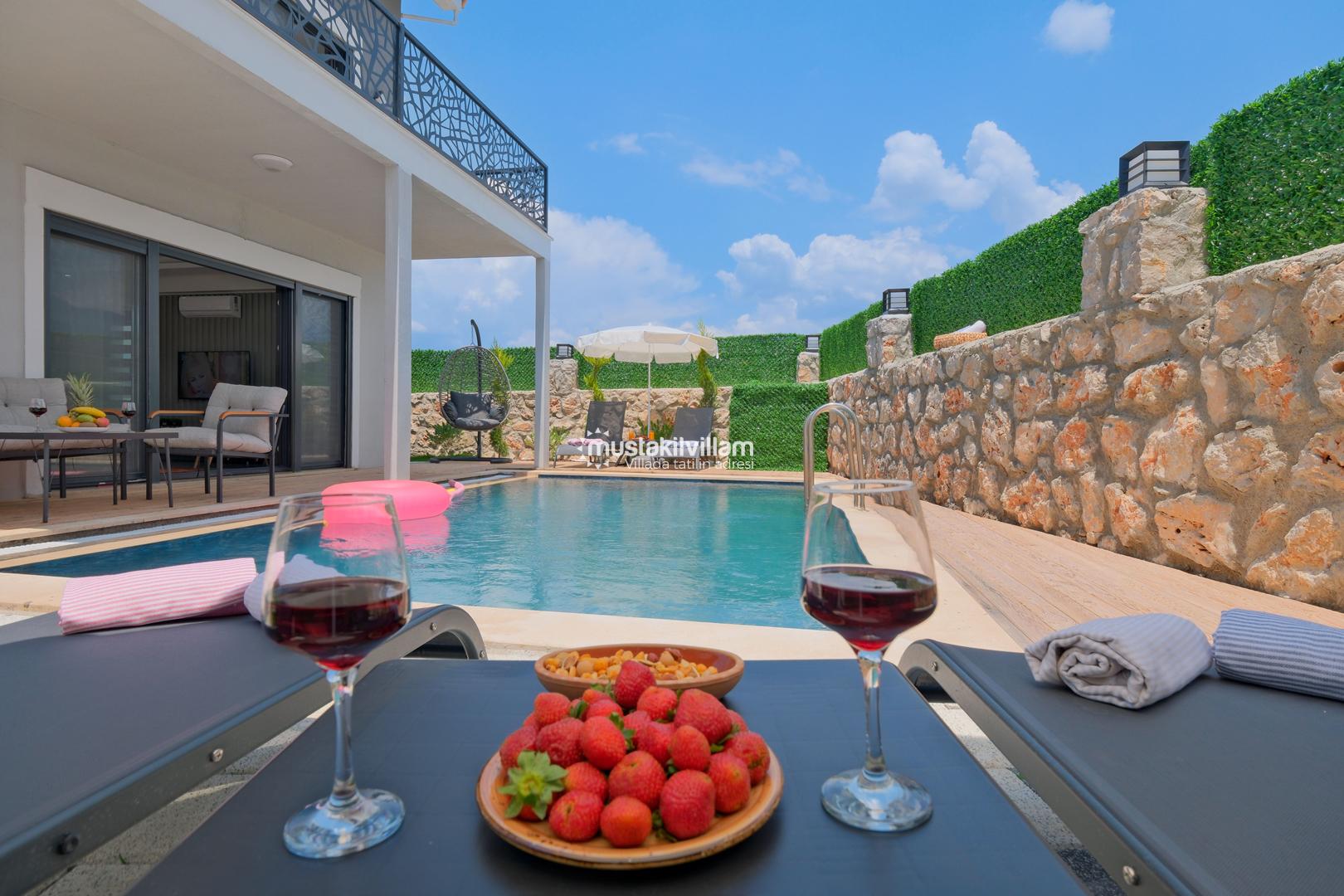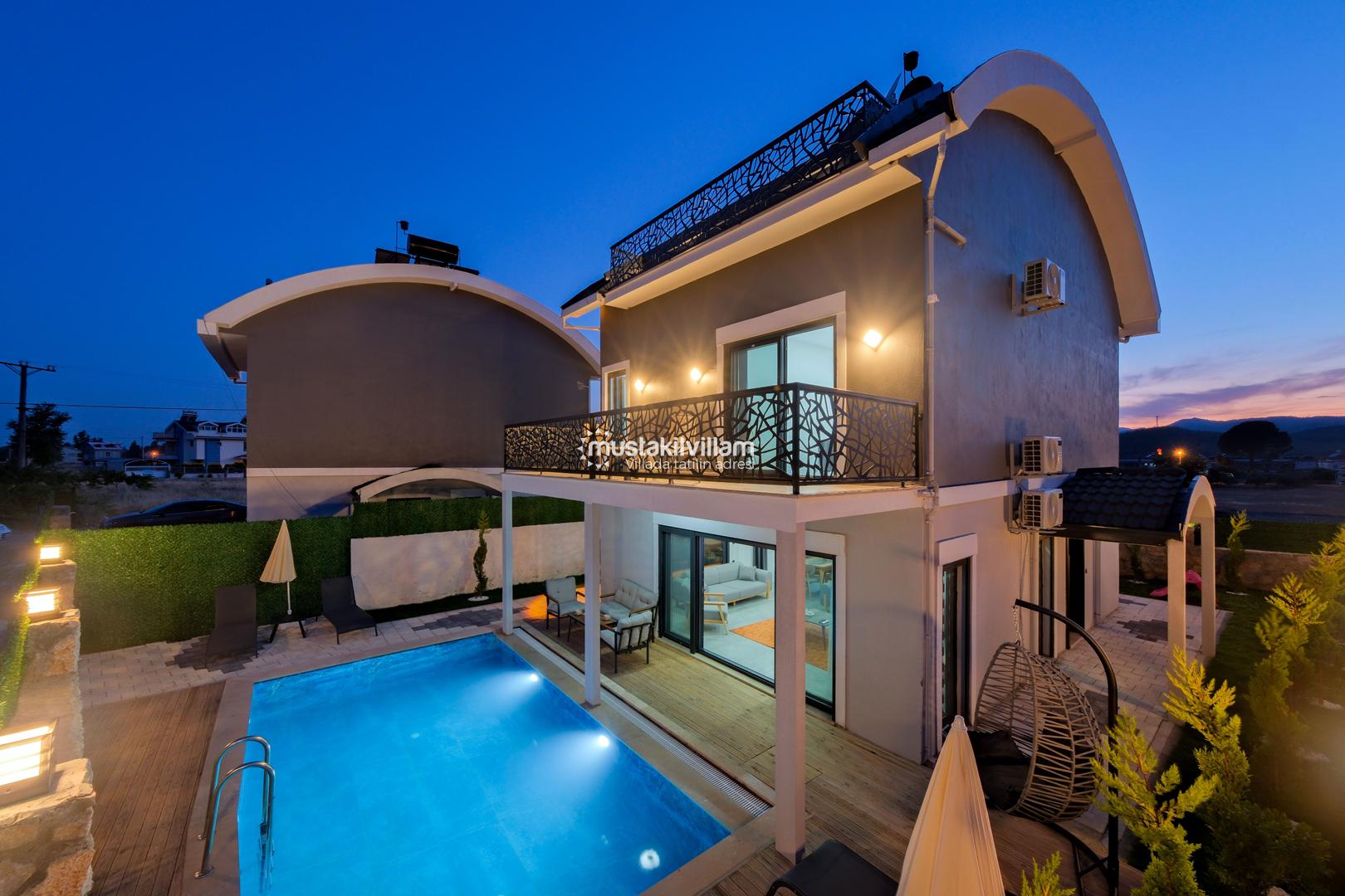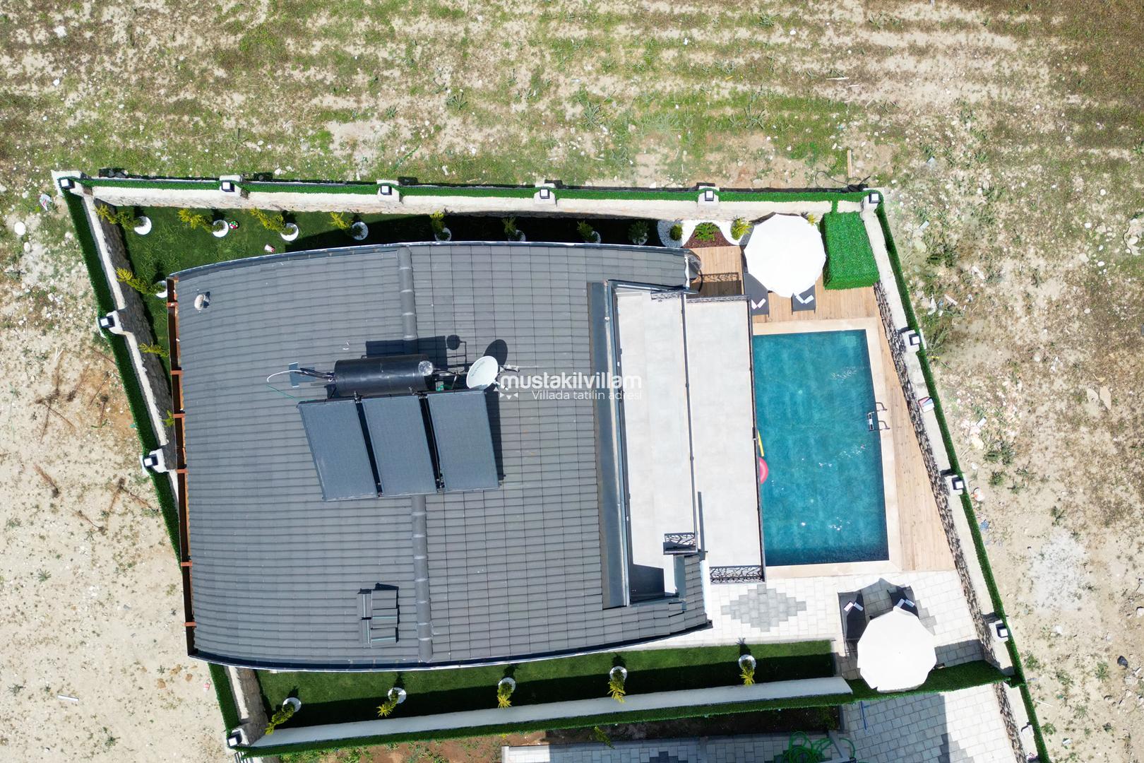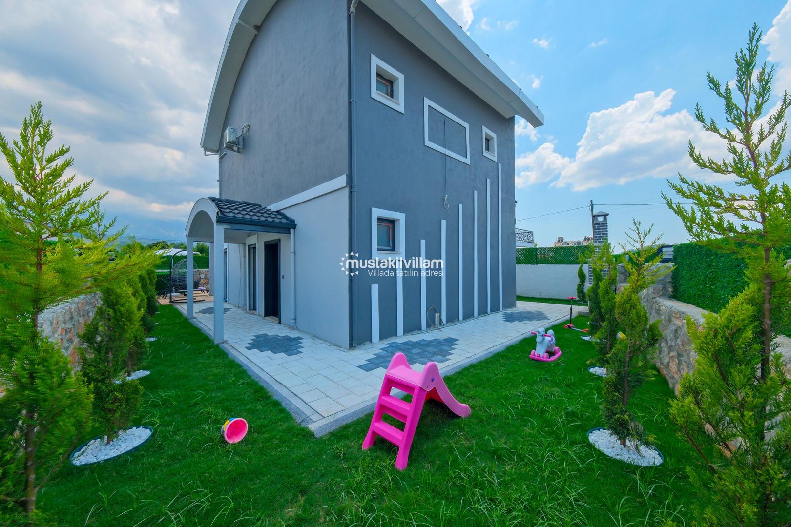 Villamızın dış alanında özel yüzme havuzu ve jakuzi yer almakta olup, havuz çevresinde şezlong alanı mevcuttur. Geniş bahçesi sayesinde hem dinlenebilir hem de sevdiklerinizle keyifli vakit geçirebilirsiniz. Ayrıca çocuklu aileler için bahçe alanında scooter ve kaydırak gibi oyun ekipmanları da bulunmaktadır.