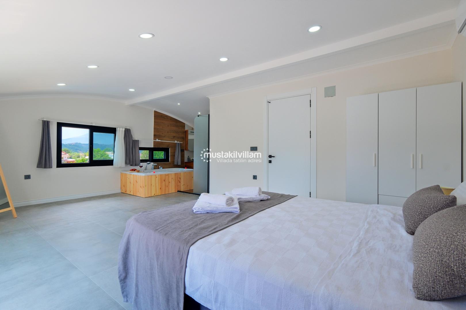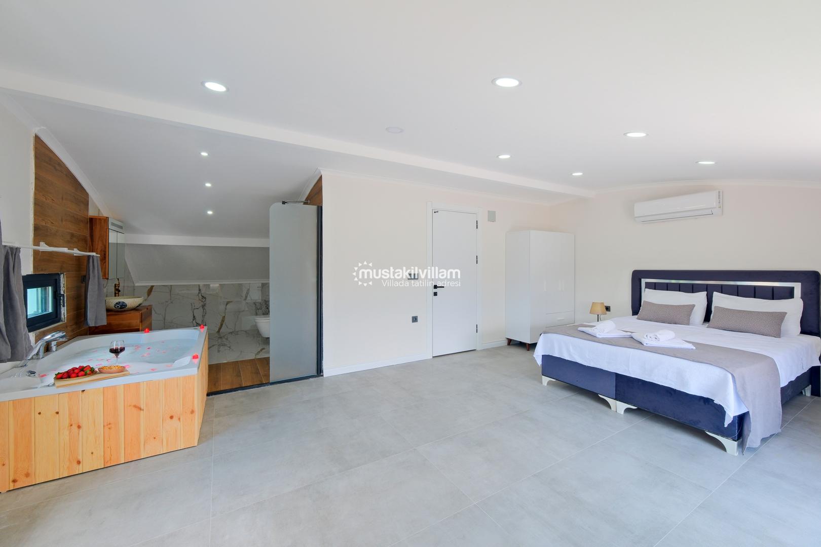 1. Yatak Odası 1 Çift Kişilik Yatak + Komodin + Elbise Dolabı + Ebeveyn Banyo + klima + Jakuzi