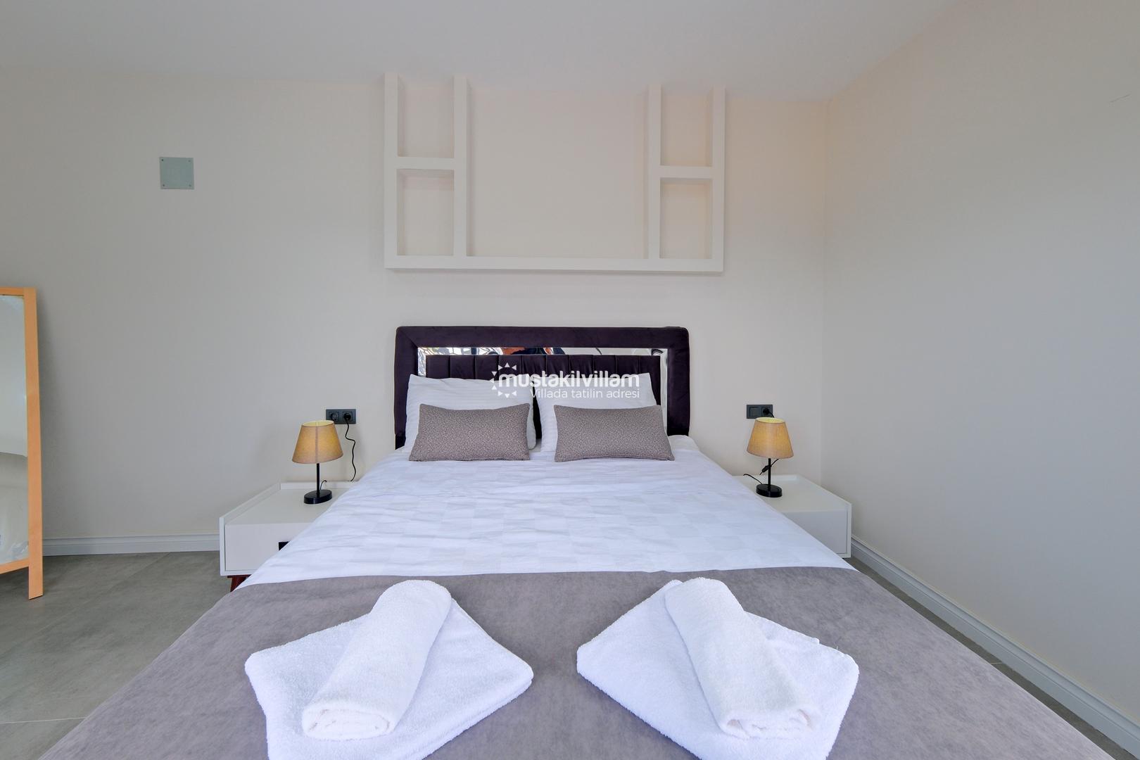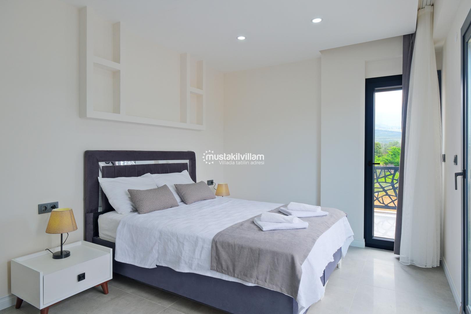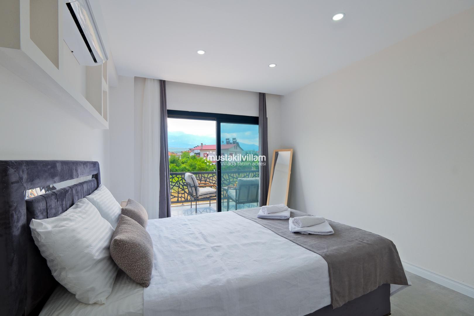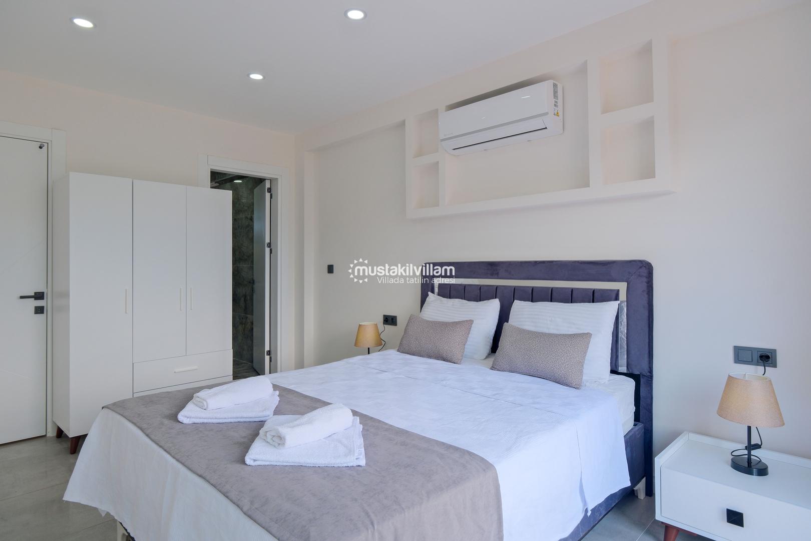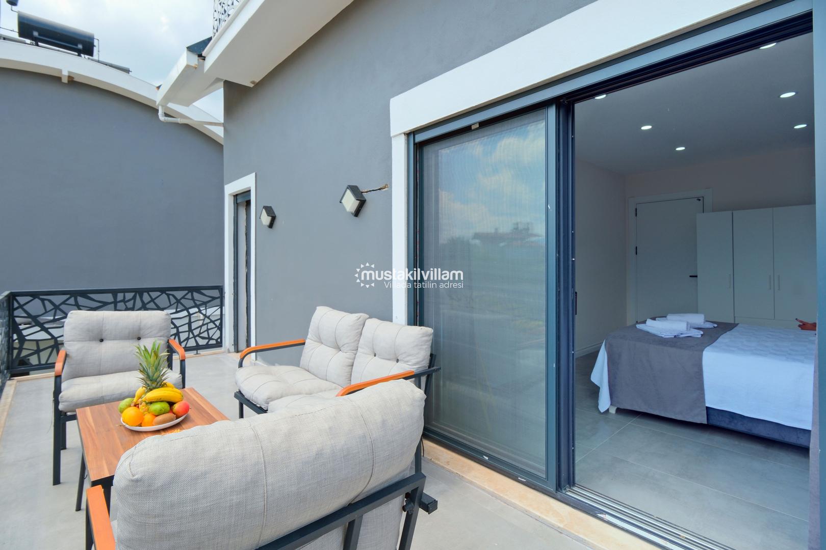 Toplam 3 yatak odası ve 3 banyosu bulunan villamızda, tüm yatak odaları ebeveyn banyolu ve balkonludur. Bu sayede misafirlerimize konforlu ve mahrem bir konaklama alanı sağlanmaktadır. Modern ve şık mobilyalarla dekore edilmiş salon bölümünde rahat bir oturma grubu, klima ve televizyon yer almaktadır. Tam donanımlı açık mutfakta buzdolabı, ankastre ocak ve fırın, bulaşık makinesi ve ihtiyaç duyabileceğiniz tüm mutfak ekipmanları bulunmaktadır.